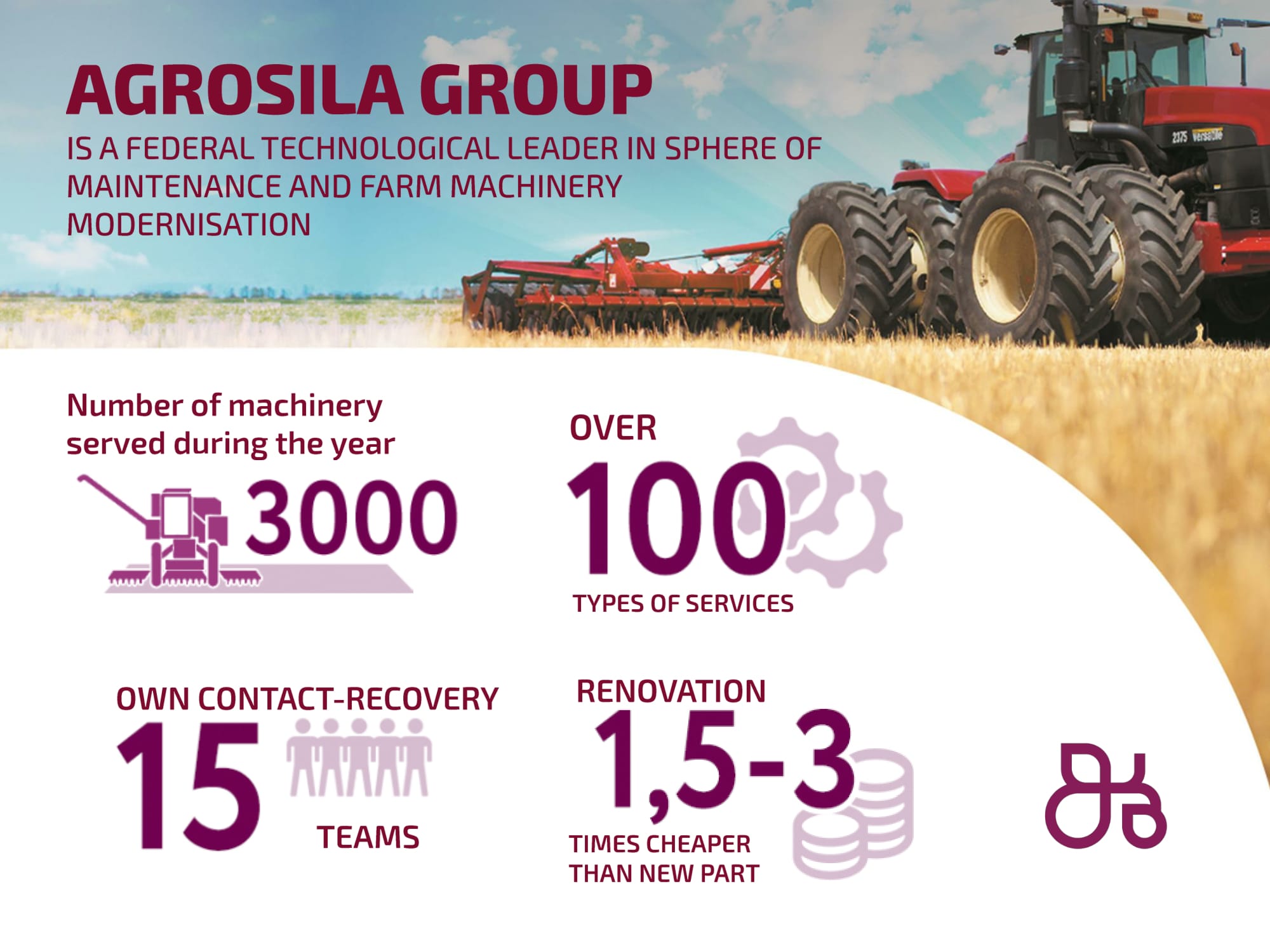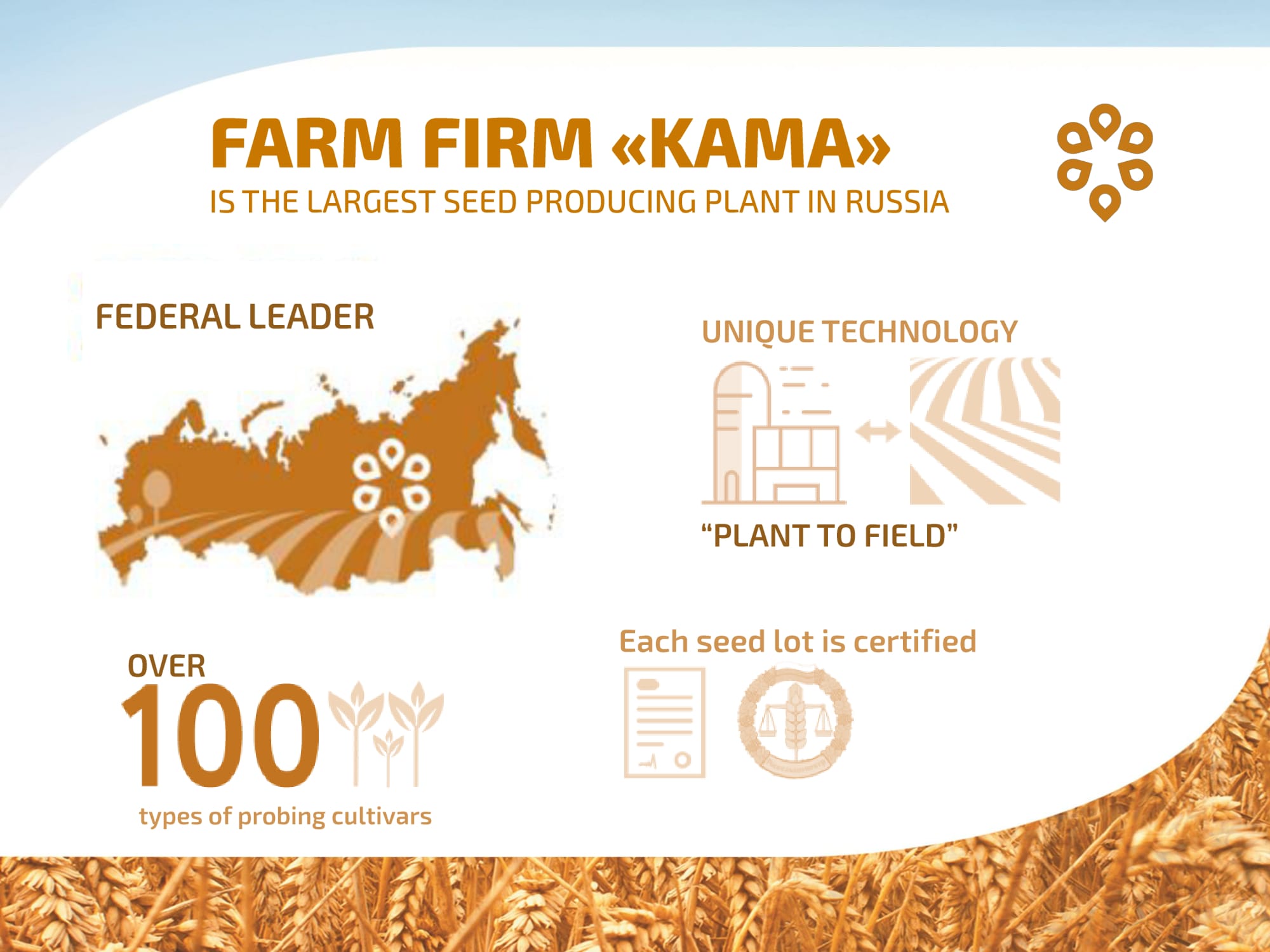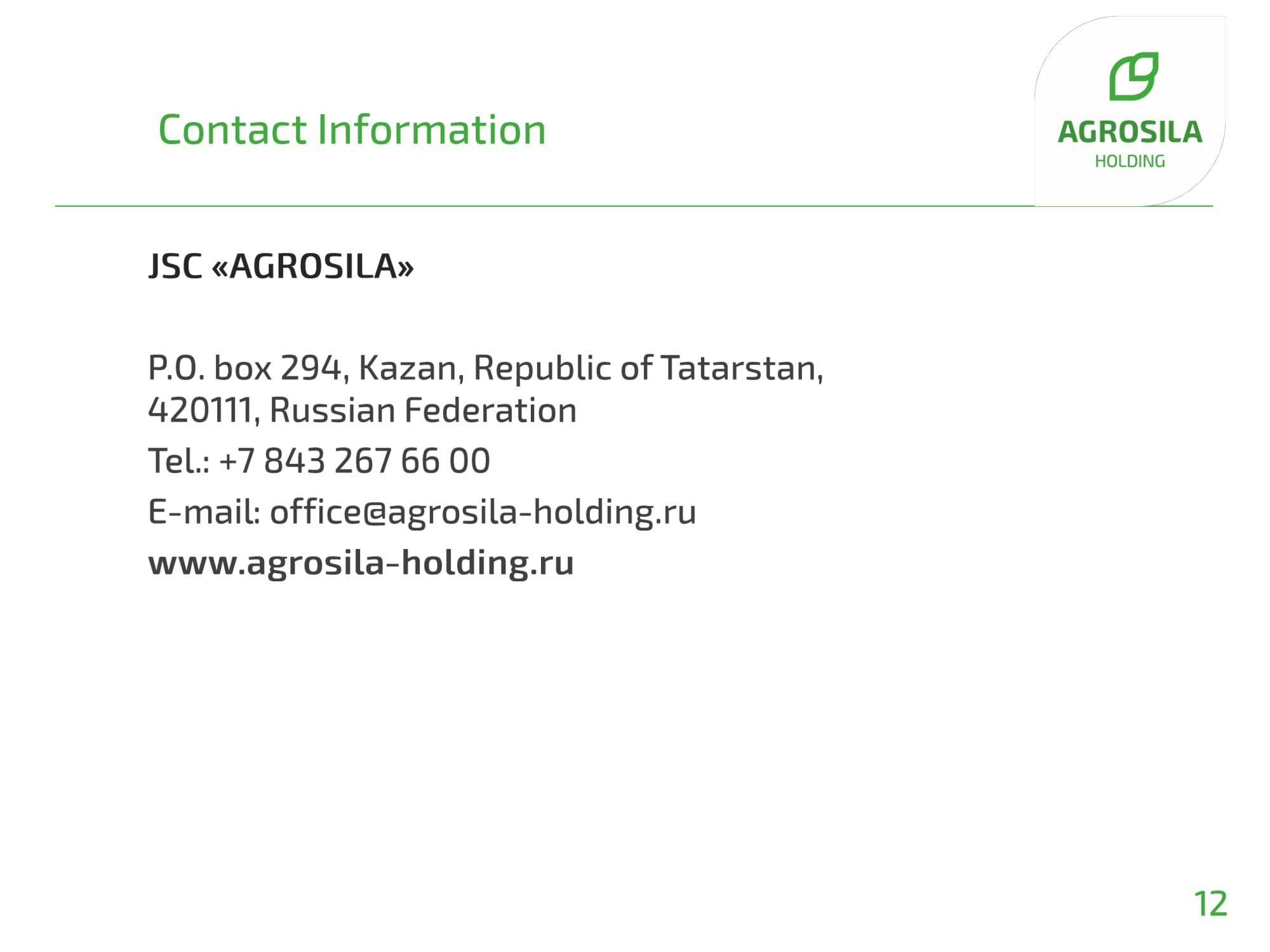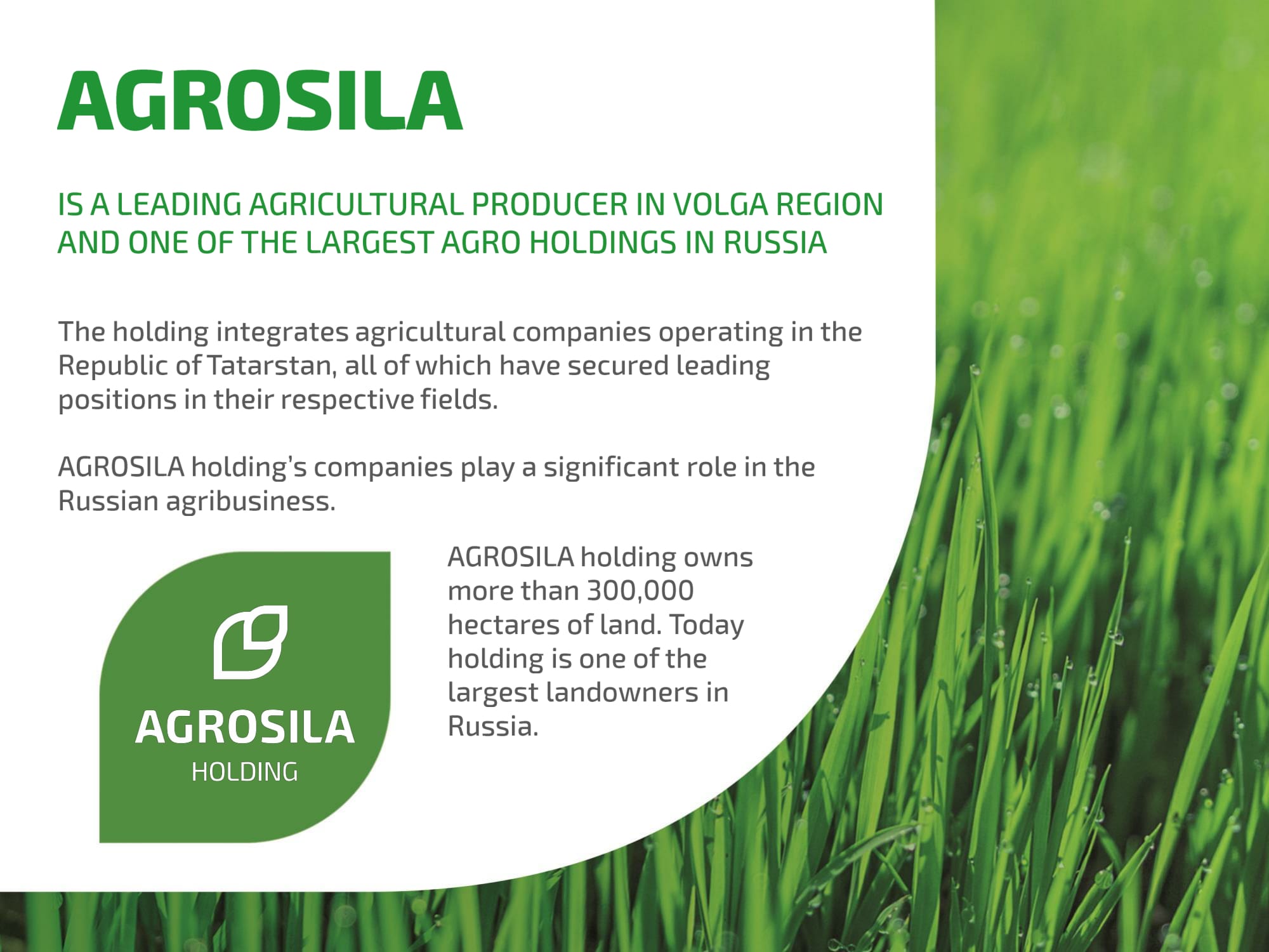 AGROSILA IS LEADING AGRICULTURAL PRODUCER IN THE VOLGA REGION, ONE OF THE LARGEST AGROHOLDINGS OF RUSSIA The holding integrates 24 agricultural companies operating in the Republic of Tatarstan, all of which have secured leading positions in their respective fields. AGROSILA Holding owns more than 324,000 hectares in the Tukaevsky, Aznakaevsky, Zainsky, Sarmanovsky, Aktanyshsky, Nizhnekamsky, and Muslyumovsky regions of the Republic of Tatarstan. Today the agro holding is one of the largest landowners in Russia, and has plans to become one of the Top 10 largest Russian agricultural producers.