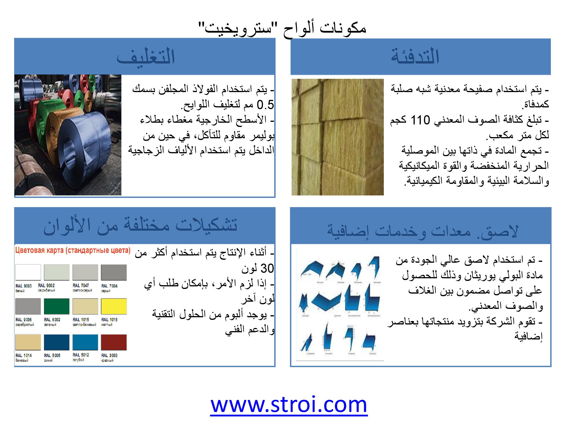 تنتج شركة"سترويكوم" ألواح تسقيف ثلاثية الطوابق وشطيرة لوحة الجدار بالمواصفات التالي: من 50 إلى 250 ملم (سماكة)، من 1000 إلى 12000 ملم (الطول) ، 1200 مم (العرض). أنشىء في عام 2014 خط إنتاج إضافي لصناعة ألواح جدارية بعرض 1000 إلى 1190 ملم وألواح التسقيف بعرض 1000 ملليمتر مع خمسة تموجات شبه منحرفة. اليوم، تقدم الشركة مجموعة واسعة من المنتجات، من ضمنها ألوح دافئة على شكل البوليسترين الموسع، وكذلك نماذج غير قابلة للاشتعال عازلة للحرارة المصنوعة من الصوف المعدني على أساس الصخور البازلتية.
