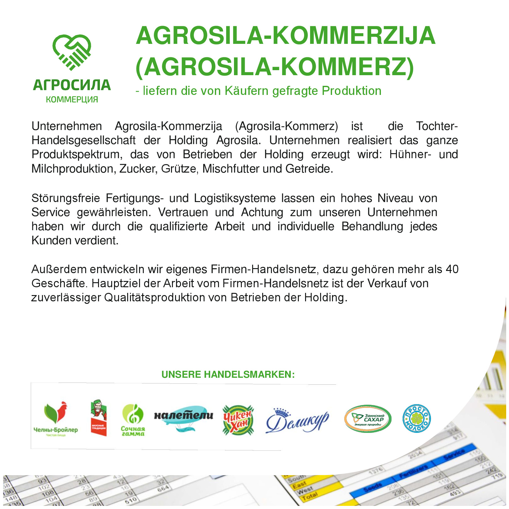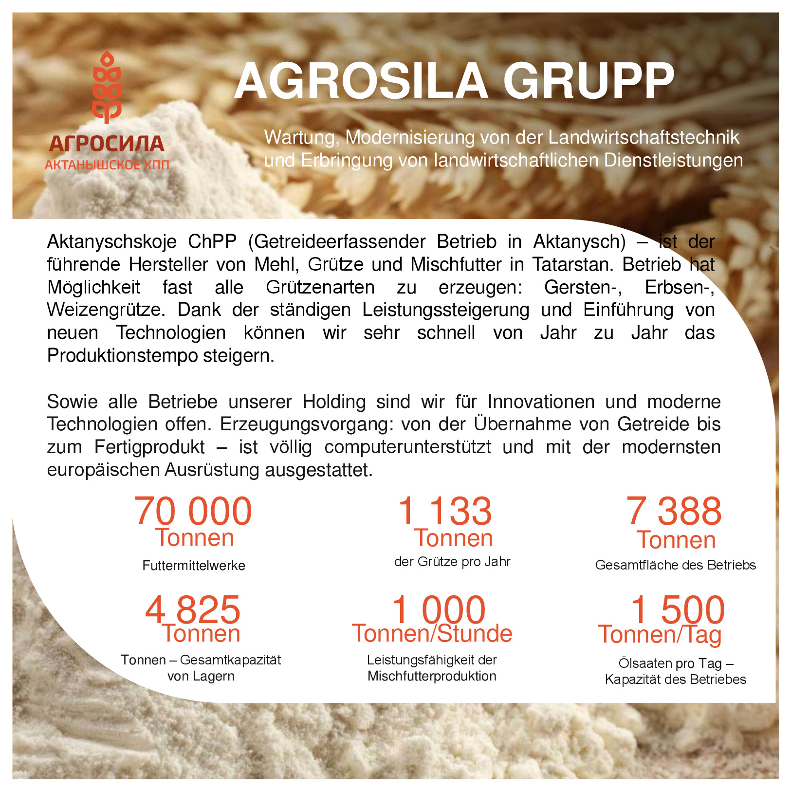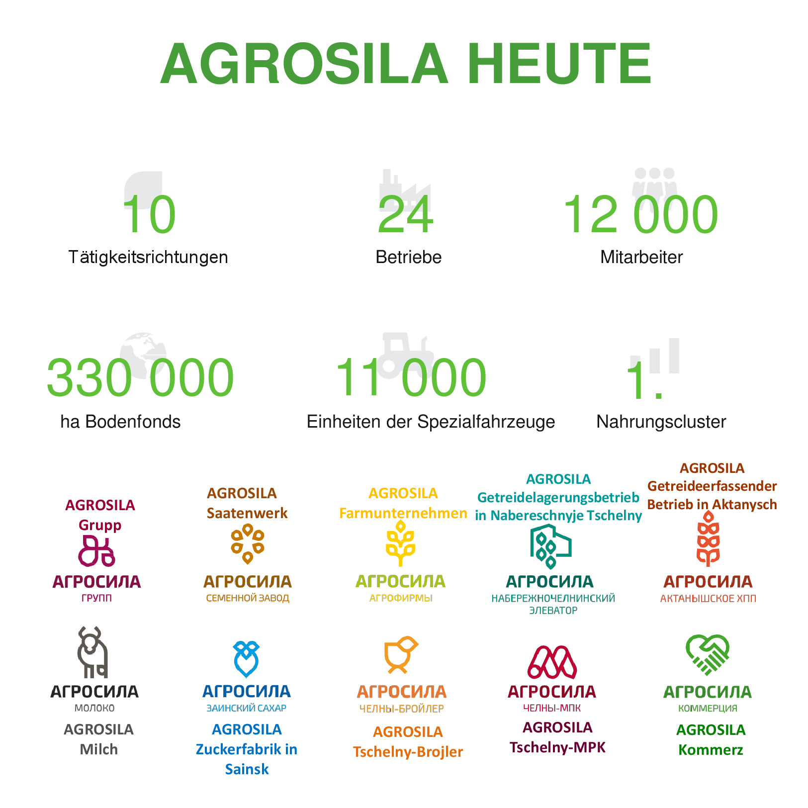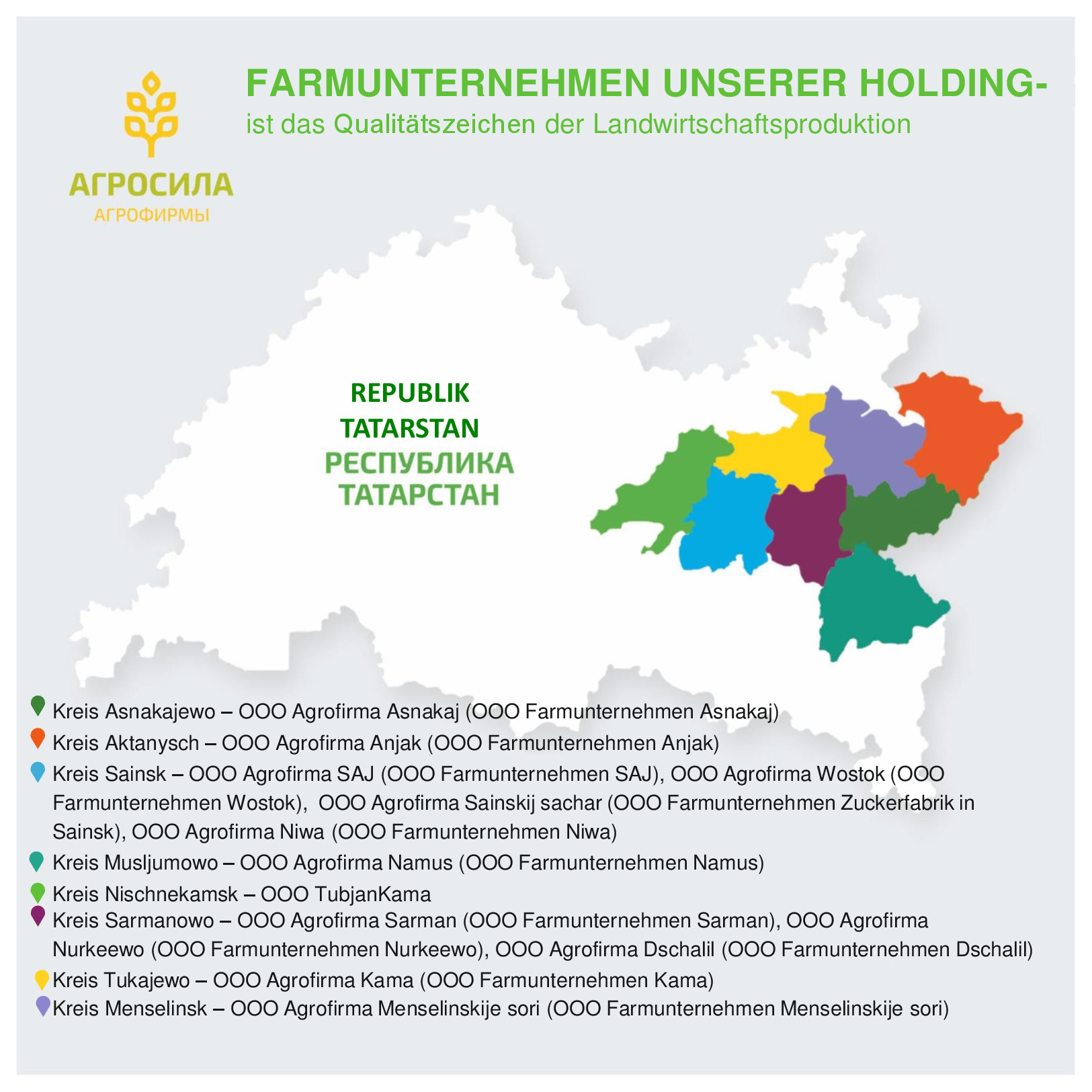 AGROSILA IST DER FÜHRENDE LANDWIRT IM WOLGAGEBIET, EINER DER GRÖSSTEN AGROHOLDINGGESELLSCHAFTEN RUSSLANDS. Die vertikal integrierte Holding schließt die Unternehmen für Anbau, Aufnahme, Lagerung und Behandlung der Getreide- und Industriekulturen, für die Herstellung der Tier- und Geflügelprodukte, die Zuckerproduktion, sowie für den Absatz der Fertigproduktion und den Service der Landwirtschaftstechnik ein. Zur Holdingstruktur gehören 24 Landwirtschaftsunternehmen, die auf dem Territorium der Republik Tatarstan gelagert sind. Die Unternehmen der Holdinggesellschaft belegen die führenden Positionen in jedem Segment ihrer Tätigkeit. Der Umfang der Agrarbank der Holdinggesellschaft AGROSILA übersteigt 324 Tausend Hektare in Tukajewski, Asnakajewskij, Sainskij, Sarmanowskij, Aktanyschskij, Nizhnekamskij und Musljumowskij Bezirke der Republik Tatarstan. Zum heutigen Tag gehört die Agroholdinggesellschaft zu den größten Grundbesitzern Russlands. Auf dem Plan des Unternehmens steht das Ziel: zu den zehn Besten größten russischen Agrarerzeugern zu gehören.