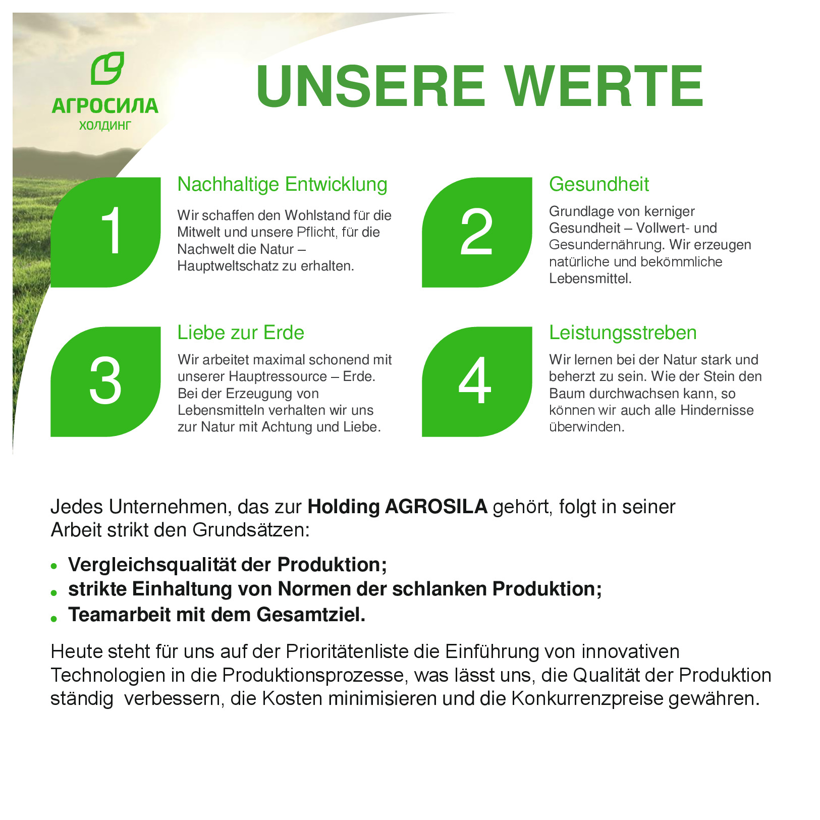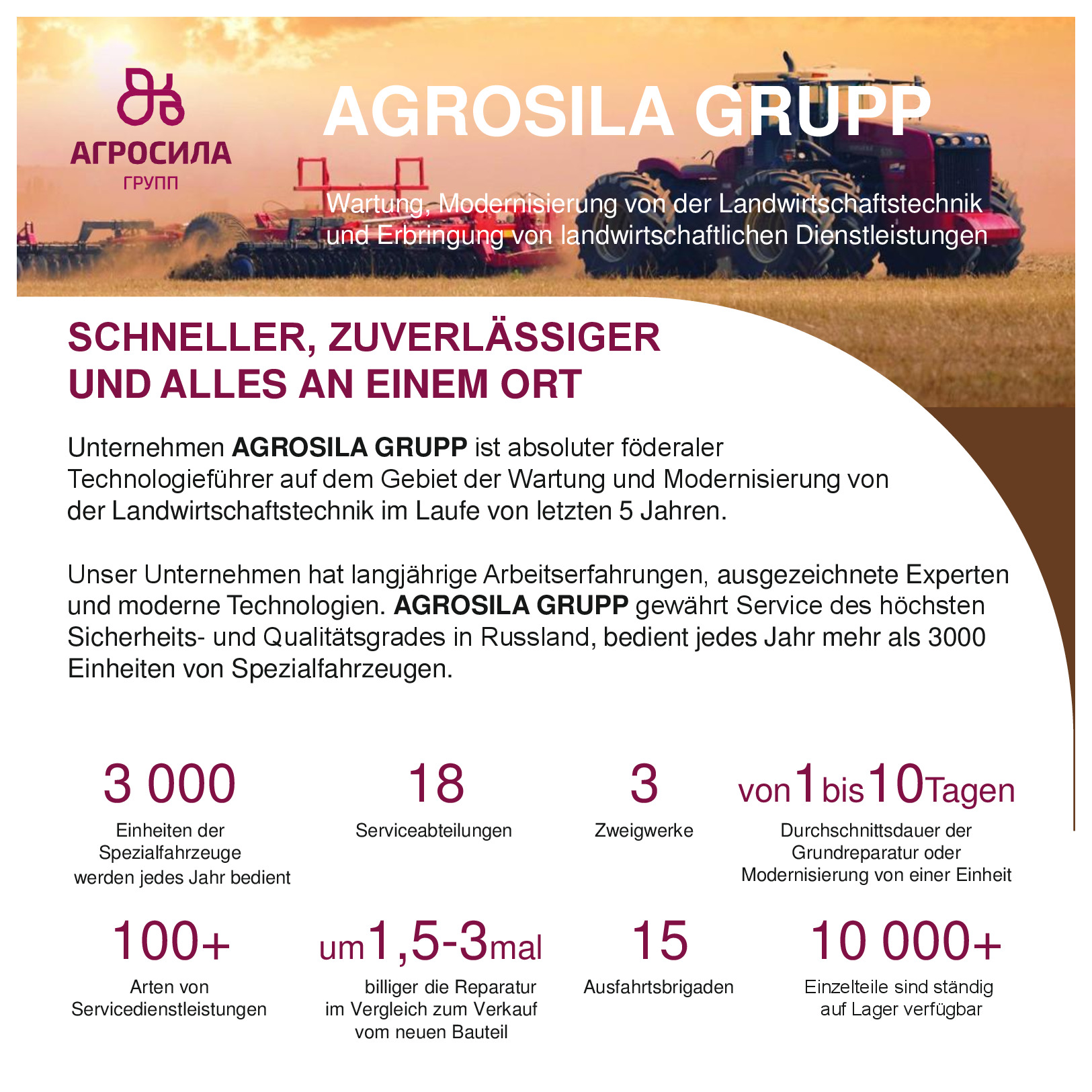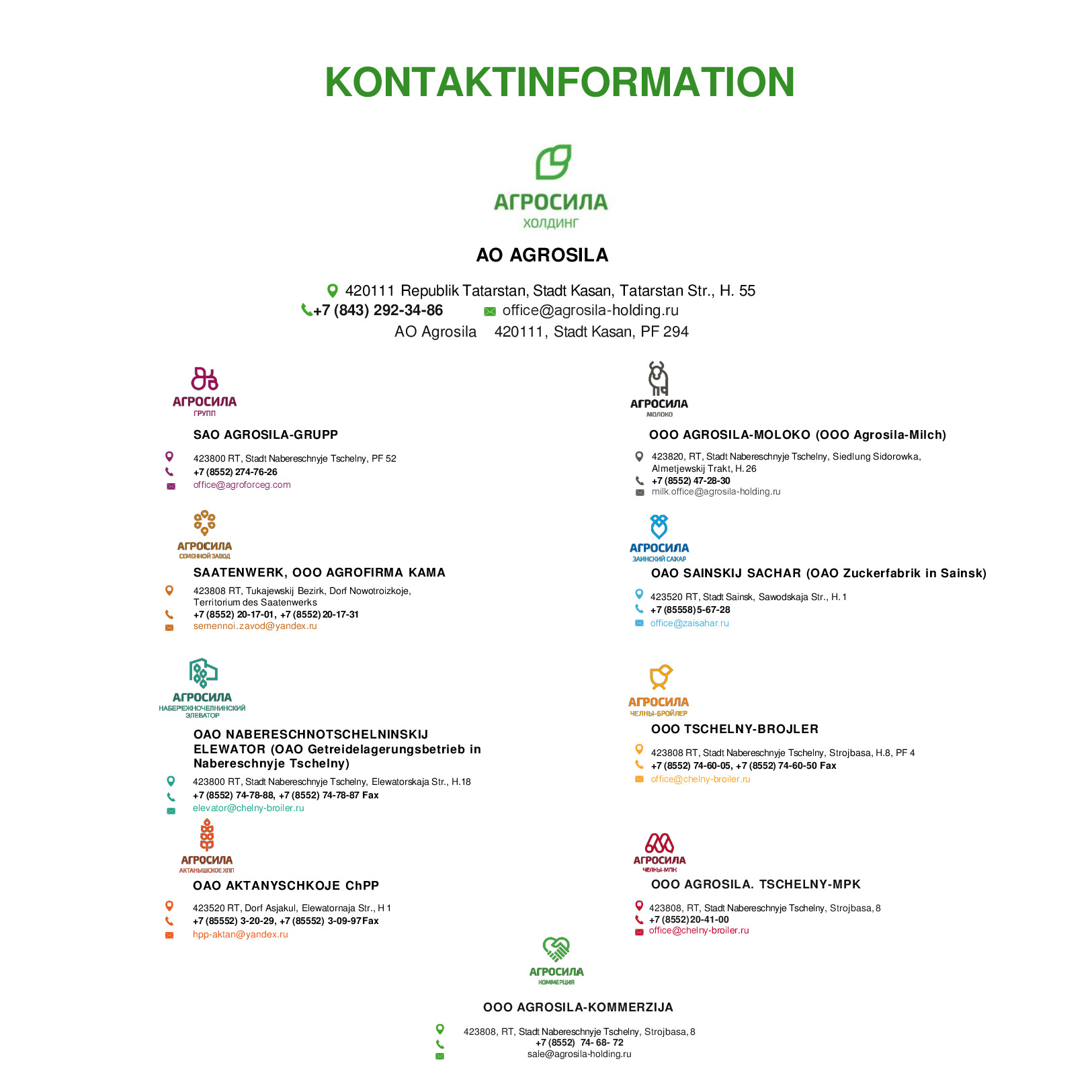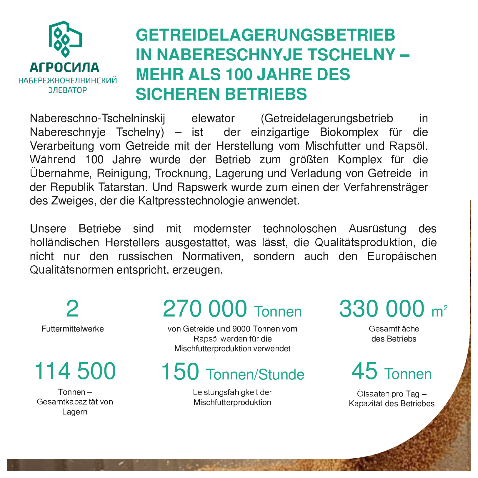 AGROSILA IST DER FÜHRENDE LANDWIRT IM WOLGAGEBIET, EINER DER GRÖSSTEN AGROHOLDINGGESELLSCHAFTEN RUSSLANDS. Die vertikal integrierte Holding schließt die Unternehmen für Anbau, Aufnahme, Lagerung und Behandlung der Getreide- und Industriekulturen, für die Herstellung der Tier- und Geflügelprodukte, die Zuckerproduktion, sowie für den Absatz der Fertigproduktion und den Service der Landwirtschaftstechnik ein. Zur Holdingstruktur gehören 24 Landwirtschaftsunternehmen, die auf dem Territorium der Republik Tatarstan gelagert sind. Die Unternehmen der Holdinggesellschaft belegen die führenden Positionen in jedem Segment ihrer Tätigkeit. Der Umfang der Agrarbank der Holdinggesellschaft AGROSILA übersteigt 324 Tausend Hektare in Tukajewski, Asnakajewskij, Sainskij, Sarmanowskij, Aktanyschskij, Nizhnekamskij und Musljumowskij Bezirke der Republik Tatarstan. Zum heutigen Tag gehört die Agroholdinggesellschaft zu den größten Grundbesitzern Russlands. Auf dem Plan des Unternehmens steht das Ziel: zu den zehn Besten größten russischen Agrarerzeugern zu gehören.