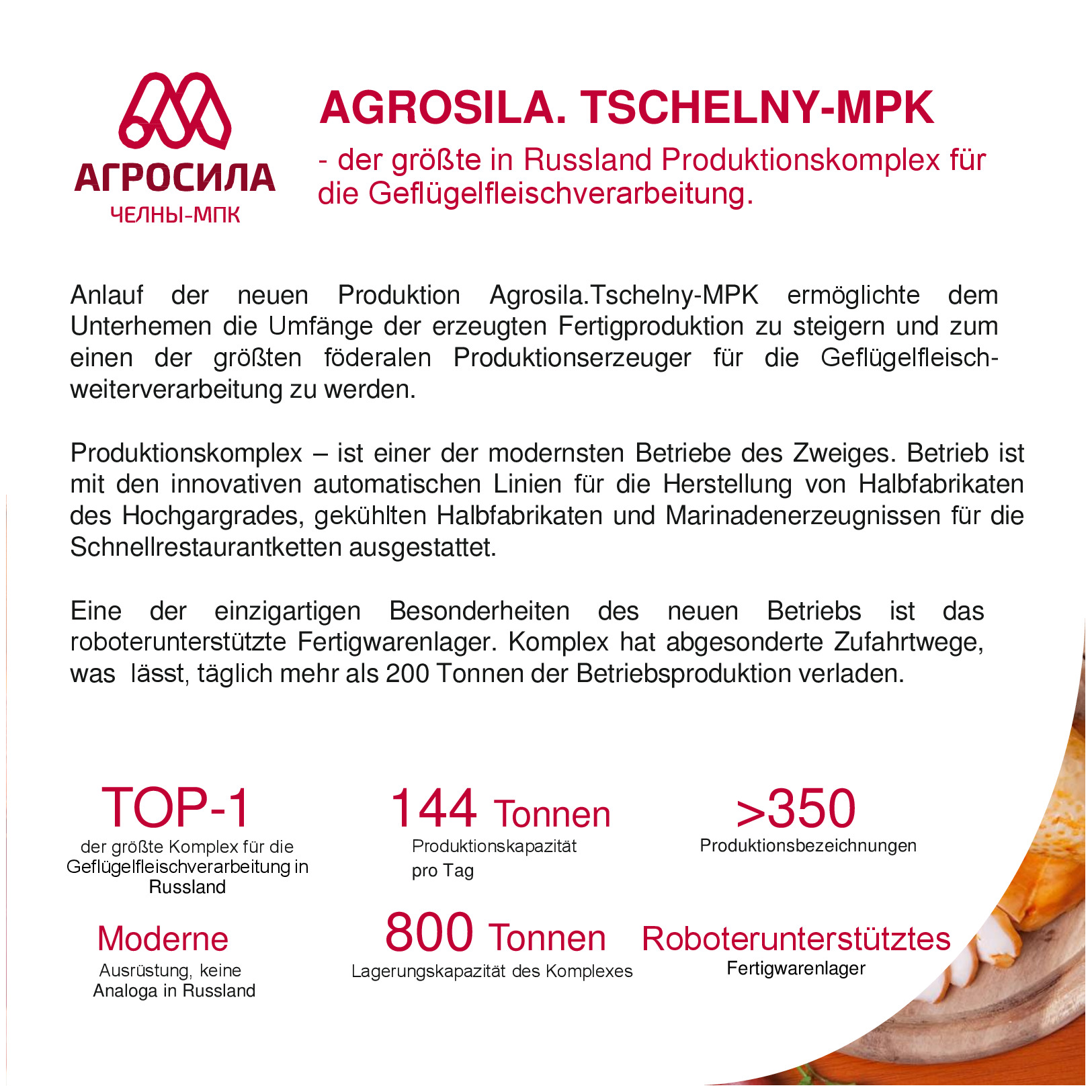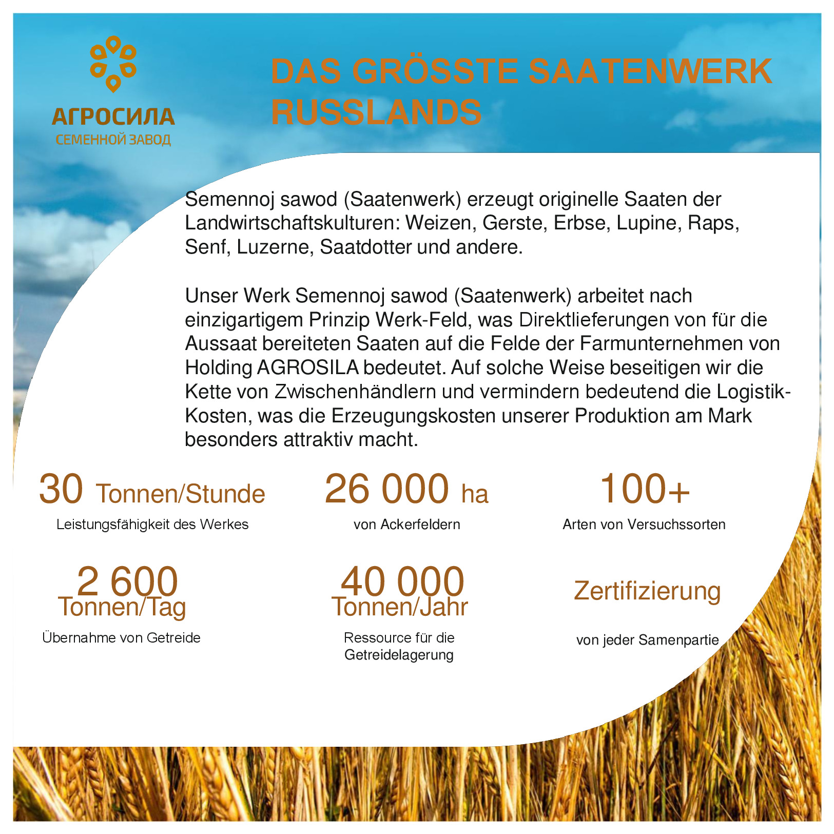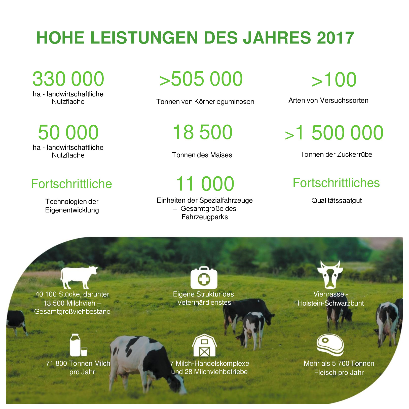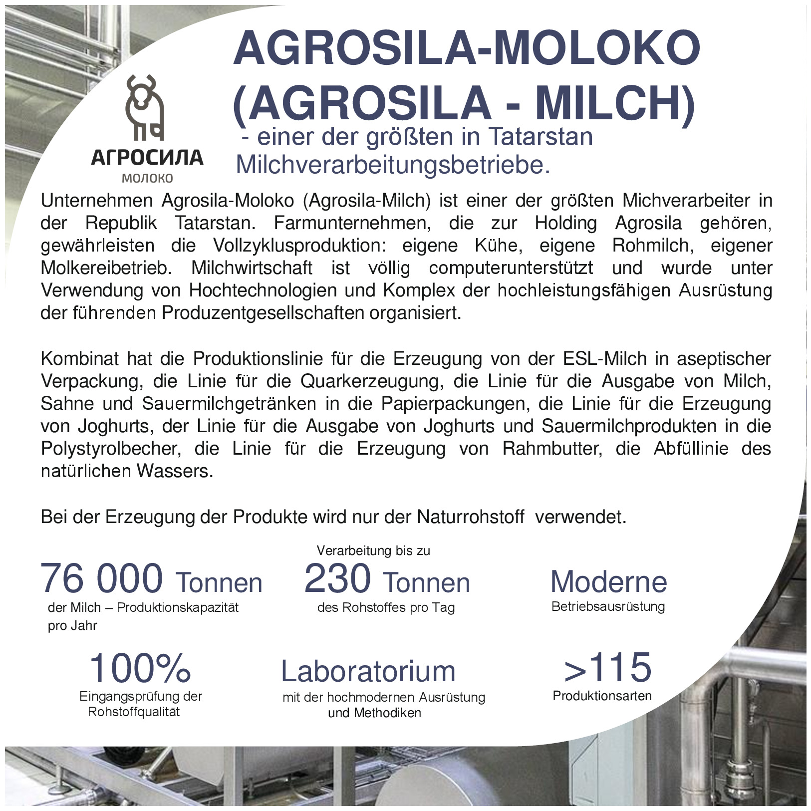 AGROSILA IST DER FÜHRENDE LANDWIRT IM WOLGAGEBIET, EINER DER GRÖSSTEN AGROHOLDINGGESELLSCHAFTEN RUSSLANDS. Die vertikal integrierte Holding schließt die Unternehmen für Anbau, Aufnahme, Lagerung und Behandlung der Getreide- und Industriekulturen, für die Herstellung der Tier- und Geflügelprodukte, die Zuckerproduktion, sowie für den Absatz der Fertigproduktion und den Service der Landwirtschaftstechnik ein. Zur Holdingstruktur gehören 24 Landwirtschaftsunternehmen, die auf dem Territorium der Republik Tatarstan gelagert sind. Die Unternehmen der Holdinggesellschaft belegen die führenden Positionen in jedem Segment ihrer Tätigkeit. Der Umfang der Agrarbank der Holdinggesellschaft AGROSILA übersteigt 324 Tausend Hektare in Tukajewski, Asnakajewskij, Sainskij, Sarmanowskij, Aktanyschskij, Nizhnekamskij und Musljumowskij Bezirke der Republik Tatarstan. Zum heutigen Tag gehört die Agroholdinggesellschaft zu den größten Grundbesitzern Russlands. Auf dem Plan des Unternehmens steht das Ziel: zu den zehn Besten größten russischen Agrarerzeugern zu gehören.