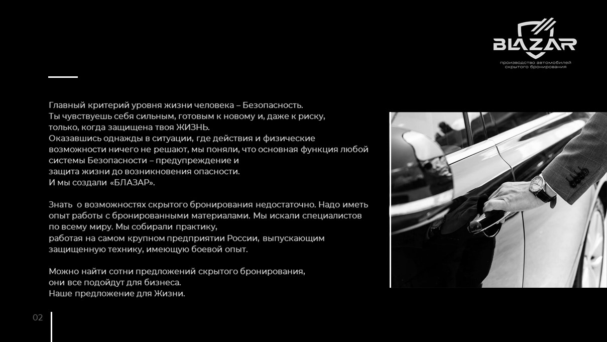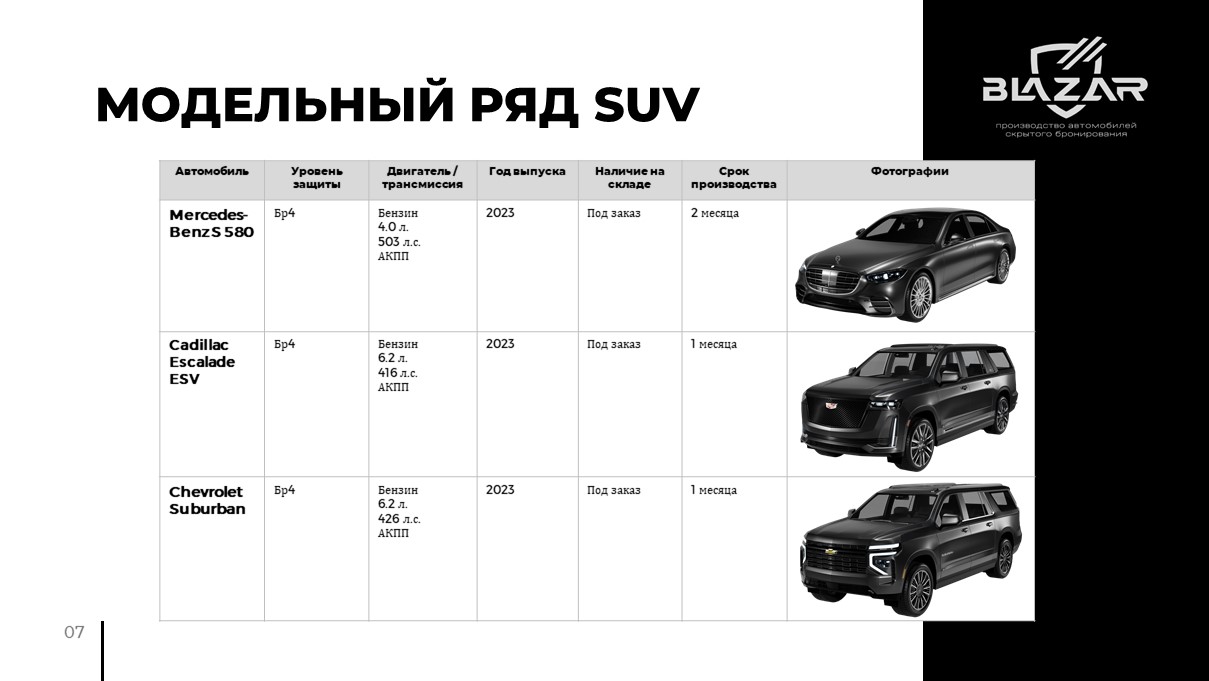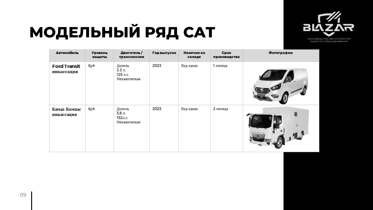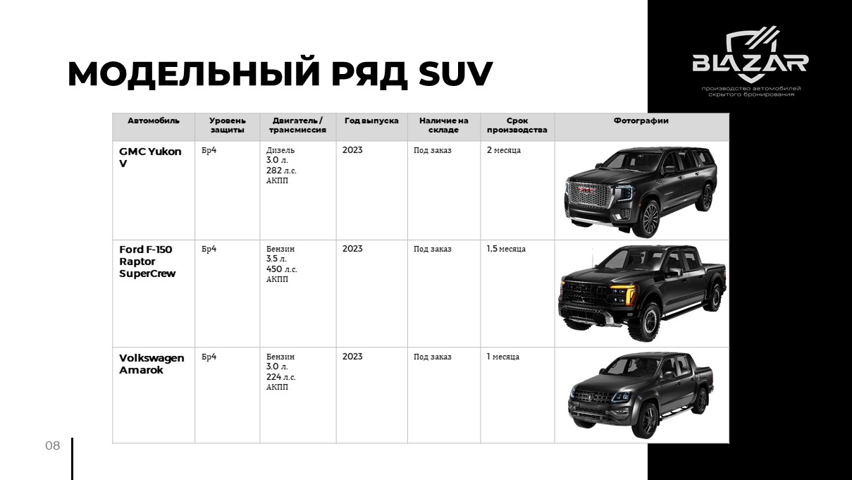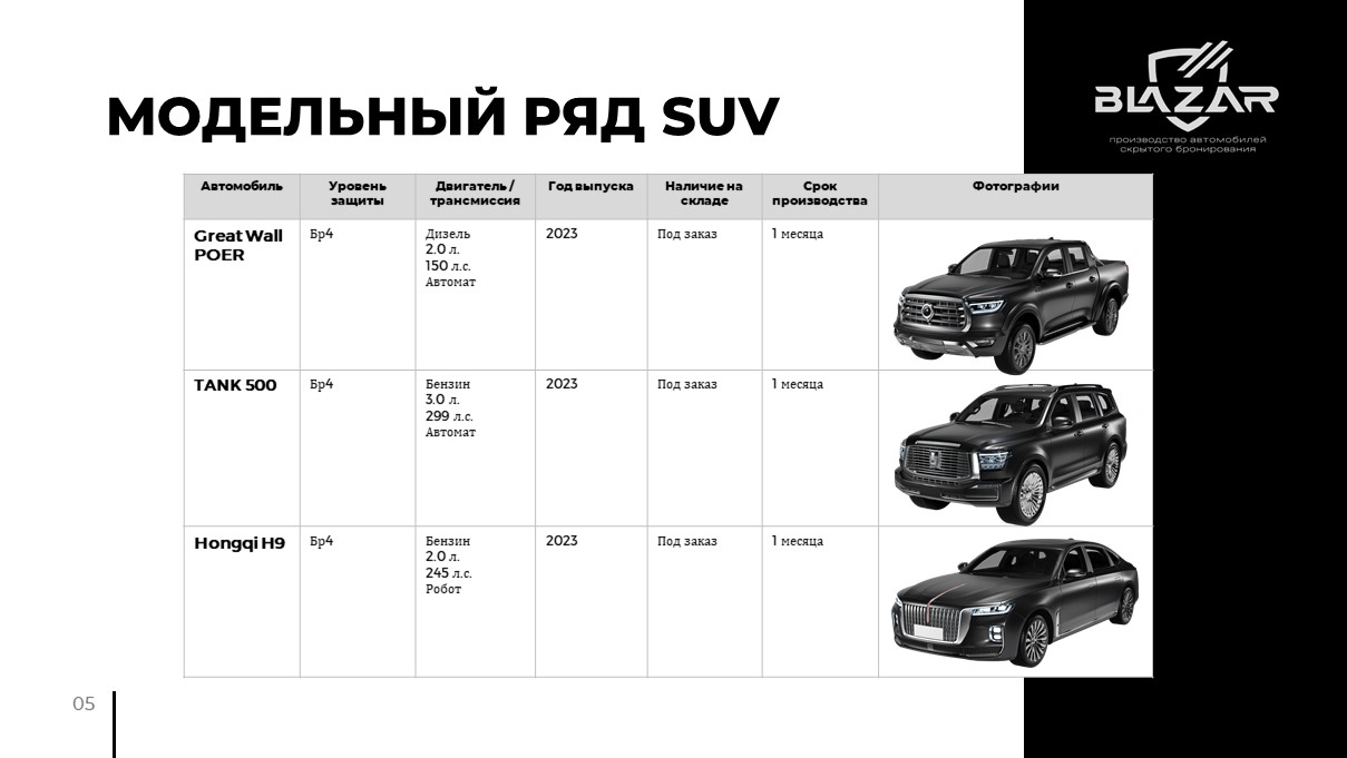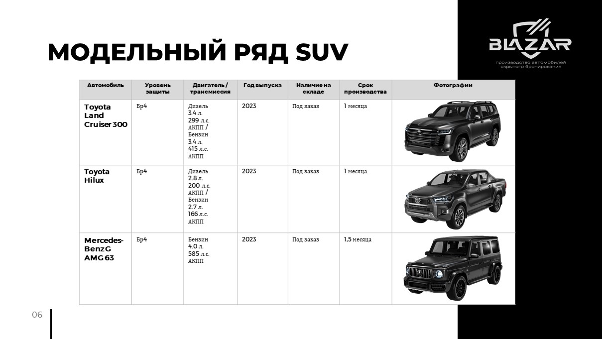 The range of manufactured vehicles includes collection vehicles vehicles, cars of various vehicles of various classes from pick-up trucks to premium segment of any brand of production. Blazar Armoring also manufactures special purpose vehicles and armors any level of security on demand. The production capacities allow to produce vehicles in the shortest possible time at the highest level.