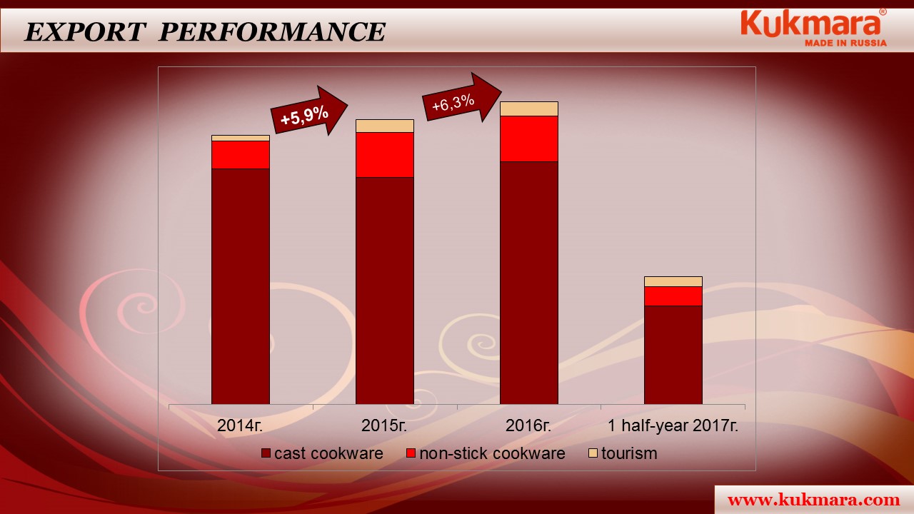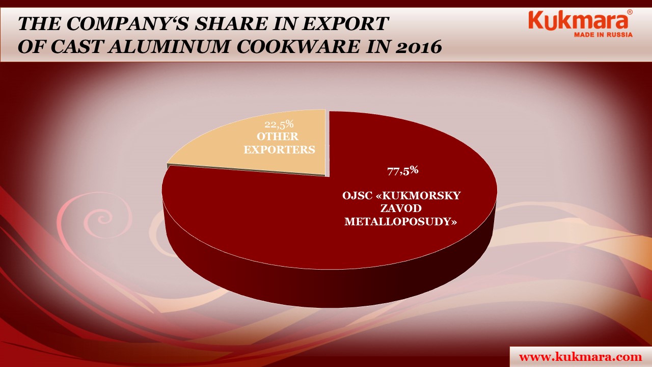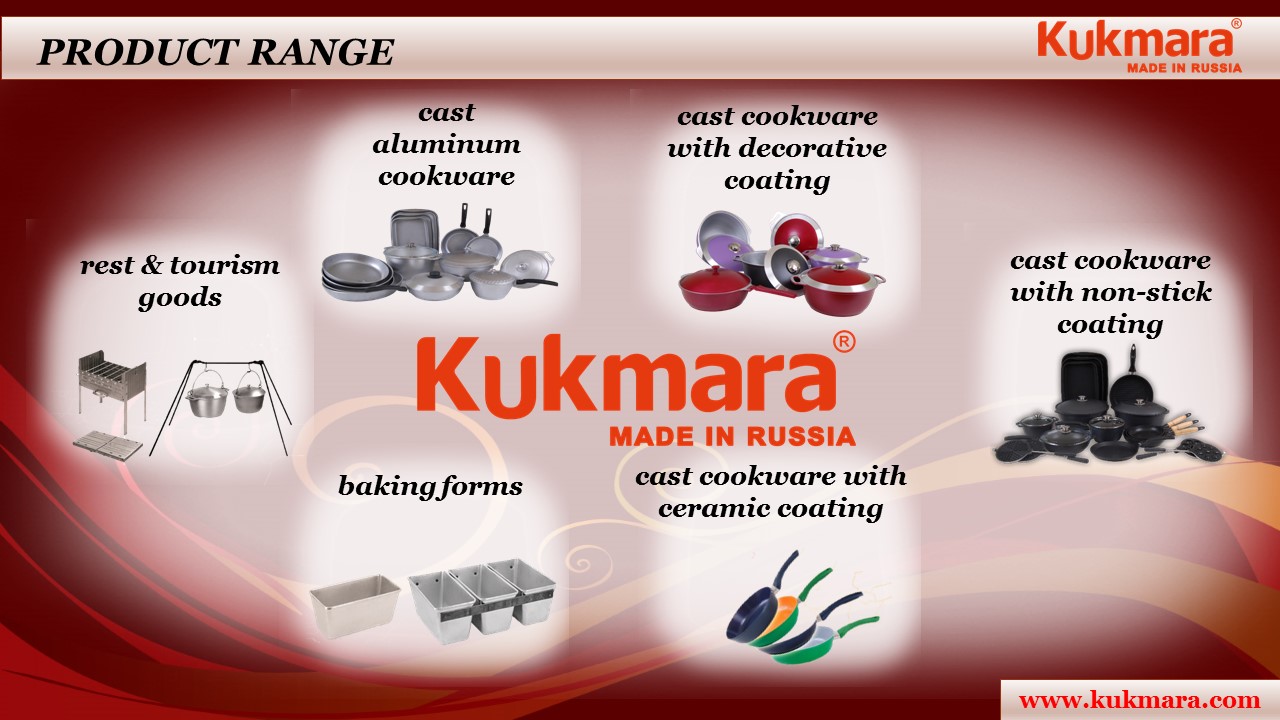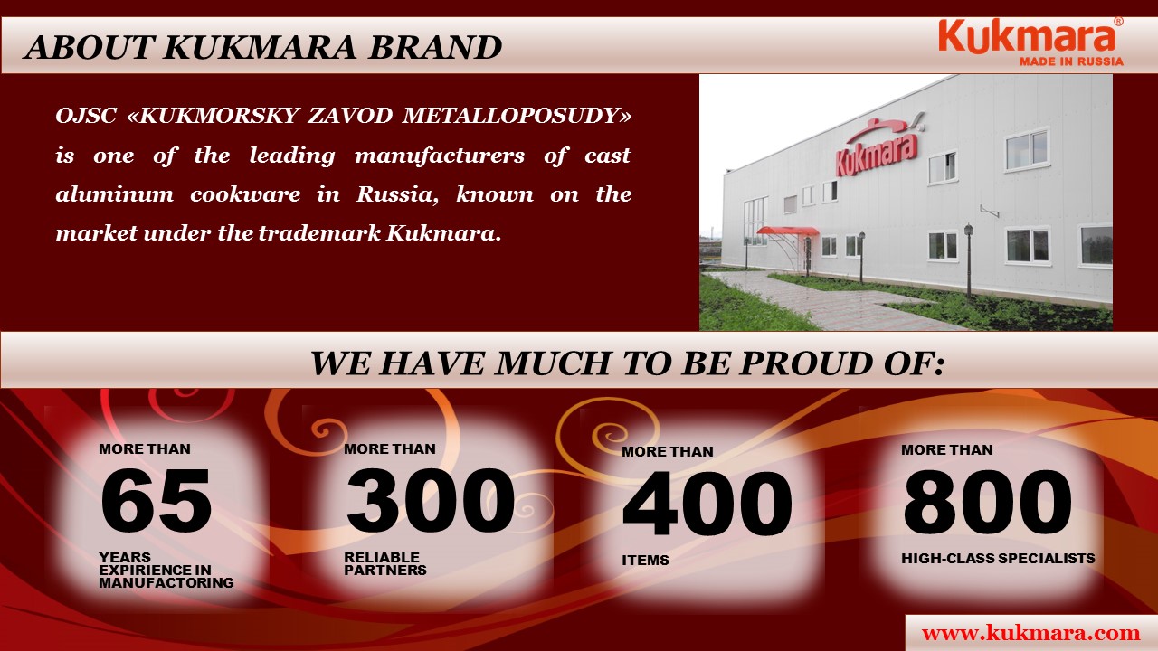 OJSC «Kukmorsky zavod Metalloposudy» - one of the leading Russian manufacturers of thick-walled die-cast aluminum cookware, known in the cookware market under the brand name KUKMARA®. Currently, the product range includes more than 400 items of goods. The activities of the plant develop in following directions: 1. die-cast aluminum cookware; 2. cookware with non-stick coating; 3. goods for tourism and recreation; 4. baking forms.