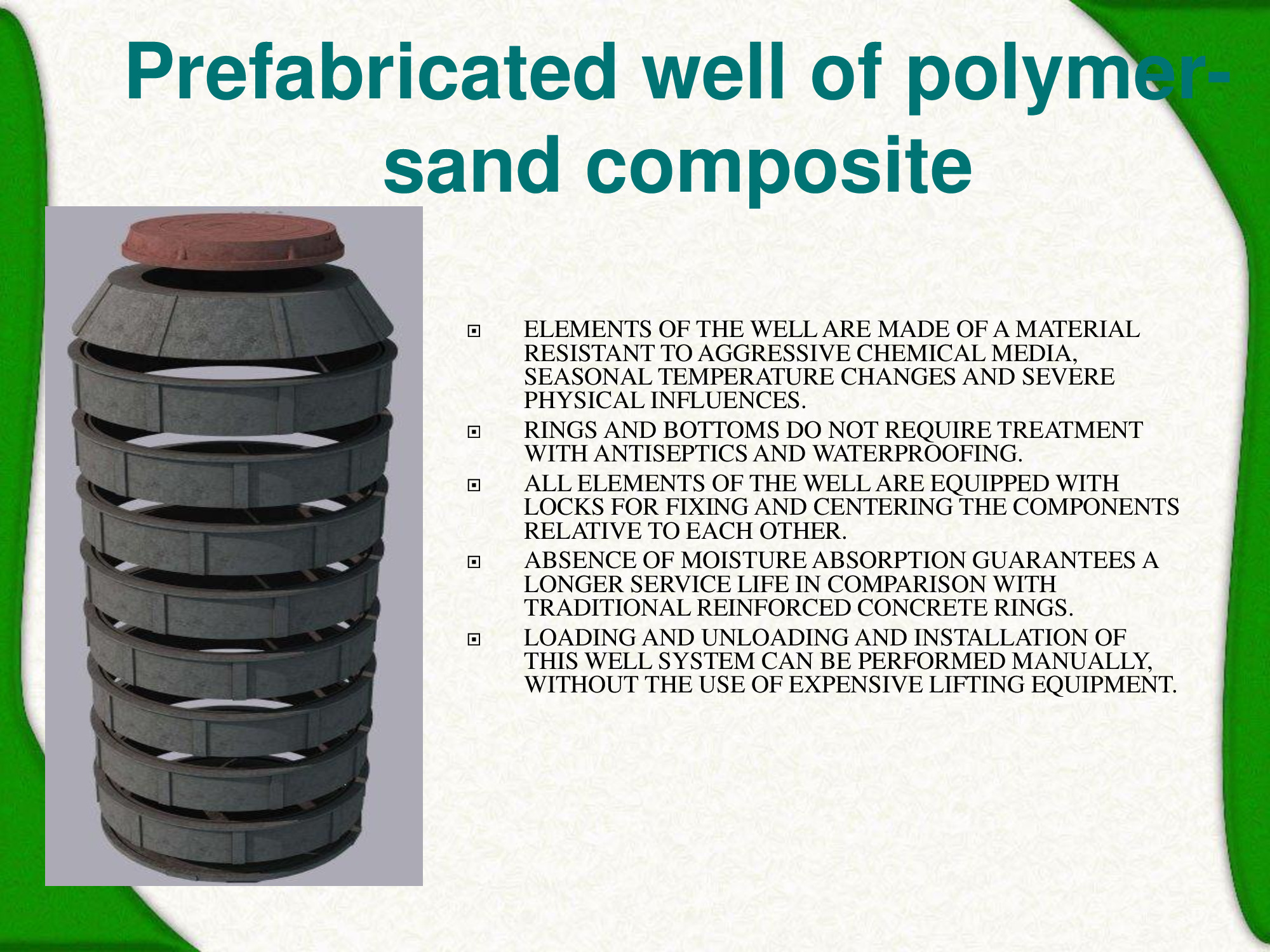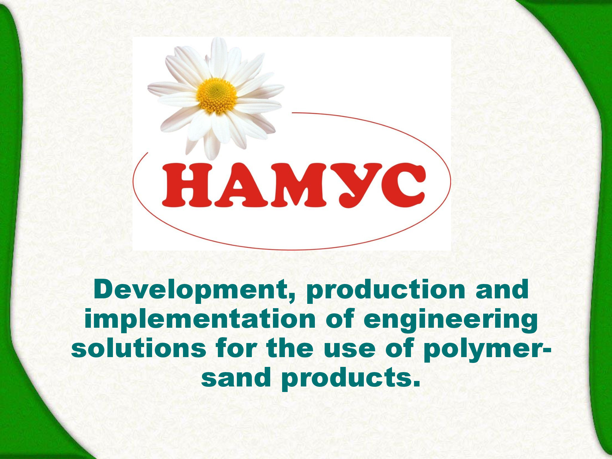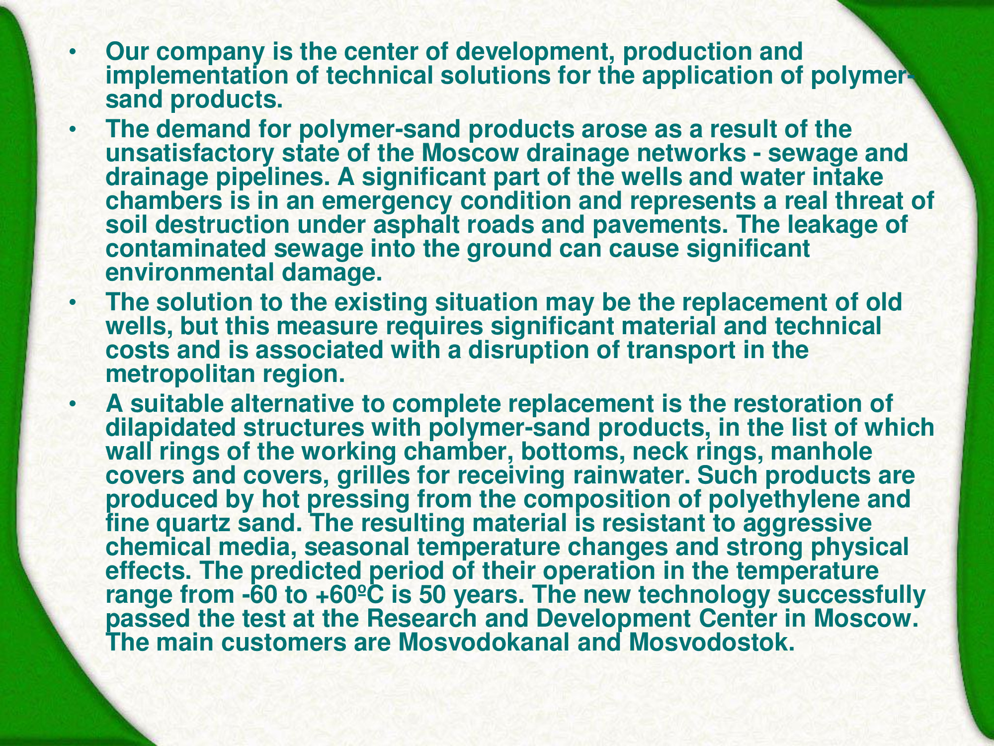 Our company is the center of development, production and implementation of technical solutions for the application of polymer-sand products. The demand for polymer-sand products arose as a result of the unsatisfactory state of the Moscow drainage networks -sewage and drainage pipelines. A significant part of the wells and water intake chambers is in an emergency condition and represents a real threat of soil destruction under asphalt roads and pavements. The leakage of contaminated sewage into the ground can cause significant environmental damage. The solution to the existing situation may be the replacement of old wells, but this measure requires significant material and technical costs and is associated with a disruption of transport in the metropolitan region. The new technology successfully passed the test at the Research and Development Center in Moscow. The main customers are Mosvodokanaland Mosvodostok.