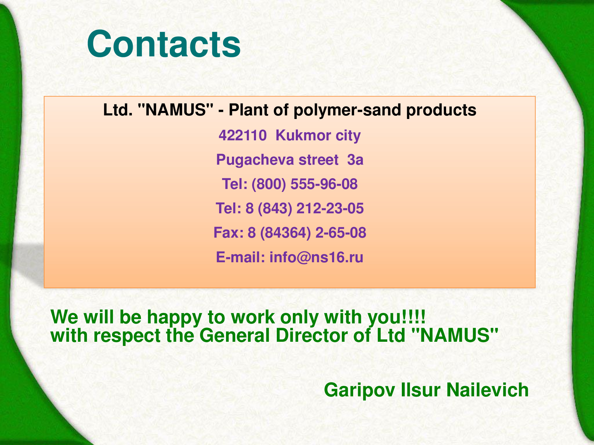 - 422110 Kukmor city, Pugacheva street 3a, Republic of Tatarstan