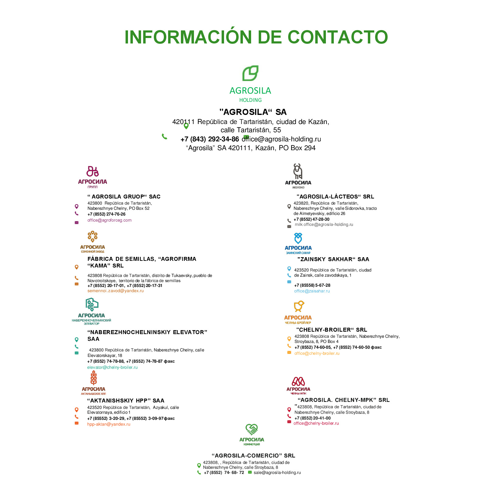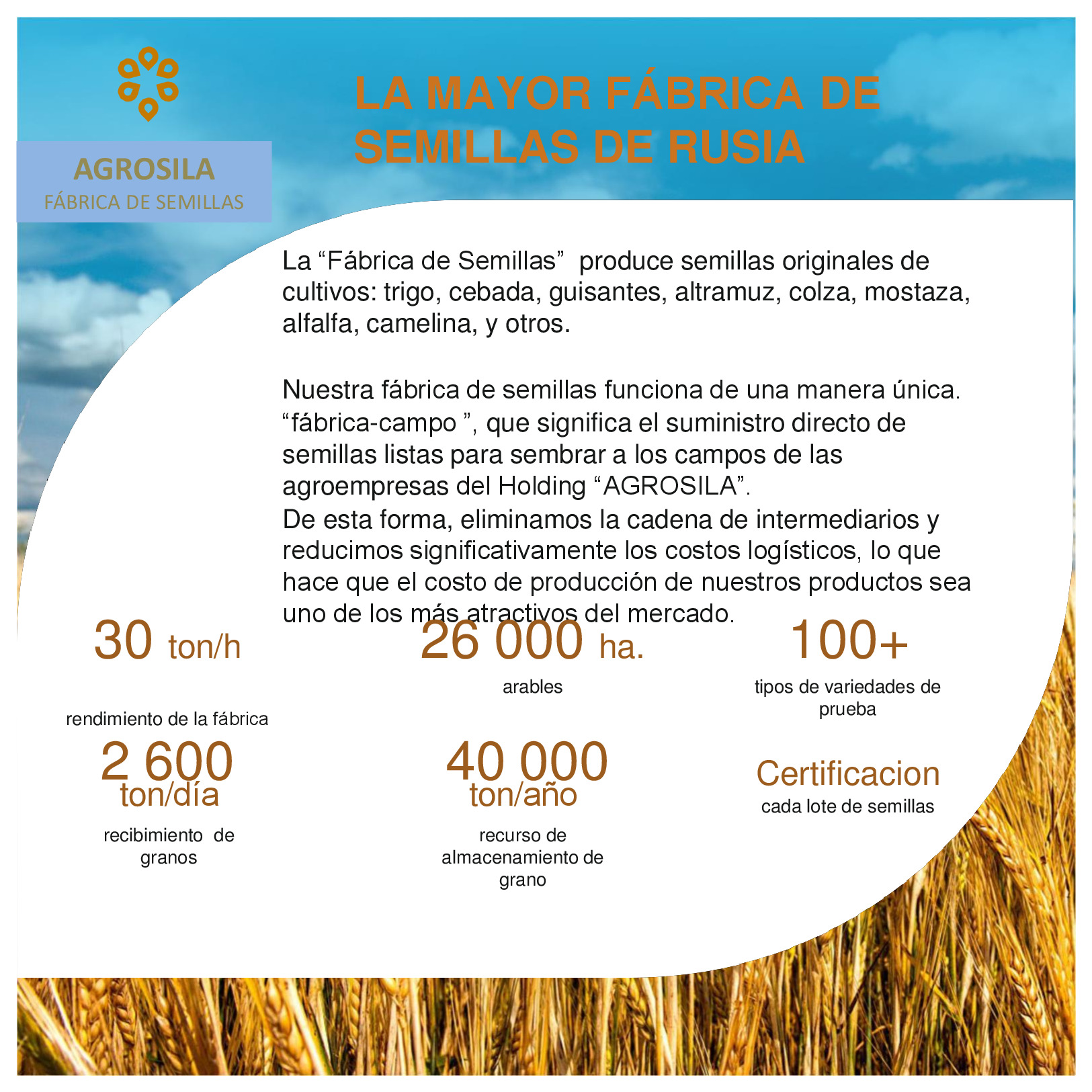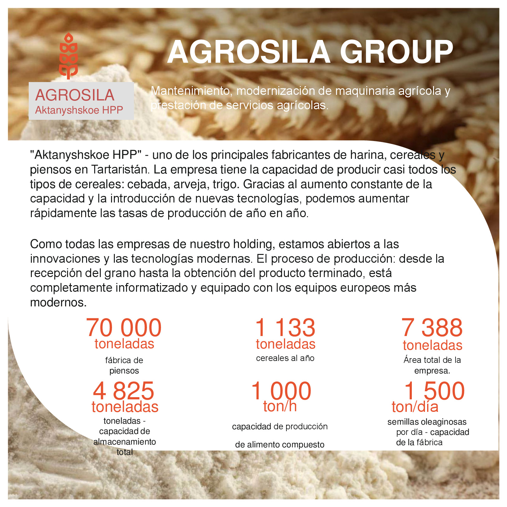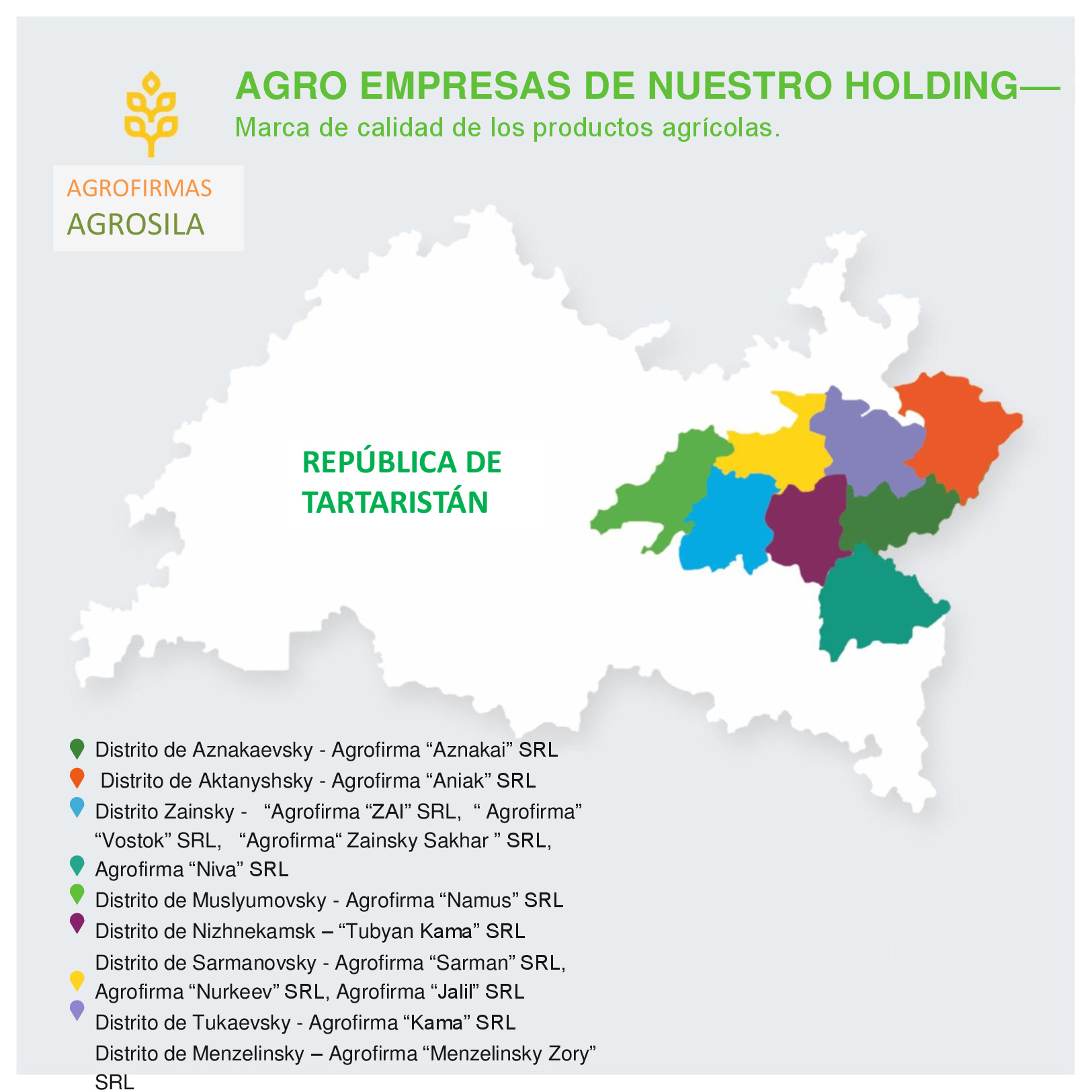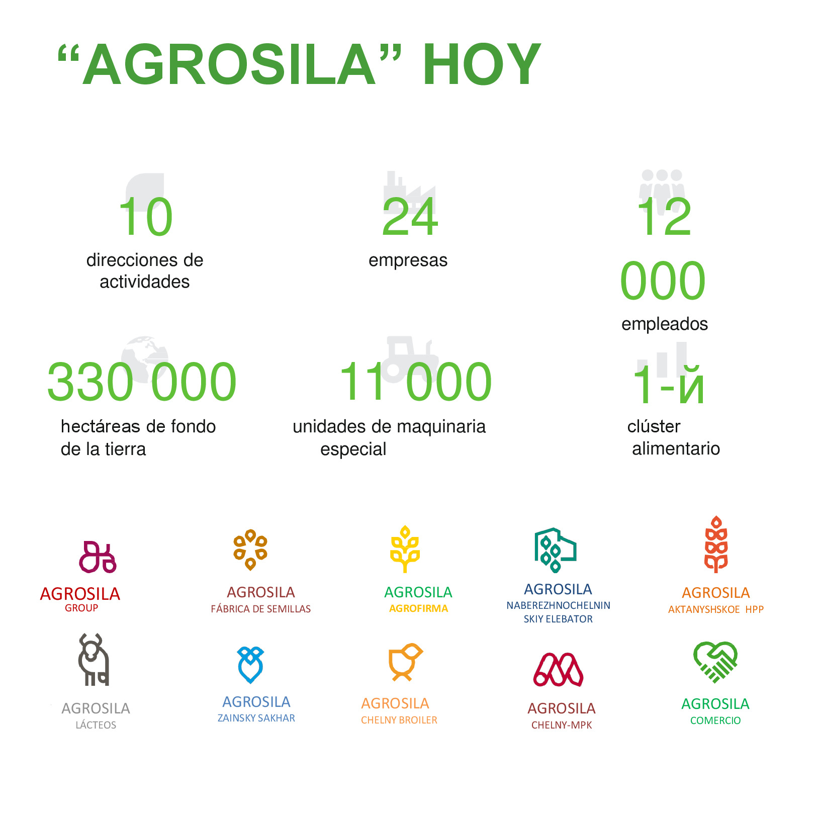 AGROSILA – ES EL PRODUCTOR AGRÍCOLA LÍDER EN LA REGIÓN DEL VOLGA Y UNO DE LOS AGROHOLDINGS MÁS GRANDES DE RUSIA. El holding verticalmente integrado incluye a empresas de cultivo, recepción, almacenamiento y procesamiento de granos y cultivos industriales, la producción de productos para la ganadería y la avicultura, la producción de azúcar, así como la venta de productos acabados y servicios de mantenimiento de los equipos agrícolas. La estructura del holding incluye 24 empresas agrícolas ubicadas en el territorio de la República de Tartaristán. Las empresas del holding ocupan una posición de liderazgo en cada uno de los segmentos de sus actividades. El volumen de reserva de suelo de "AGROSILA" es más de 324.000 hectáreas en los Distritos de Tukaevsk, Aznakaevsky, Zainsk, Sarmanovsky, Aktanysh, Niznekamsk y Muslyumovsky de la República de Tartaristán. Hoy el agroholding es uno de los mayores terratenientes de Rusia. La compañía planea convertirse en uno de los diez mayores productores rusos de productos agrícolas.