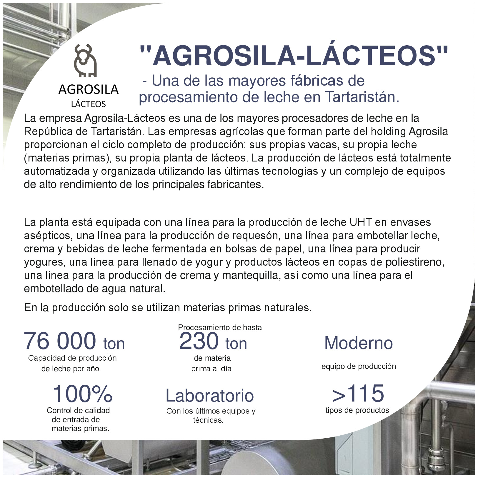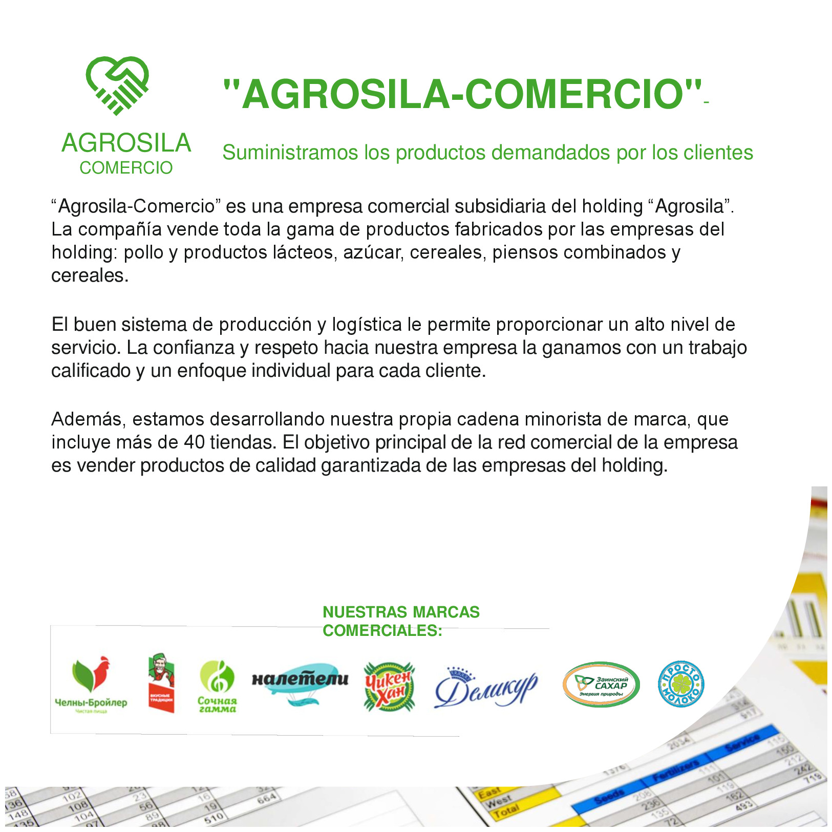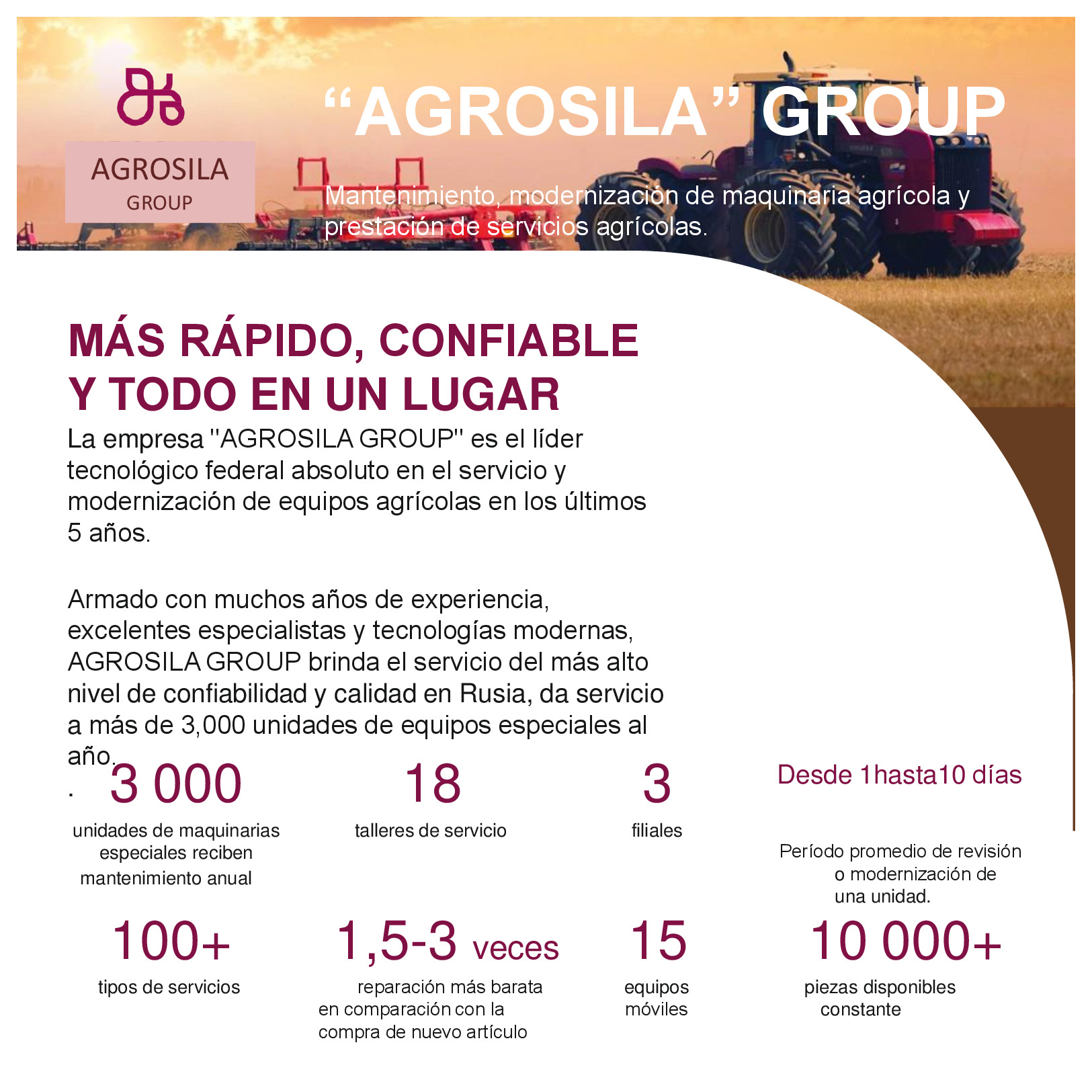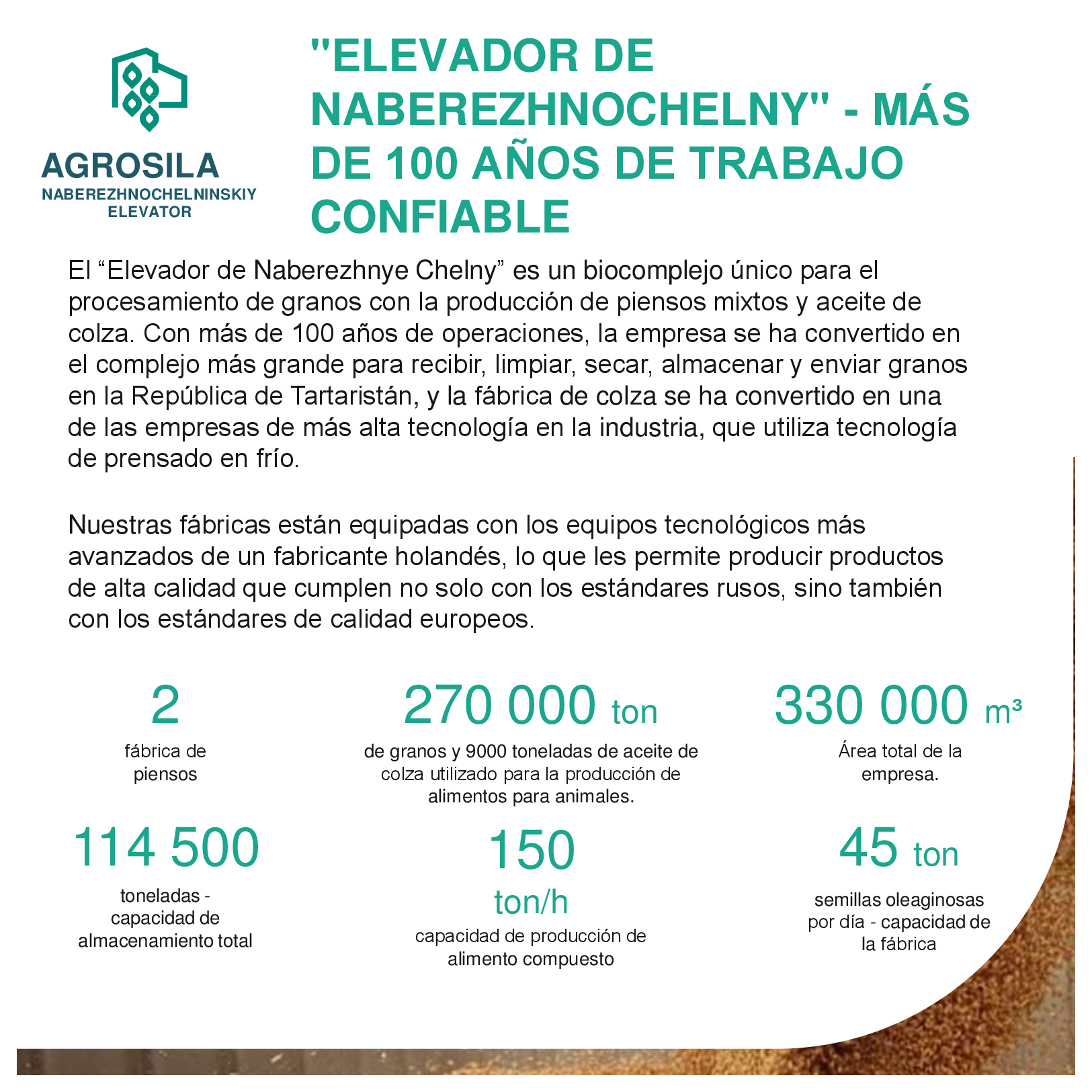 AGROSILA – ES EL PRODUCTOR AGRÍCOLA LÍDER EN LA REGIÓN DEL VOLGA Y UNO DE LOS AGROHOLDINGS MÁS GRANDES DE RUSIA. El holding verticalmente integrado incluye a empresas de cultivo, recepción, almacenamiento y procesamiento de granos y cultivos industriales, la producción de productos para la ganadería y la avicultura, la producción de azúcar, así como la venta de productos acabados y servicios de mantenimiento de los equipos agrícolas. La estructura del holding incluye 24 empresas agrícolas ubicadas en el territorio de la República de Tartaristán. Las empresas del holding ocupan una posición de liderazgo en cada uno de los segmentos de sus actividades. El volumen de reserva de suelo de "AGROSILA" es más de 324.000 hectáreas en los Distritos de Tukaevsk, Aznakaevsky, Zainsk, Sarmanovsky, Aktanysh, Niznekamsk y Muslyumovsky de la República de Tartaristán. Hoy el agroholding es uno de los mayores terratenientes de Rusia. La compañía planea convertirse en uno de los diez mayores productores rusos de productos agrícolas.