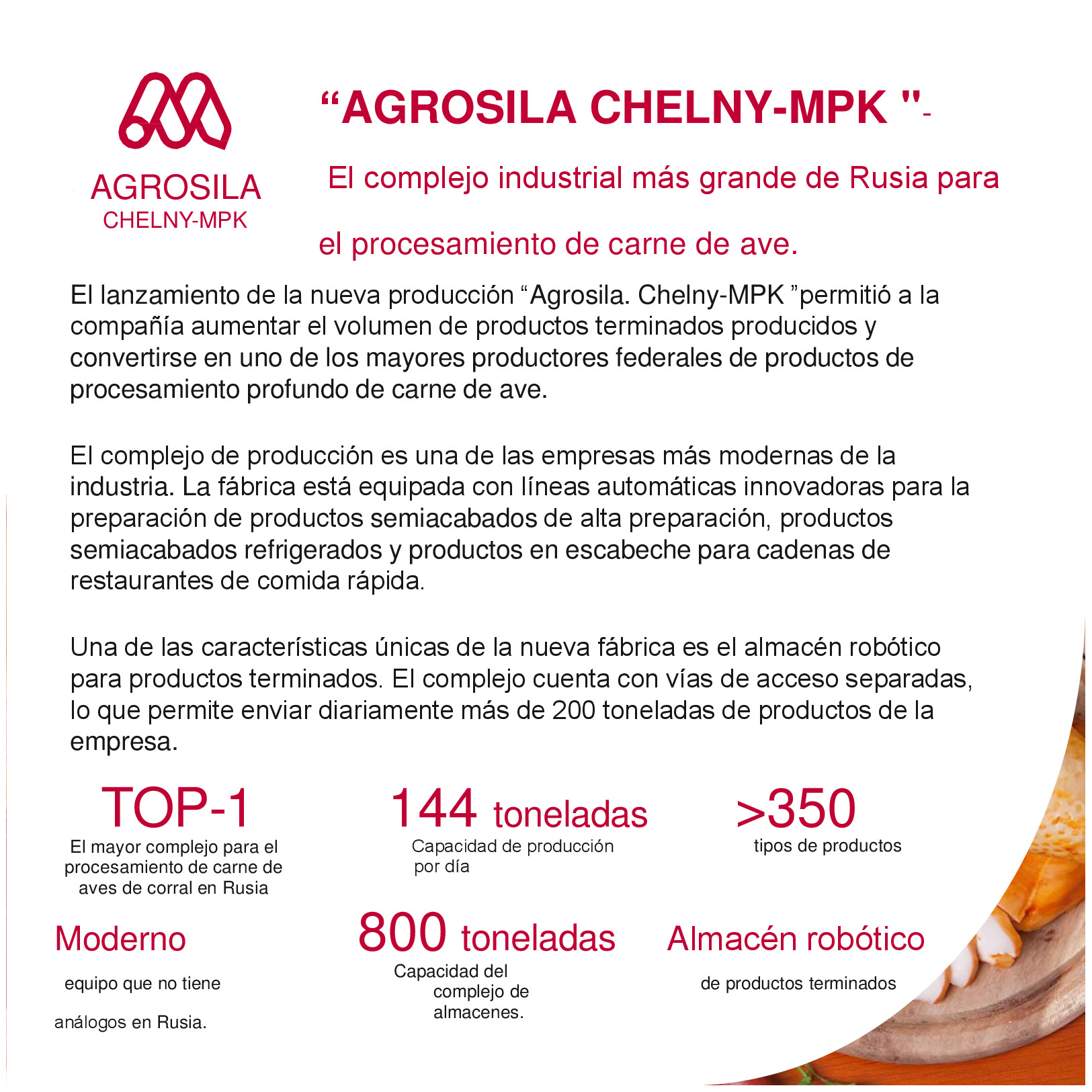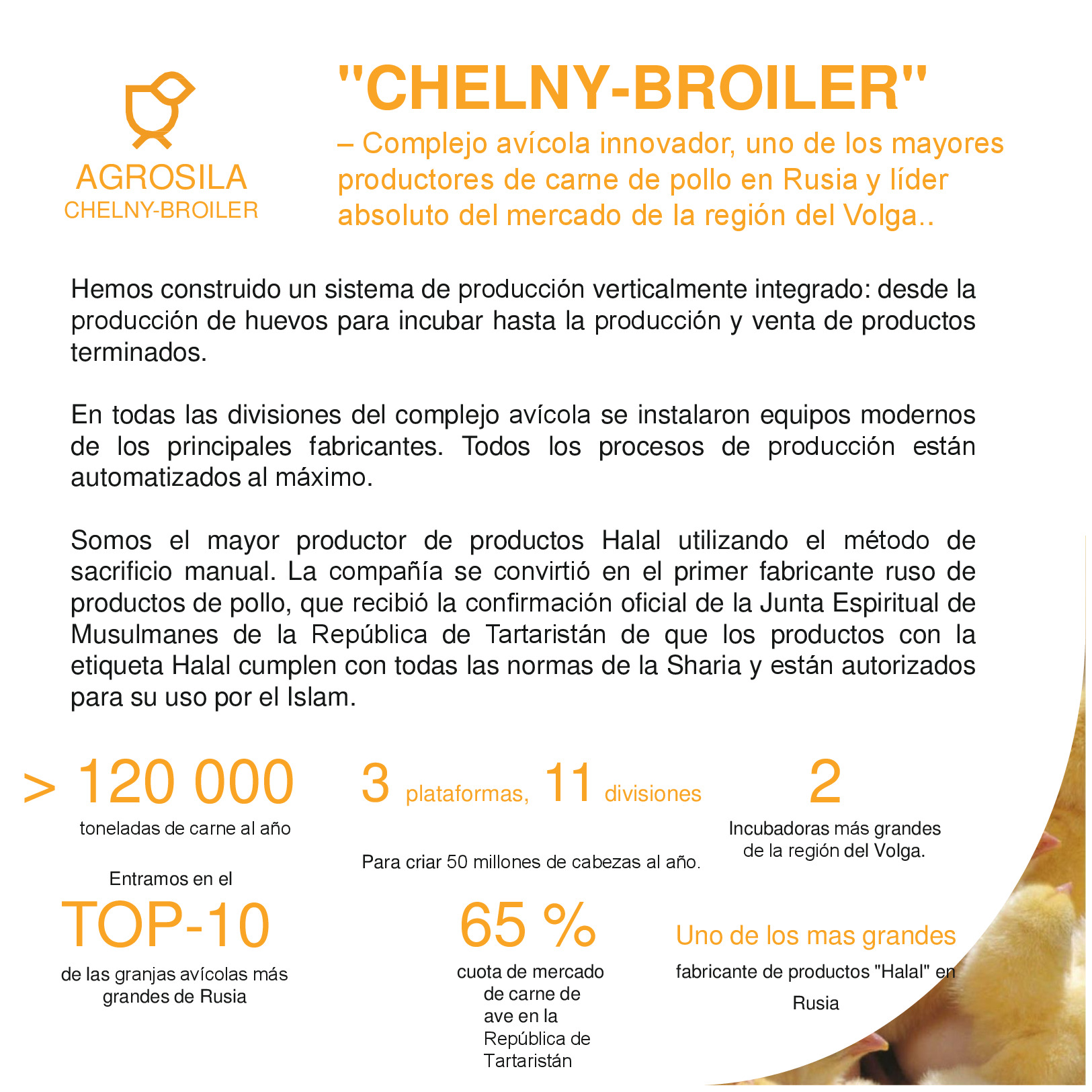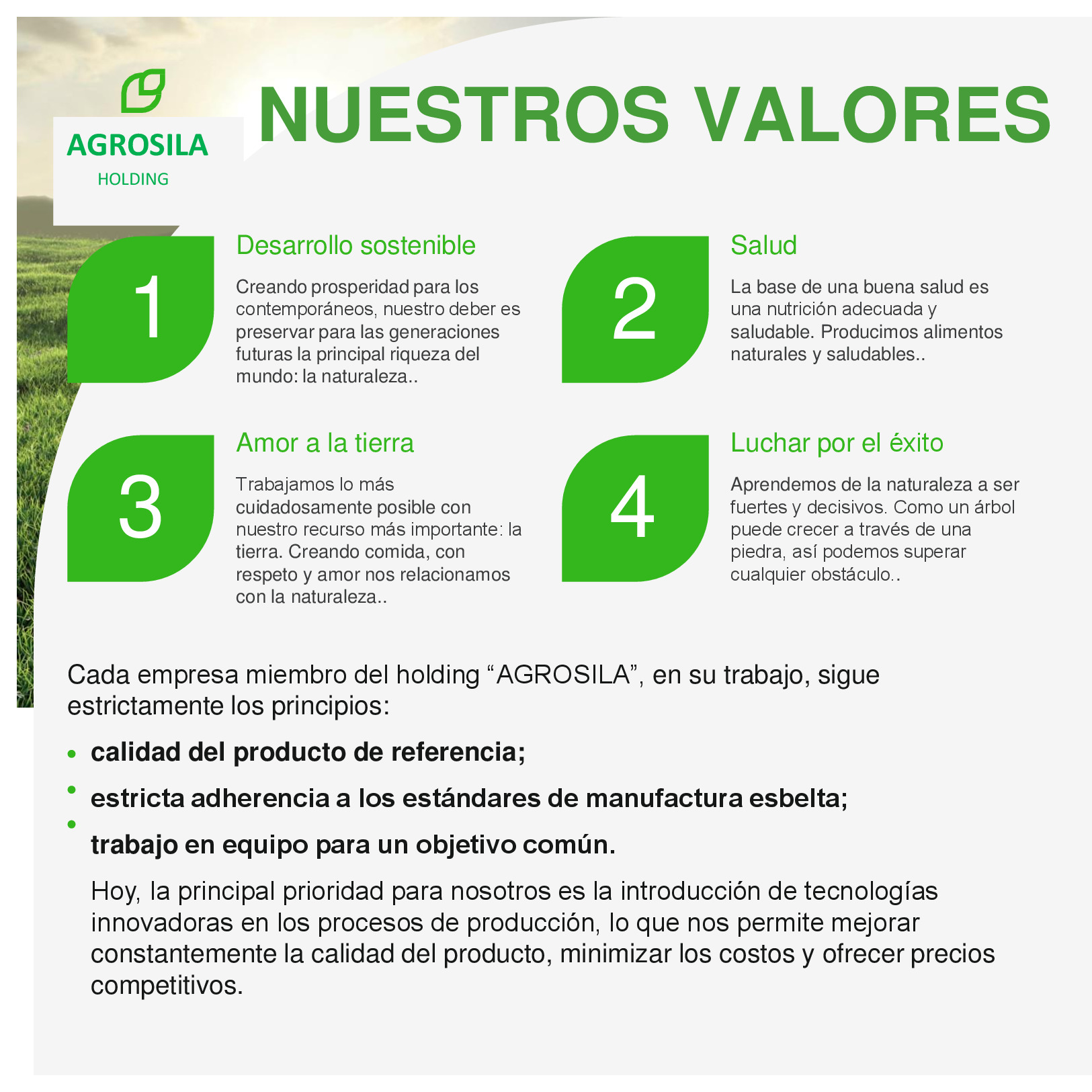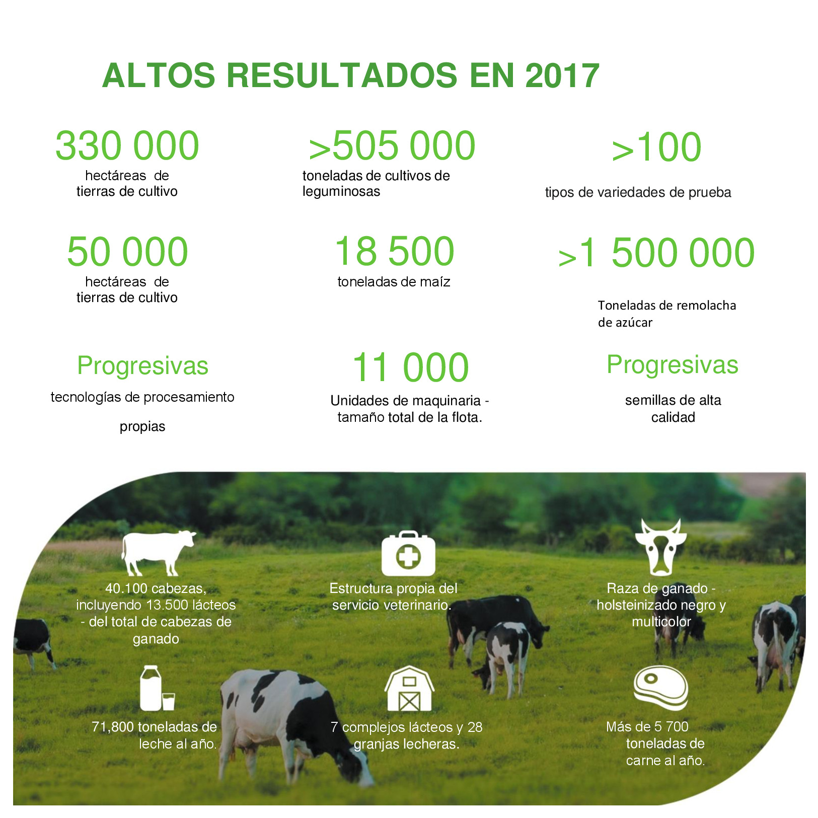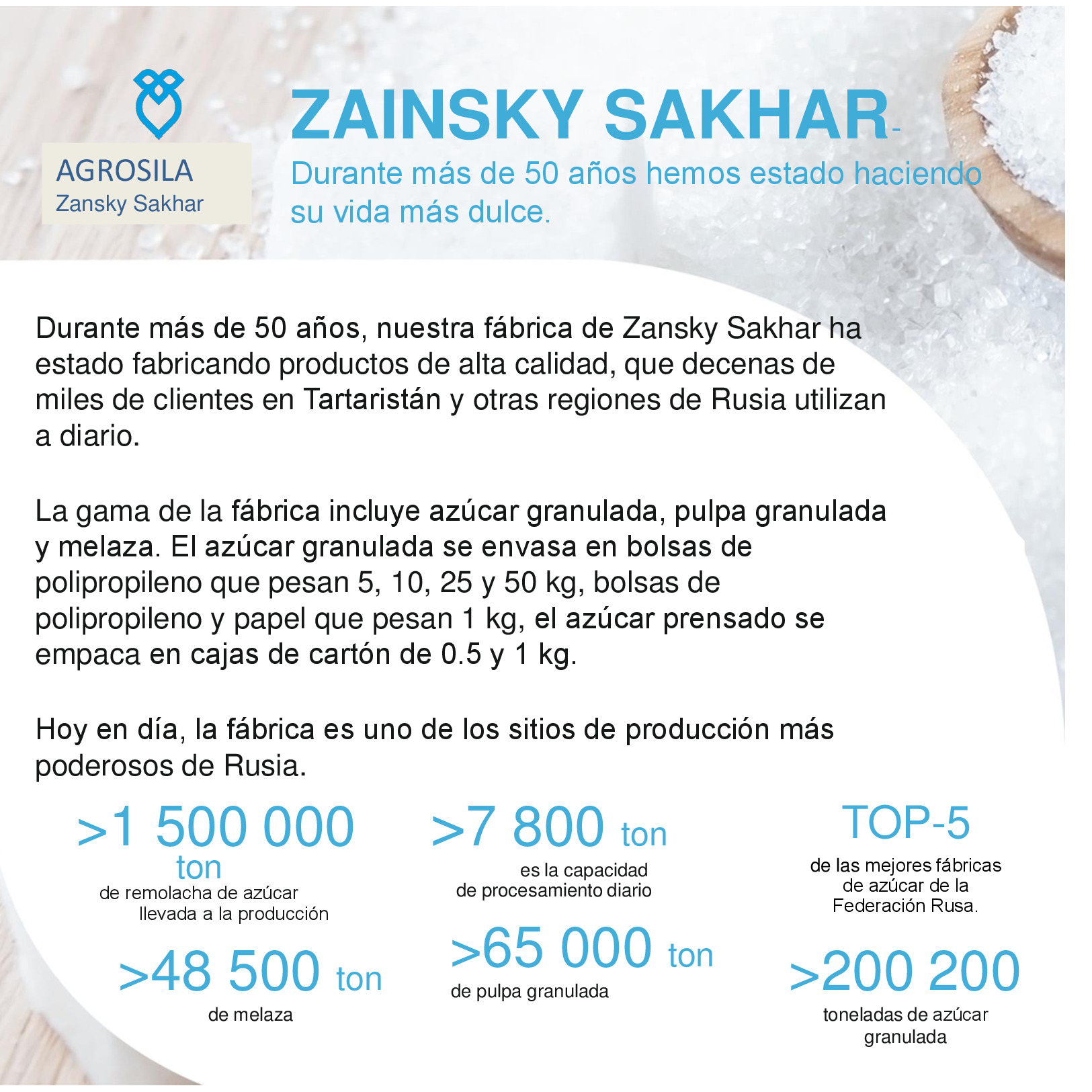 AGROSILA – ES EL PRODUCTOR AGRÍCOLA LÍDER EN LA REGIÓN DEL VOLGA Y UNO DE LOS AGROHOLDINGS MÁS GRANDES DE RUSIA. El holding verticalmente integrado incluye a empresas de cultivo, recepción, almacenamiento y procesamiento de granos y cultivos industriales, la producción de productos para la ganadería y la avicultura, la producción de azúcar, así como la venta de productos acabados y servicios de mantenimiento de los equipos agrícolas. La estructura del holding incluye 24 empresas agrícolas ubicadas en el territorio de la República de Tartaristán. Las empresas del holding ocupan una posición de liderazgo en cada uno de los segmentos de sus actividades. El volumen de reserva de suelo de "AGROSILA" es más de 324.000 hectáreas en los Distritos de Tukaevsk, Aznakaevsky, Zainsk, Sarmanovsky, Aktanysh, Niznekamsk y Muslyumovsky de la República de Tartaristán. Hoy el agroholding es uno de los mayores terratenientes de Rusia. La compañía planea convertirse en uno de los diez mayores productores rusos de productos agrícolas.