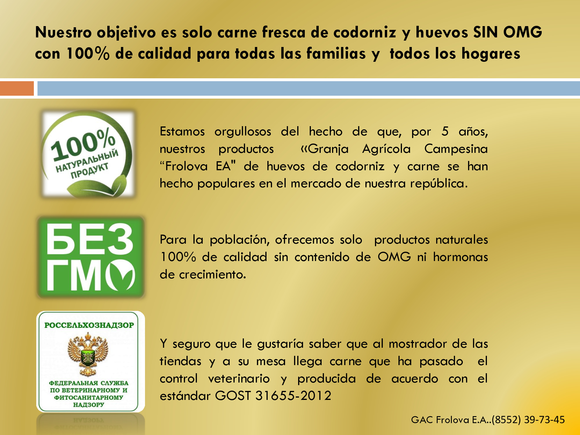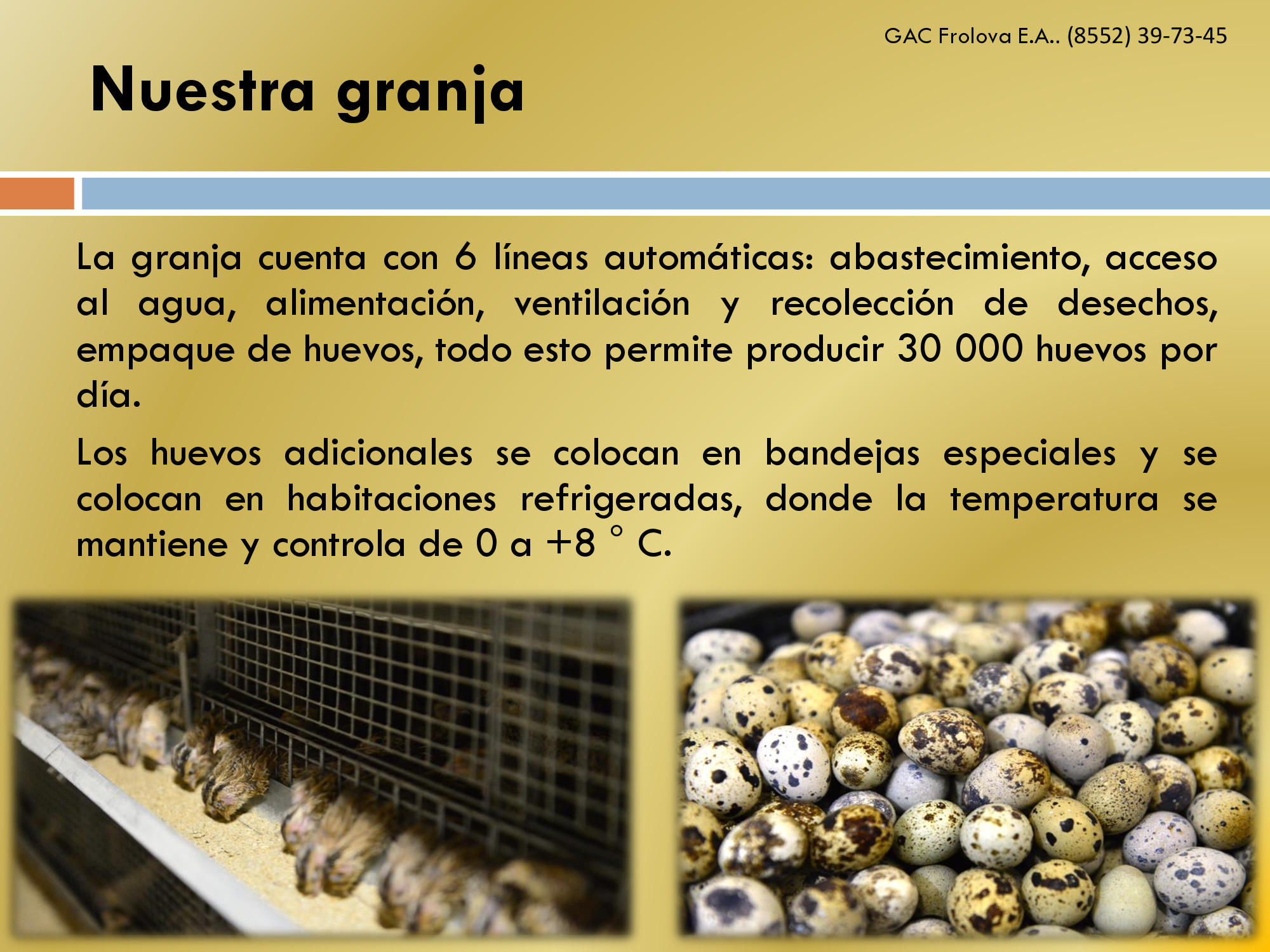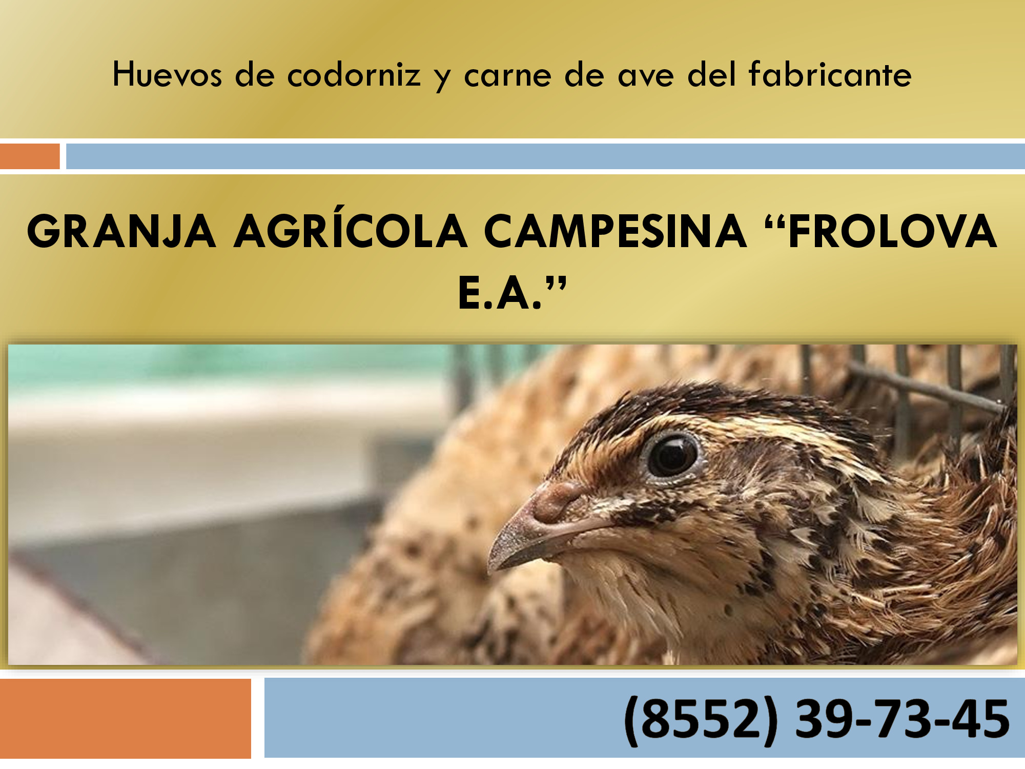 La granja campesina “Frolova E.A.” invita a la cooperación a las grandes cadenas de tiendas y de producción de alimentos, que están interesados en el suministro al por mayor de huevos de codorniz de calidad. Garantizamos que todos los procesos, desde la puesta de huevos en la incubadora hasta la preparación de los alimentos balanceados, se hacen en nuestra propia fábrica. Por lo tanto, se garantiza un estricto control del cumplimiento de las operaciones y procesos tecnológicos en todas las etapas de la producción de huevos de codorniz. Ventajas de la cooperación con nosotros: • Excelente calidad del producto, cumple con los requisitos de GOST 31655-2012; • Posibilidad de pedir una gran cantidad de productos (más de 30 mil huevos diarios de nuestras líneas de producción); • Costo óptimo de huevos de codorniz y suministros directos. Los huevos de codorniz tienen una serie de ventajas en comparación con los de gallina. Las principales de ellas son: hipoalergénicos, alto contenido de microelementos y nutrientes útiles, ausencia completa de colesterol, se excluye la probabilidad de infección con salmonella. Los suministros al por mayor de huevos de codorniz serán relevantes para las empresas comerciales grandes y medianas, en el rango de las cuales se planea presentar este producto para la venta al por menor. Además, esta propuesta puede ser interesante para las empresas que trabajan en la industria alimentaria y usan huevos de codorniz en la preparación de sus productos.