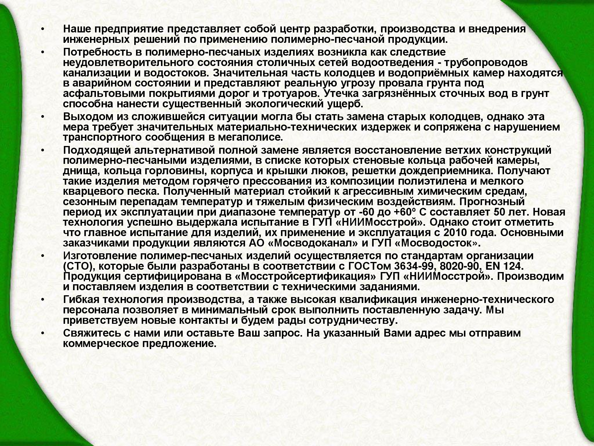 Наше предприятие представляет собой центр разработки, производства и внедрения инженерных решений по применению полимерно-песчаной продукции. Новая технология успешно выдержала испытание в ГУП «НИИМосстрой». Однако стоит отметить что главное испытание для изделий, их применение и эксплуатация c 2010 года. Основными заказчиками продукции являются АО «Мосводоканал» и ГУП «Мосводосток».Изготовление полимер-песчаных изделий осуществляется по стандартам организации (СТО), которые были разработаны в соответствии с ГОСТом 3634-99, 8020-90, EN 124. Продукция сертифицирована в «Мосстройсертификация» ГУП «НИИМосстрой». Производим и поставляем изделия в соответствии с техническими заданиями.Гибкая технология производства, а также высокая квалификация инженерно-технического персонала позволяет в минимальный срок выполнить поставленную задачу. Мы приветствуем новые контакты и будем рады сотрудничеству. Свяжитесь с нами или оставьте Ваш запрос. На указанный Вами адрес мы отправим коммерческое предложение.