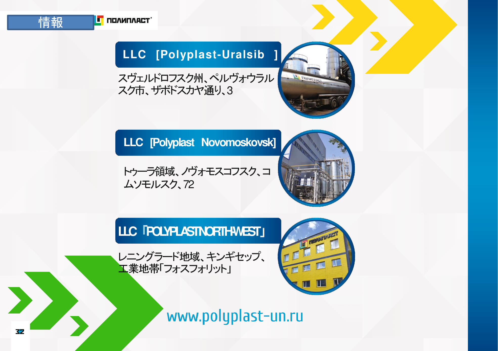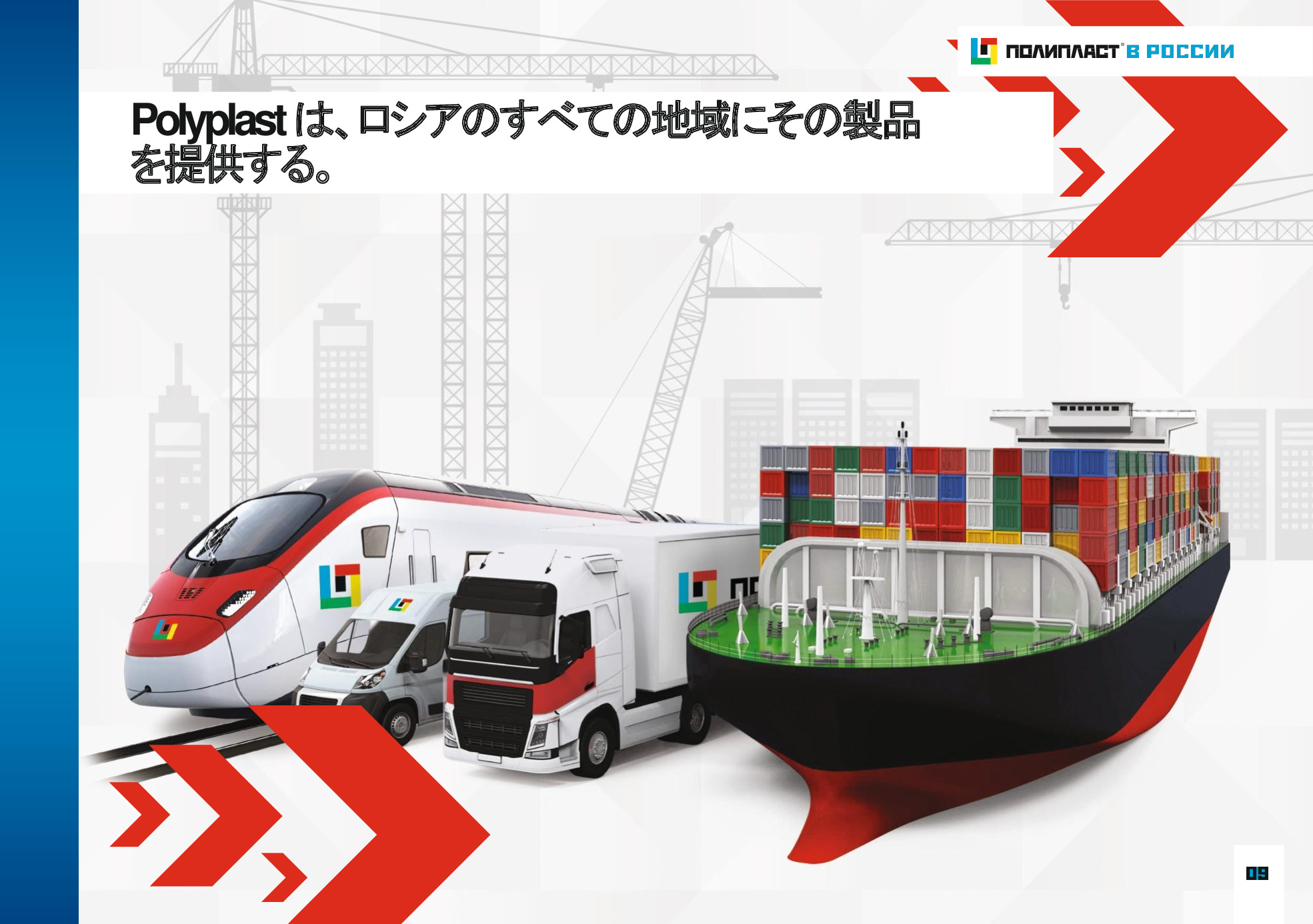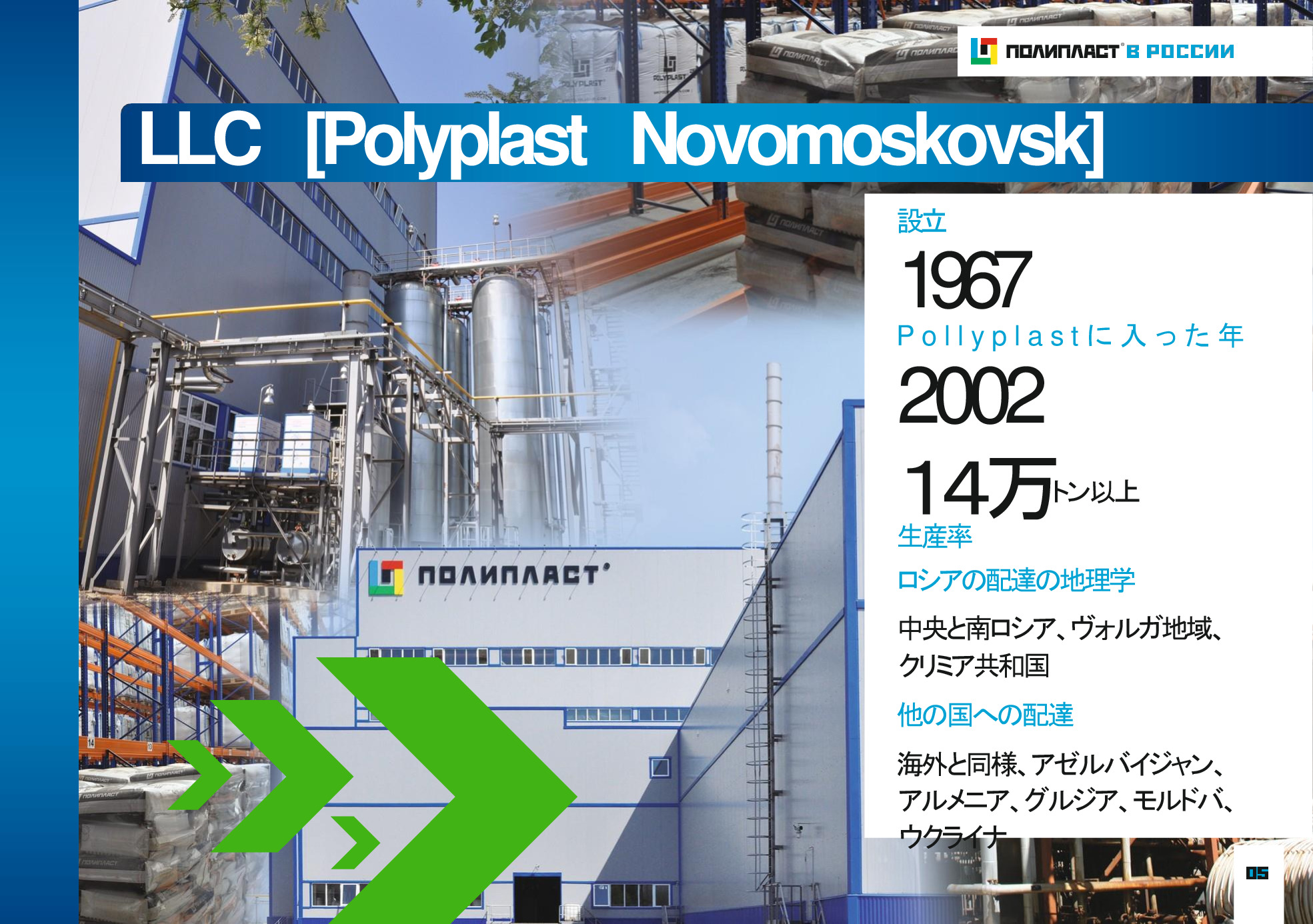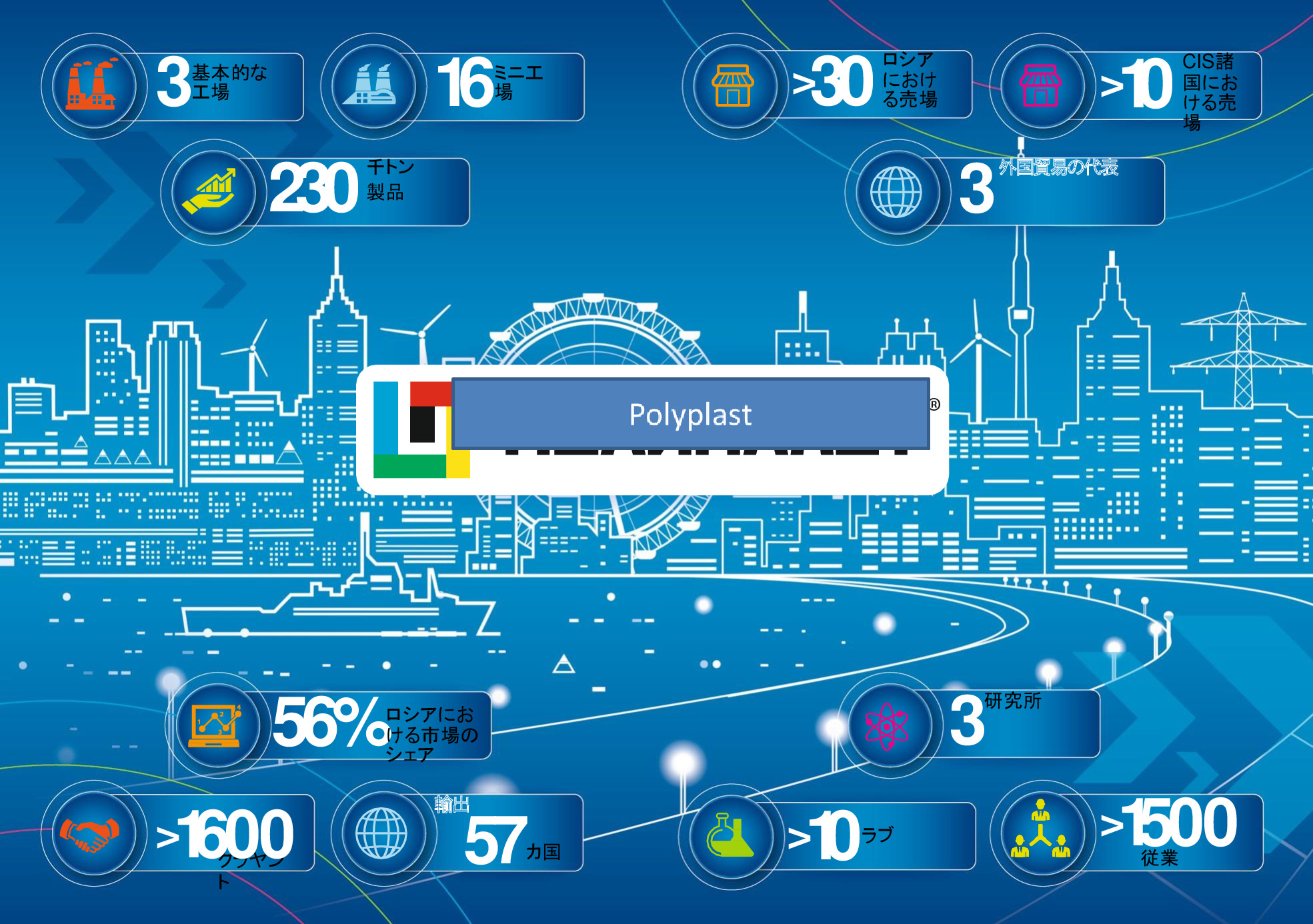 JSC[Poliplast]は、ロシア連邦最大ケミカルホールディングス国のさまざまな地域に位置する、3 つの有機合成工場が正常に動作のひとつである。同社の最新のテクノロジーの備わったモダンな生産と、分岐構造の事務所をロシアおよび CIS 諸国の全ての領域を包含する。これ全体は、見出し全体ロシアの領土カリーニング ラードから北東に建設業界のニーズにお応えした製品群の製品の最短期間でお届けすることができるだけでなく、CIS 諸国、フィンランド、ポーランド、オランダ、トルコ、イスラエル、アラブ首長国連邦、インド、ブラジル、南アフリカ共和国、いくつかの他の国にも輸出する。