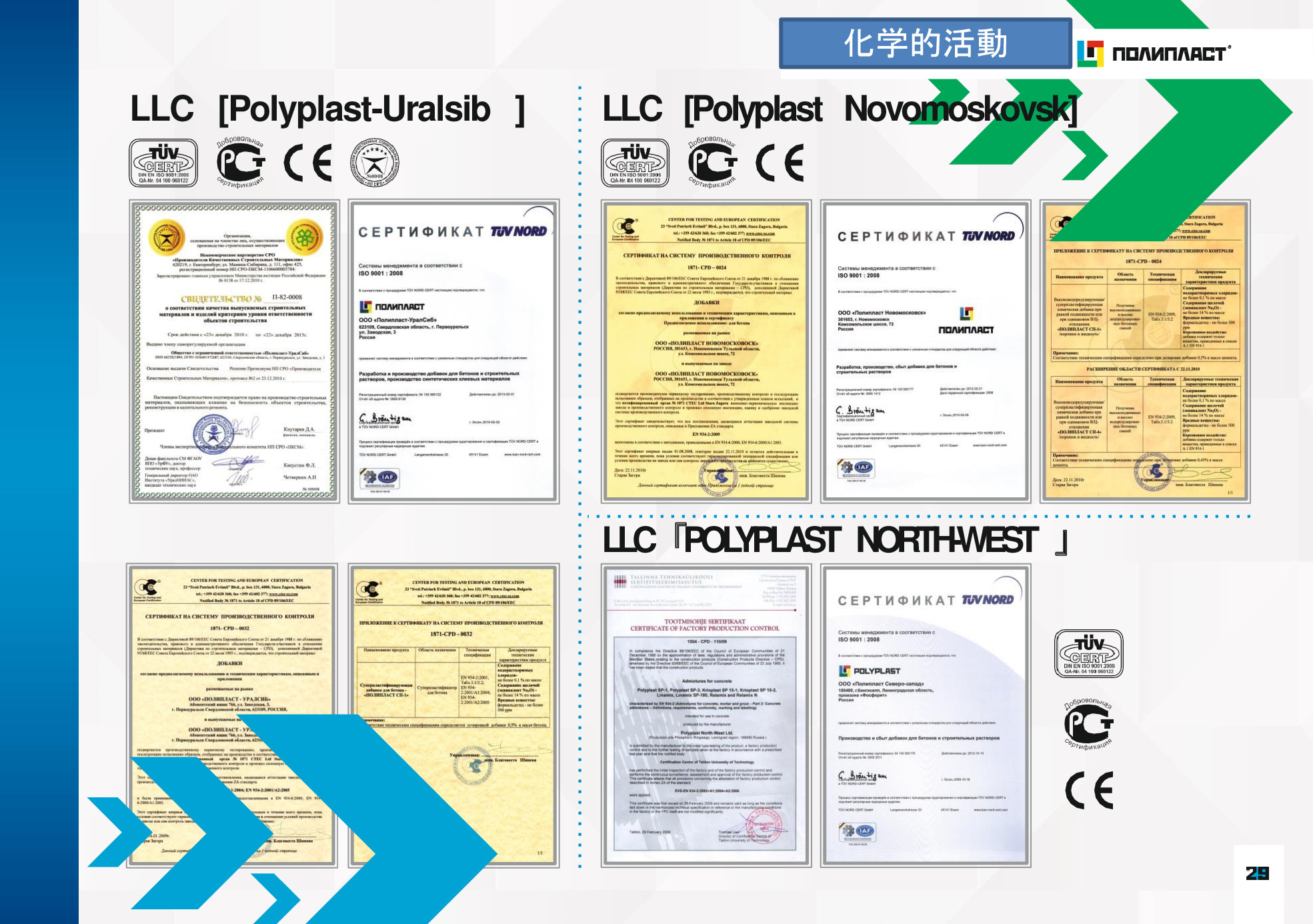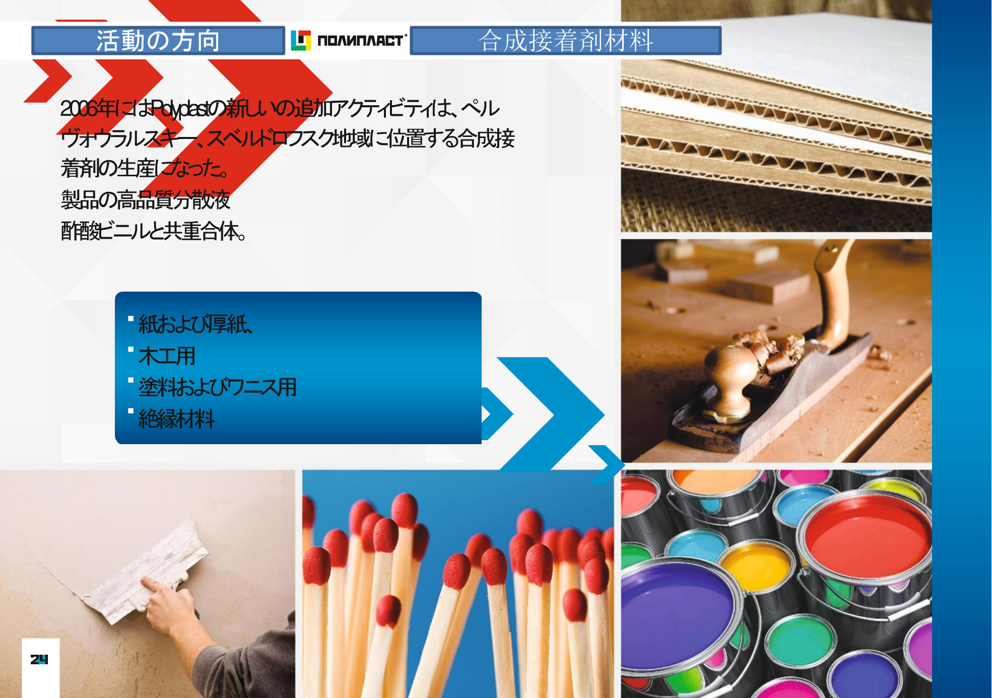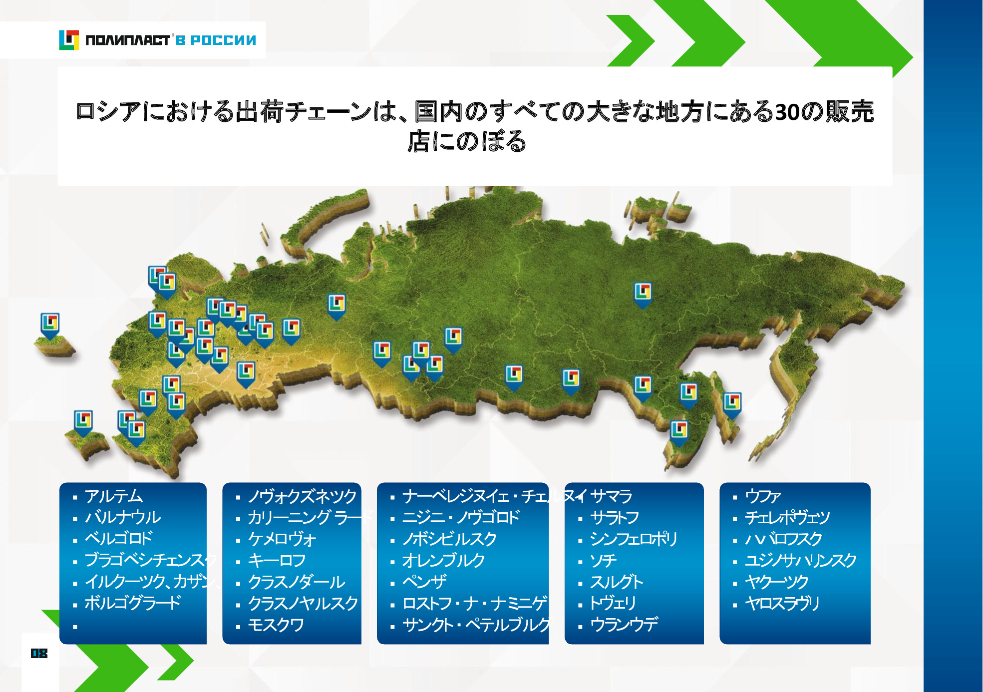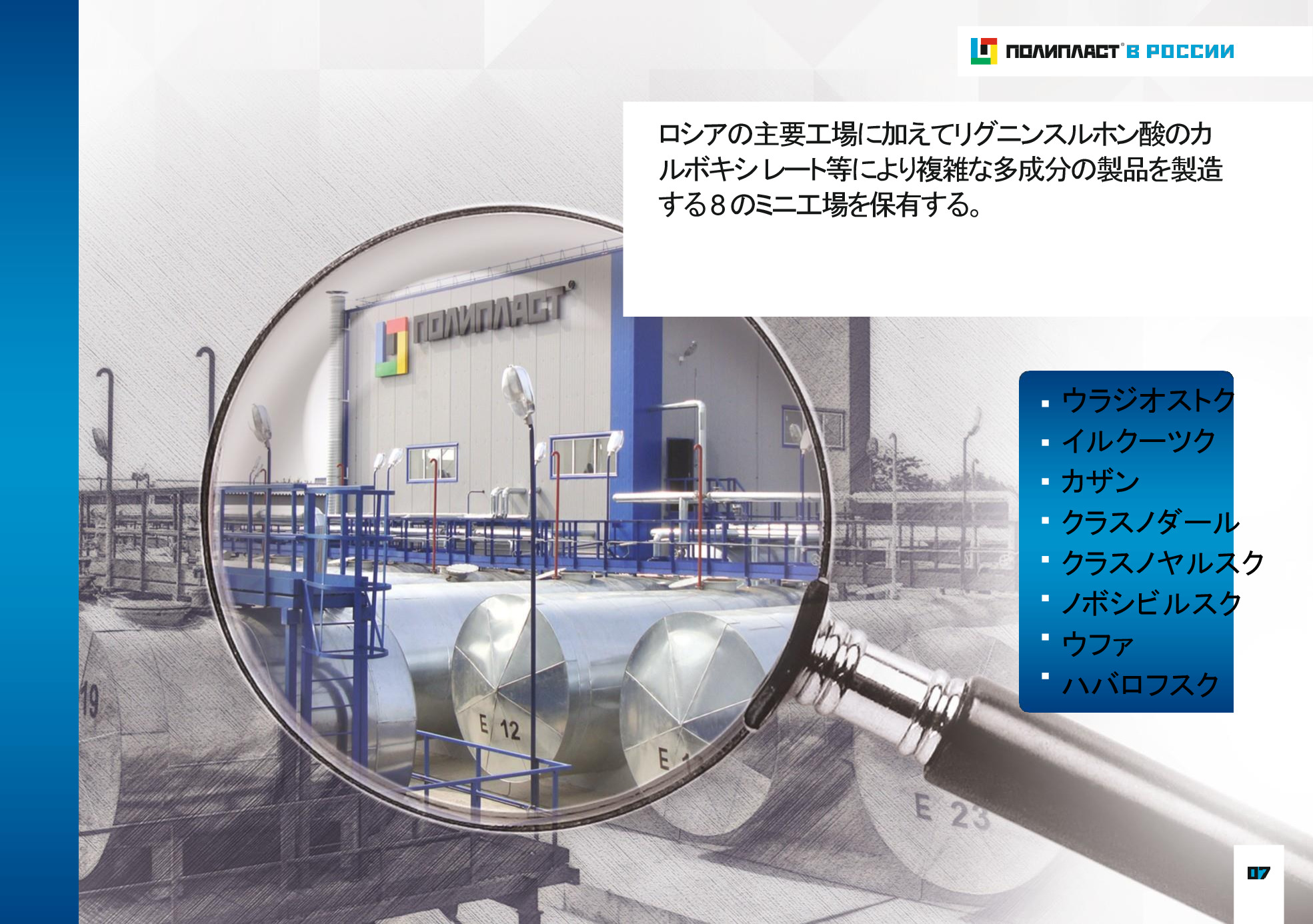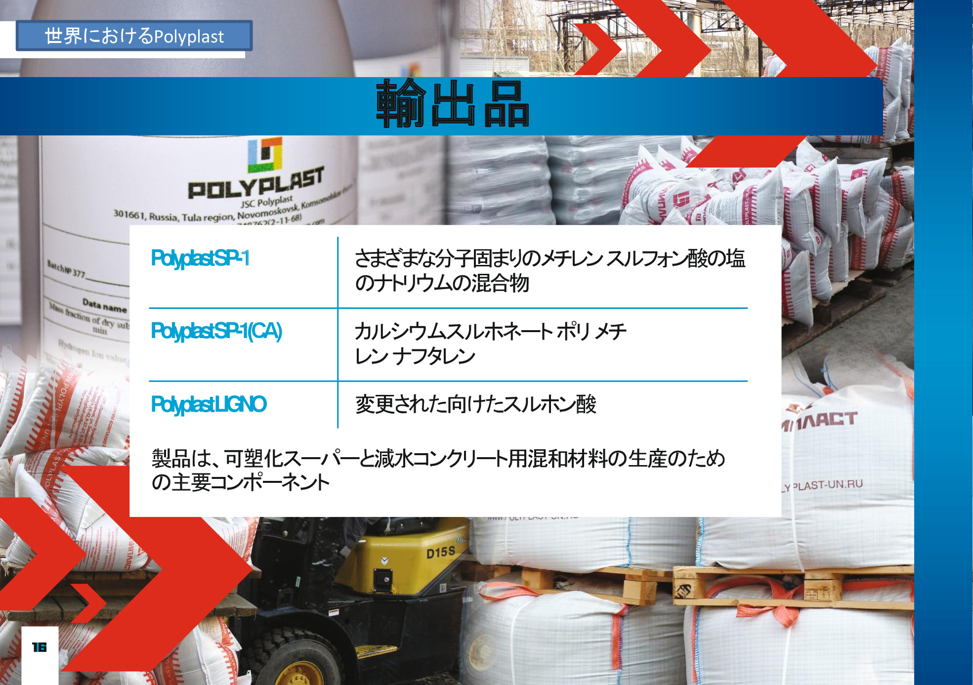 JSC[Poliplast]は、ロシア連邦最大ケミカルホールディングス国のさまざまな地域に位置する、3 つの有機合成工場が正常に動作のひとつである。同社の最新のテクノロジーの備わったモダンな生産と、分岐構造の事務所をロシアおよび CIS 諸国の全ての領域を包含する。これ全体は、見出し全体ロシアの領土カリーニング ラードから北東に建設業界のニーズにお応えした製品群の製品の最短期間でお届けすることができるだけでなく、CIS 諸国、フィンランド、ポーランド、オランダ、トルコ、イスラエル、アラブ首長国連邦、インド、ブラジル、南アフリカ共和国、いくつかの他の国にも輸出する。