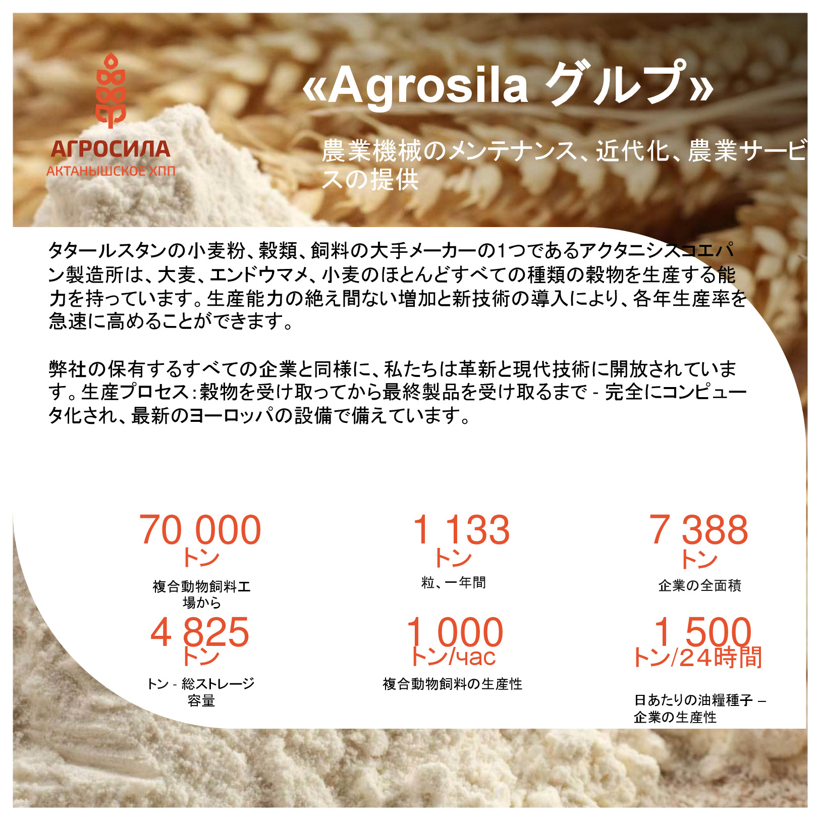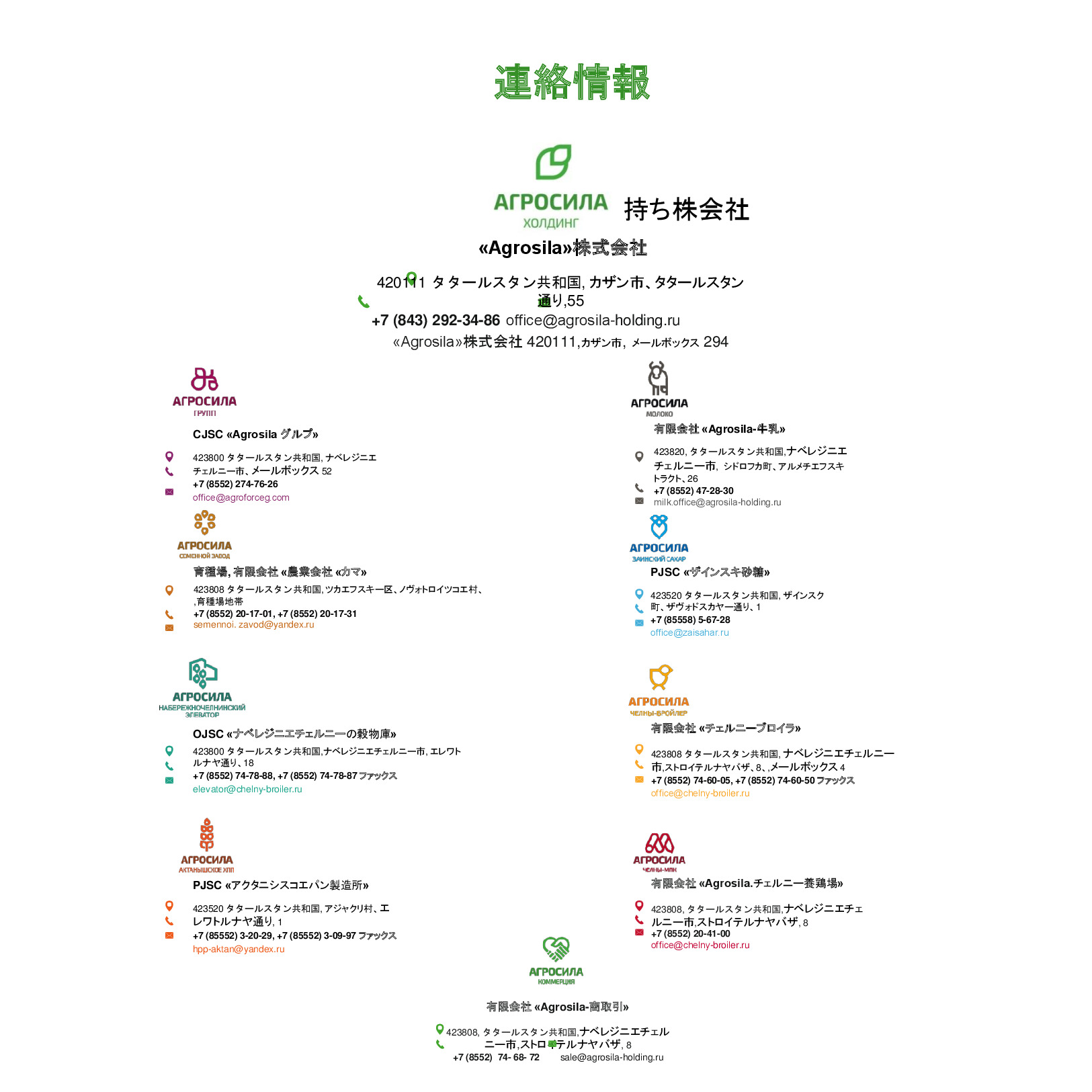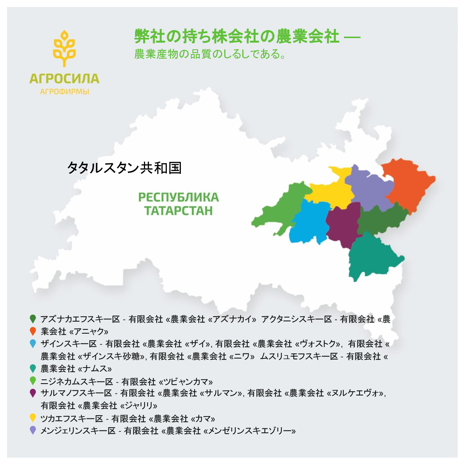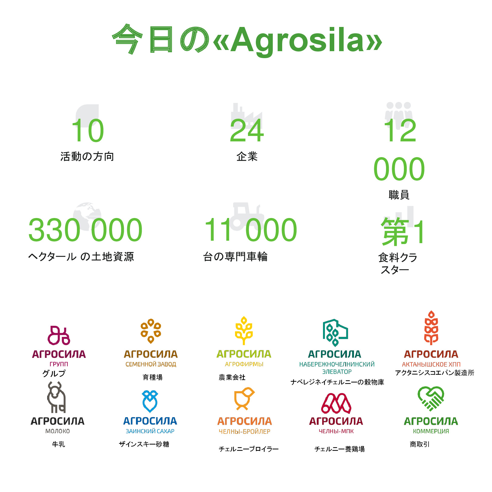 AGROSILAは、ロシアの最大の農業企業の1 つ、ヴォルガ地域の主要な農業生産者です。垂直統合型持株会社には、栽培、レセプション、倉庫、穀物および技術的な作物、家畜や家禽の生産、砂糖の生産の処理が含まれて、または完成品の販売及び農業機械のサービスなど。持株会社体制には、タタールスタン共和国の領土にある 24 の農業企業が含まれている。持株会社の企業は、各活動の分野でリーディング ポジションを獲得した。 「AGROSILA」持株会社の土地銀行量は、タタールスタン共和国のツカエブキー、アズナカエブスキー、ザインスキー、サルマノブスキー、アクタシンスキー、ニジネカムスクおよび ムスリュモヴスキー地区 32 万 4000 ヘクタールを超えている。現在、会社は、ロシアで最も大きい地主の 1 つ。農産物の最大のロシア生産国のトップ 10 を入力する予定。