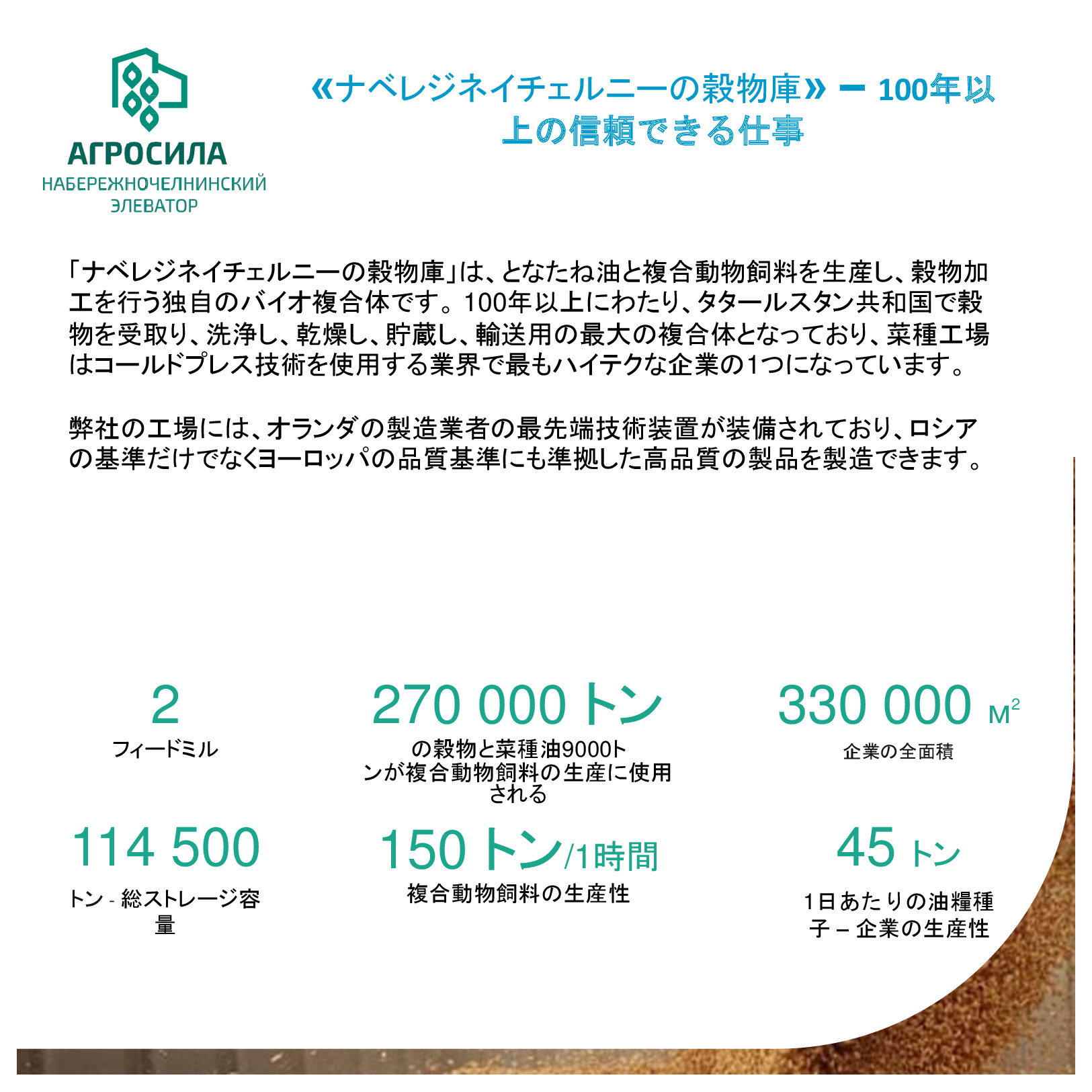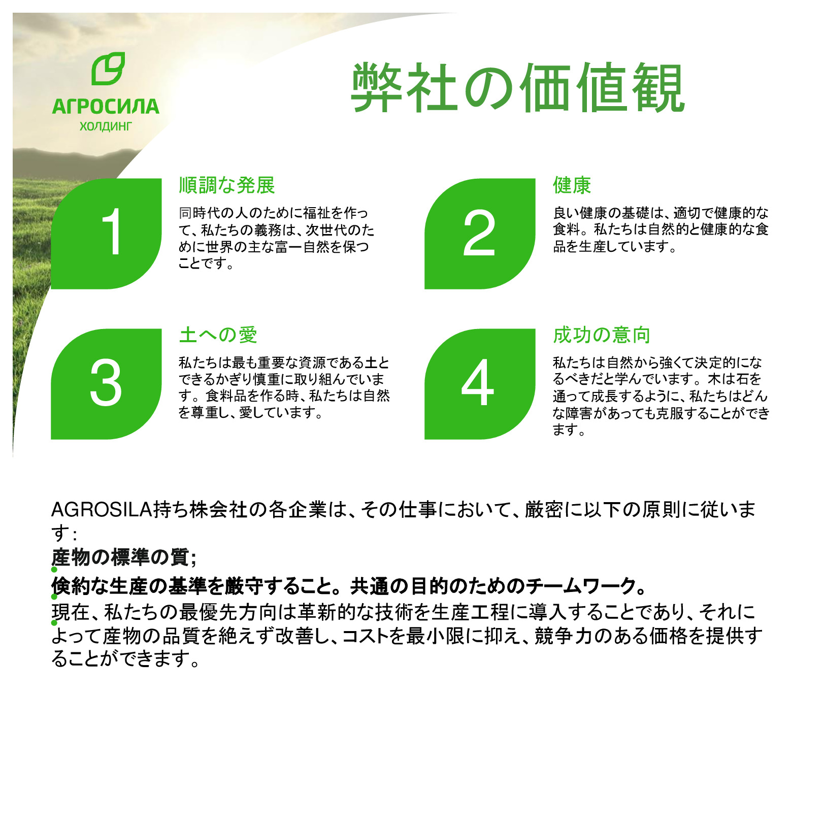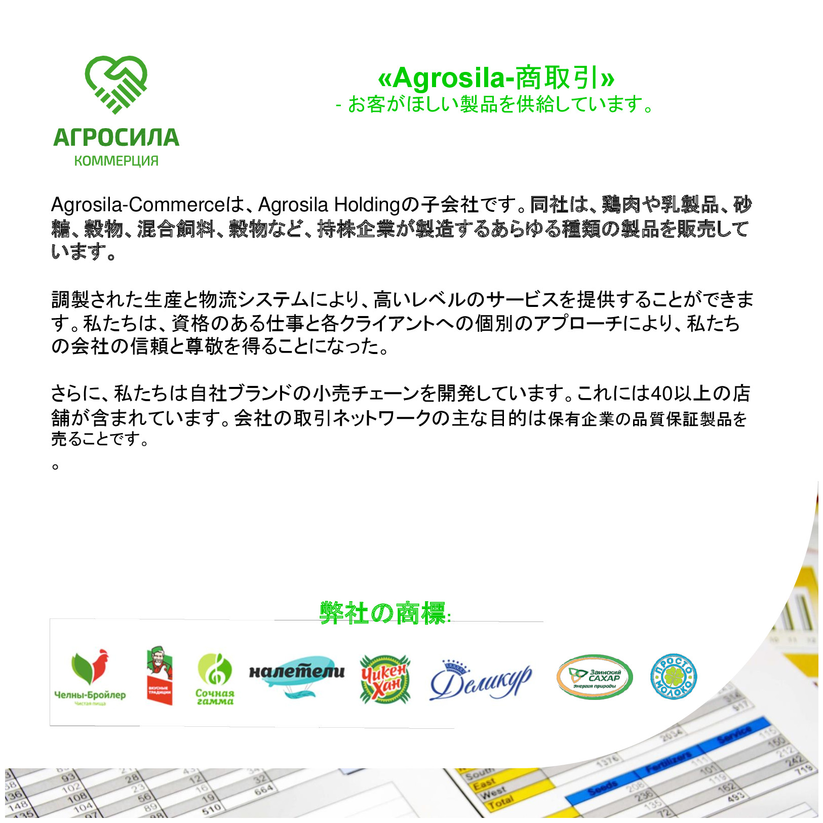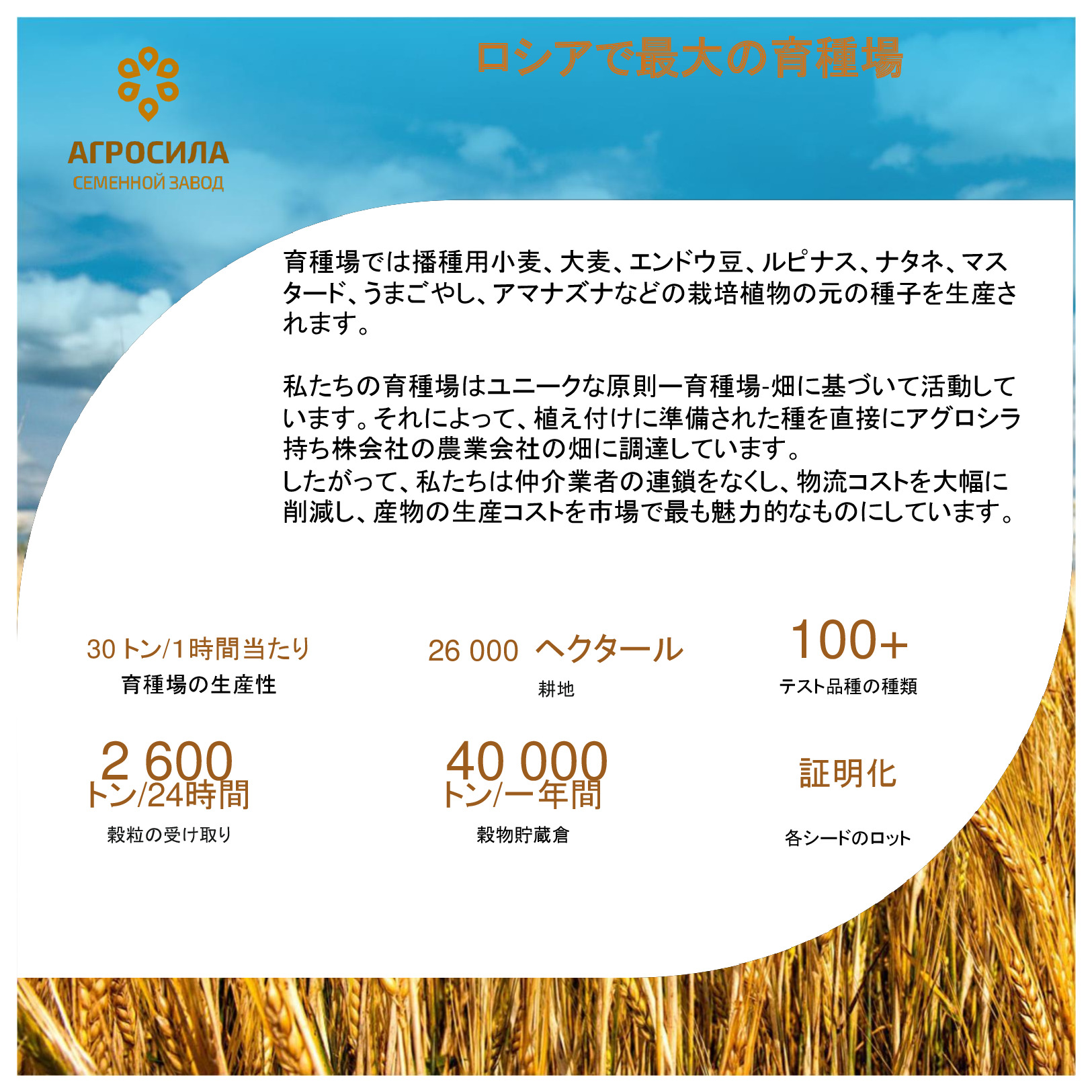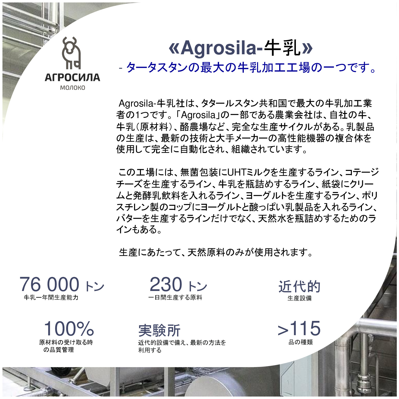AGROSILAは、ロシアの最大の農業企業の1 つ、ヴォルガ地域の主要な農業生産者です。垂直統合型持株会社には、栽培、レセプション、倉庫、穀物および技術的な作物、家畜や家禽の生産、砂糖の生産の処理が含まれて、または完成品の販売及び農業機械のサービスなど。持株会社体制には、タタールスタン共和国の領土にある 24 の農業企業が含まれている。持株会社の企業は、各活動の分野でリーディング ポジションを獲得した。 「AGROSILA」持株会社の土地銀行量は、タタールスタン共和国のツカエブキー、アズナカエブスキー、ザインスキー、サルマノブスキー、アクタシンスキー、ニジネカムスクおよび ムスリュモヴスキー地区 32 万 4000 ヘクタールを超えている。現在、会社は、ロシアで最も大きい地主の 1 つ。農産物の最大のロシア生産国のトップ 10 を入力する予定。