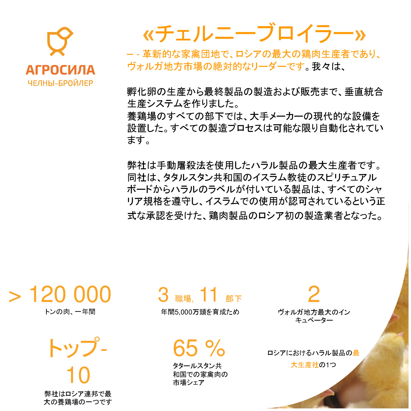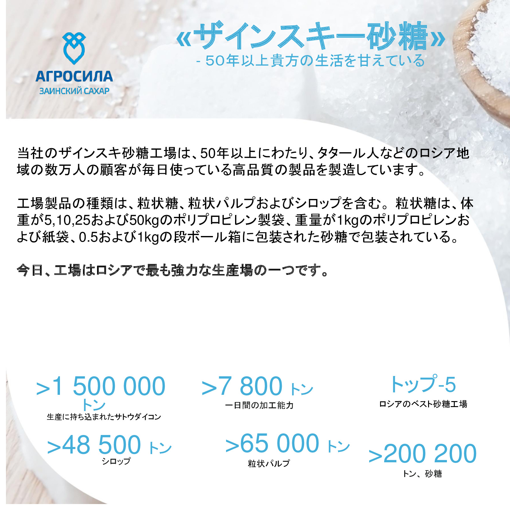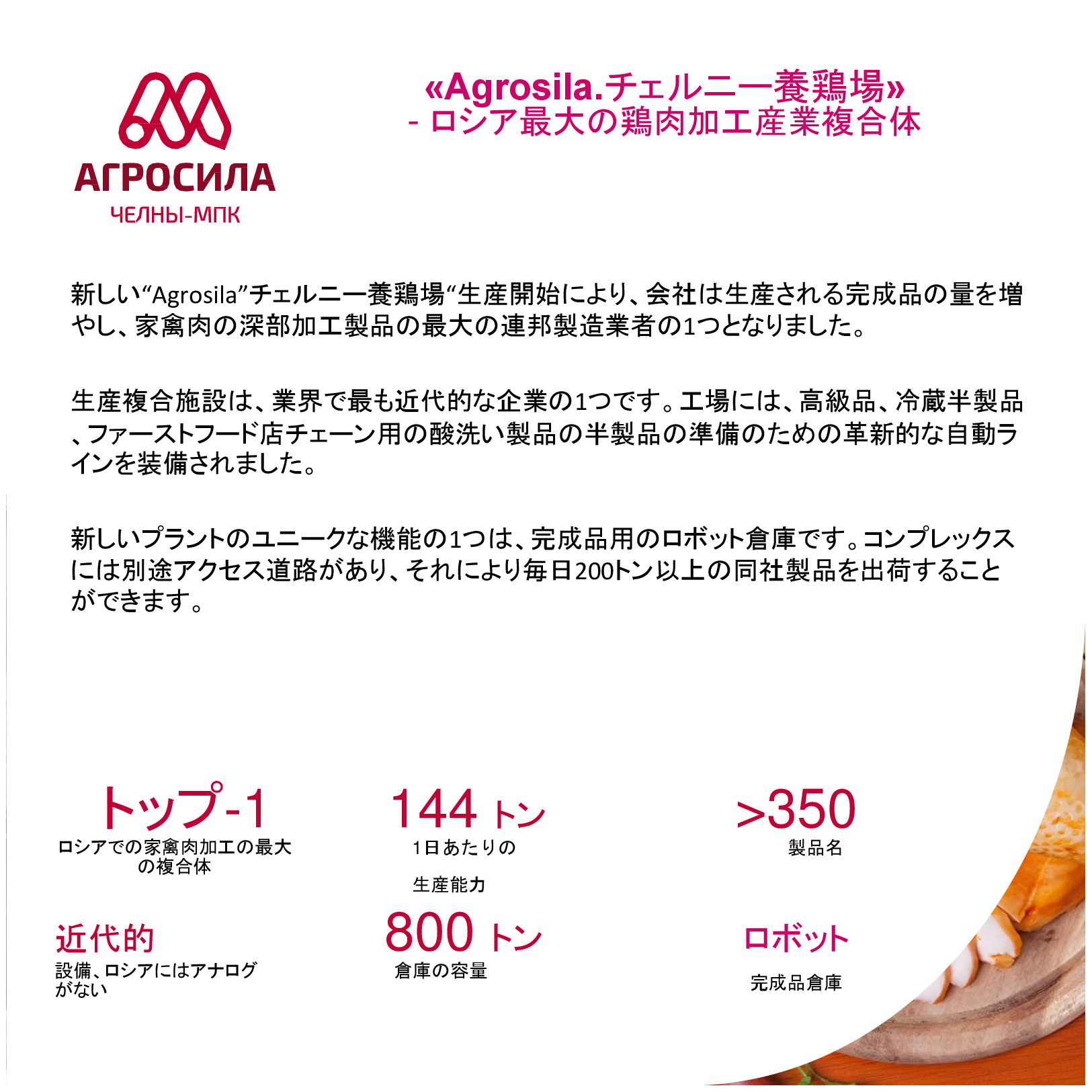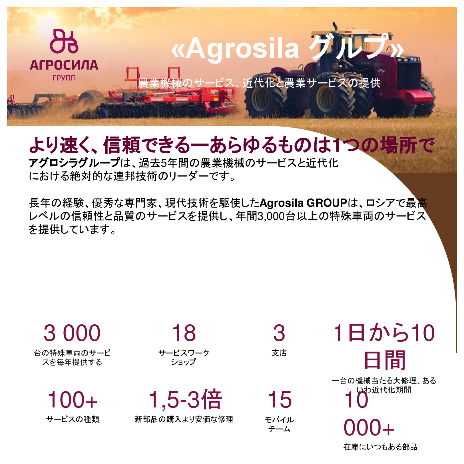 AGROSILAは、ロシアの最大の農業企業の1 つ、ヴォルガ地域の主要な農業生産者です。垂直統合型持株会社には、栽培、レセプション、倉庫、穀物および技術的な作物、家畜や家禽の生産、砂糖の生産の処理が含まれて、または完成品の販売及び農業機械のサービスなど。持株会社体制には、タタールスタン共和国の領土にある 24 の農業企業が含まれている。持株会社の企業は、各活動の分野でリーディング ポジションを獲得した。 「AGROSILA」持株会社の土地銀行量は、タタールスタン共和国のツカエブキー、アズナカエブスキー、ザインスキー、サルマノブスキー、アクタシンスキー、ニジネカムスクおよび ムスリュモヴスキー地区 32 万 4000 ヘクタールを超えている。現在、会社は、ロシアで最も大きい地主の 1 つ。農産物の最大のロシア生産国のトップ 10 を入力する予定。