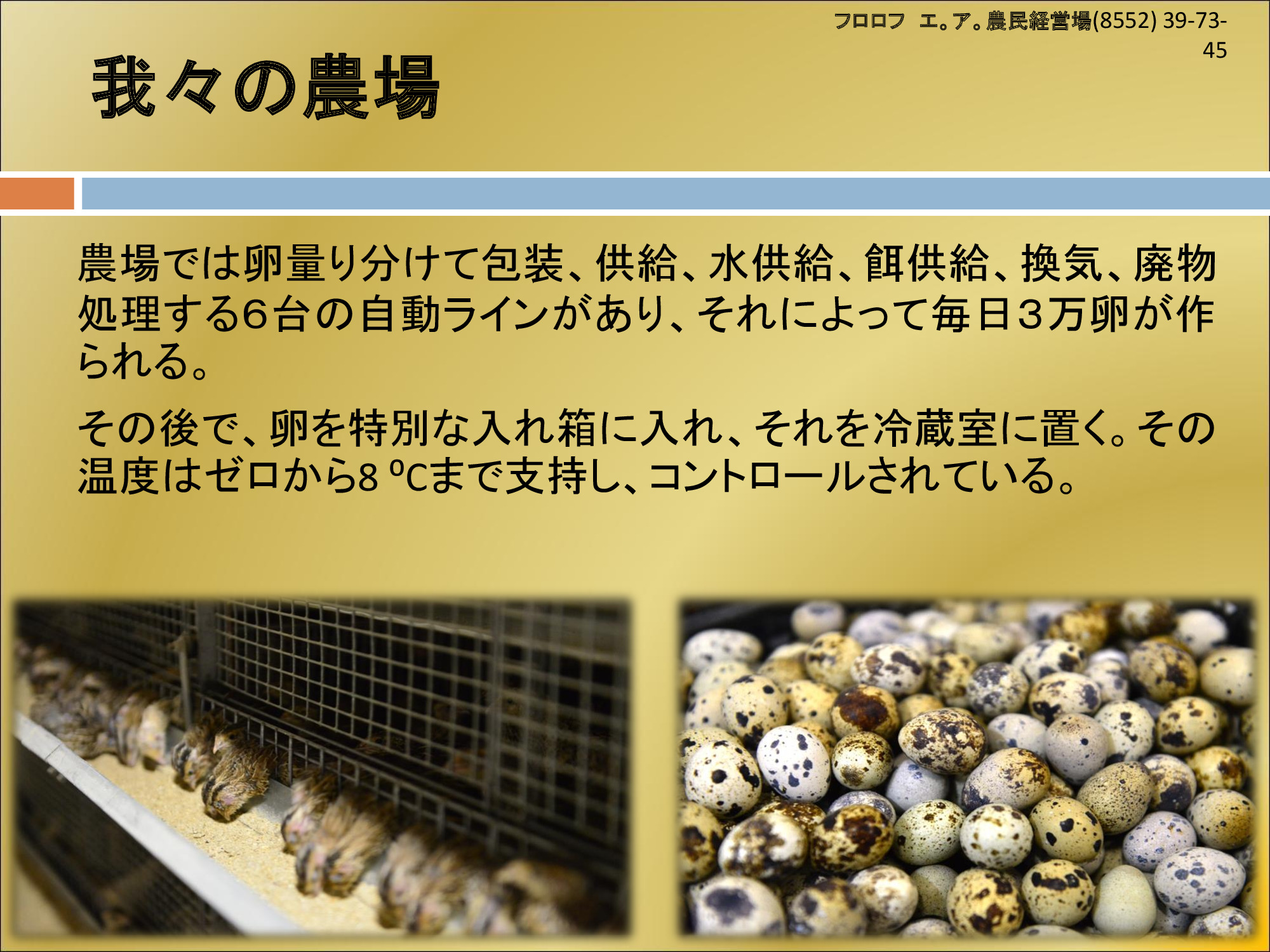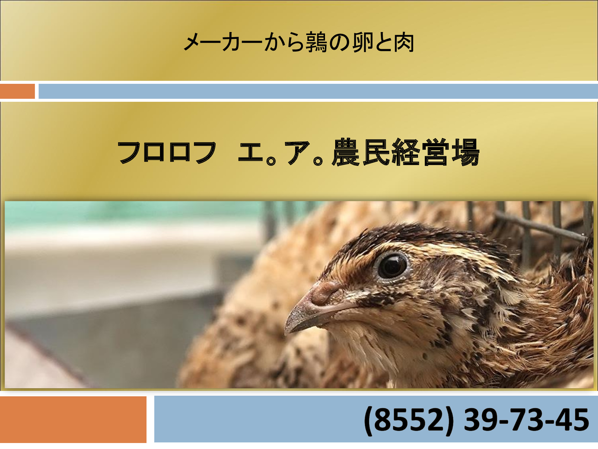 Peasant farm enterprise Frolova E.A.は、高品質輸入卸販売に興味があるヨーロッパウズラ卵の大規模チェーン店や食料生産の協力に誘う。私はバランスの取れた料理前にインキュベーターの卵を壊すから自社工場のフィードなどのプロセスを保証する。したがって、技術操作およびプロセスとコンプライアンスの厳格な監視は、ウズラの卵の生産のすべての段階で保証されている。私たちとの協力の利点: • 製品の優れた品質は、GOST 31655-2012 年の要件を満たしている。• 発注大量 (当社の生産ラインから毎日以上 3 万卵) の可能性• ウズラの卵と直接配信の最適なコスト。ウズラの卵は、鶏と比較しての利点の数を持っている。主なものは、便利な微細構造の低刺激性、高いコンテンツと栄養素、コレステロールの合計不在がサルモネラに感染の機会を排除する。ウズラの卵の卸売配達は小売り小売販売のためのこのプロダクトを導入する予定、大型と中型の取引企業の関連になる。さらに、この提案は企業食品業界で営業や自社製品を作るときにウズラの卵を使用しての興味深い可能性がある。