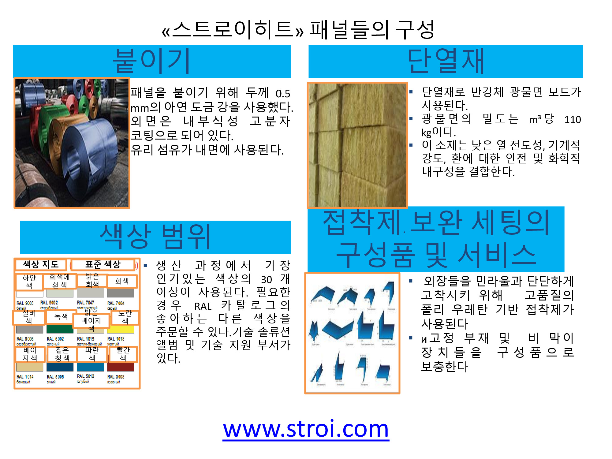 유한책임회사 게까 «스뜨로이꼼»은 두께50~250мм, 길이1000~12000 мм,너비1200 мм의 조립규격의 지붕과 벽체3겹쌘드위츠빠넬을 생산하고있습니다. 2014년에 너비1000~1900мм의 벽체빠넬과 너비가 1000мм인 5개 주름인 제형지붕빠넬생산을 보충하였습니다. 오늘날 «스뜨로이꼼»회사는 거품수지보온제를 붙인 빠넬들과 현무암광석재료로 만든 광물질솜을 리용한 불연내화열차단보온제견본들도 권고하고있습니다.