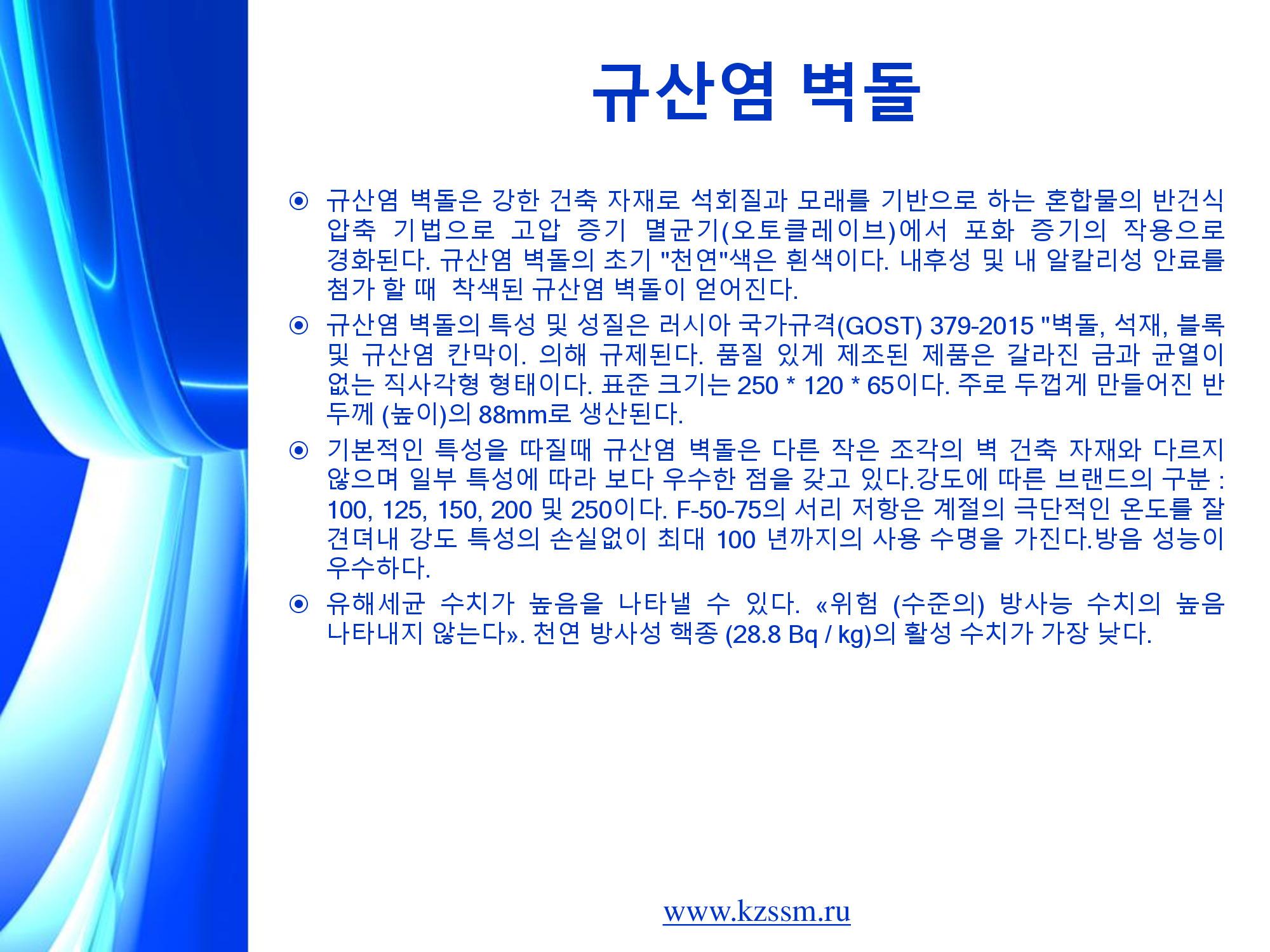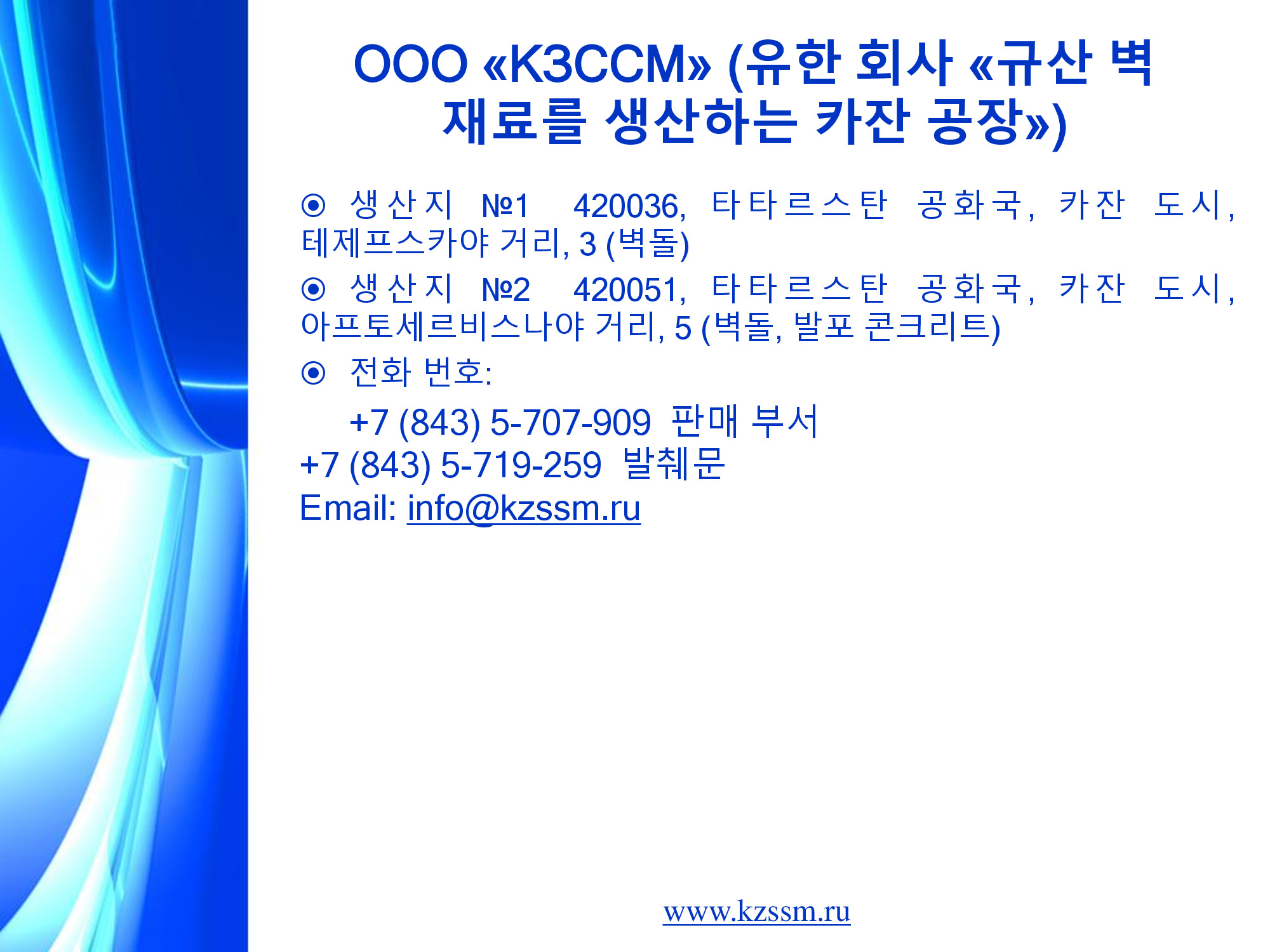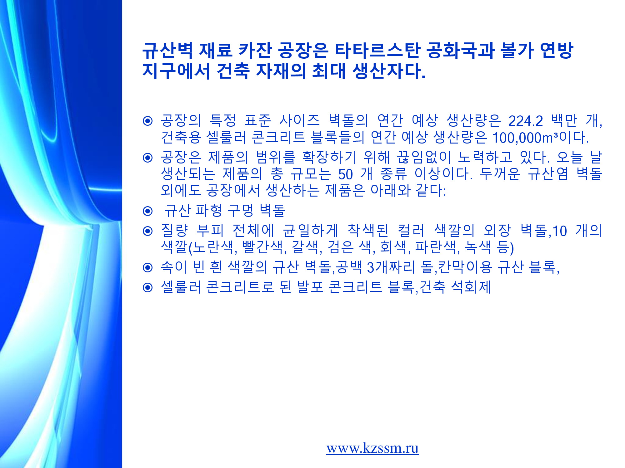 까잔씰리카트벽체자재공장은 따따르스딴공화국과 연해변강련방구 적으로 규모가 큰 건설자재생산지입니다. 공장의 생산능력은 년간 2억2천420만개의 벽돌, 10만м3의 다공성콩크리트블로크, 4만2천м3의 철근콩크리트부재입니다. 공장은 정상적으로 생산제품의 종류를 확대하고있습니다. 오늘날 3개의 생산현장들에서 생산되는 제품들의 일반목록은 200가지 이상입니다. 두꺼운 씰리카트벽돌외에도 공장에서는 다음의것들을 생산합니다. 1. 씰리카트돋음새김벽돌 2. 10여가지 색의 장식색벽돌 (노란색, 빨간색, 밤색, 검은색, 회색, 파란색, 풀색 등) 3. 속이 빈 흰씰리카트벽돌, 3층으로 속이 빈 씰리카트돌, 씰리카트간벽블로크 4. 다공콩크리트로 만든 기포콩크리트블로크, 건설용석회 5. 여러가지 종류의 철근콩크리트구조물들: 부하를 타산한 철근콩크리트층막판, 기초블로크들, 계단판 등