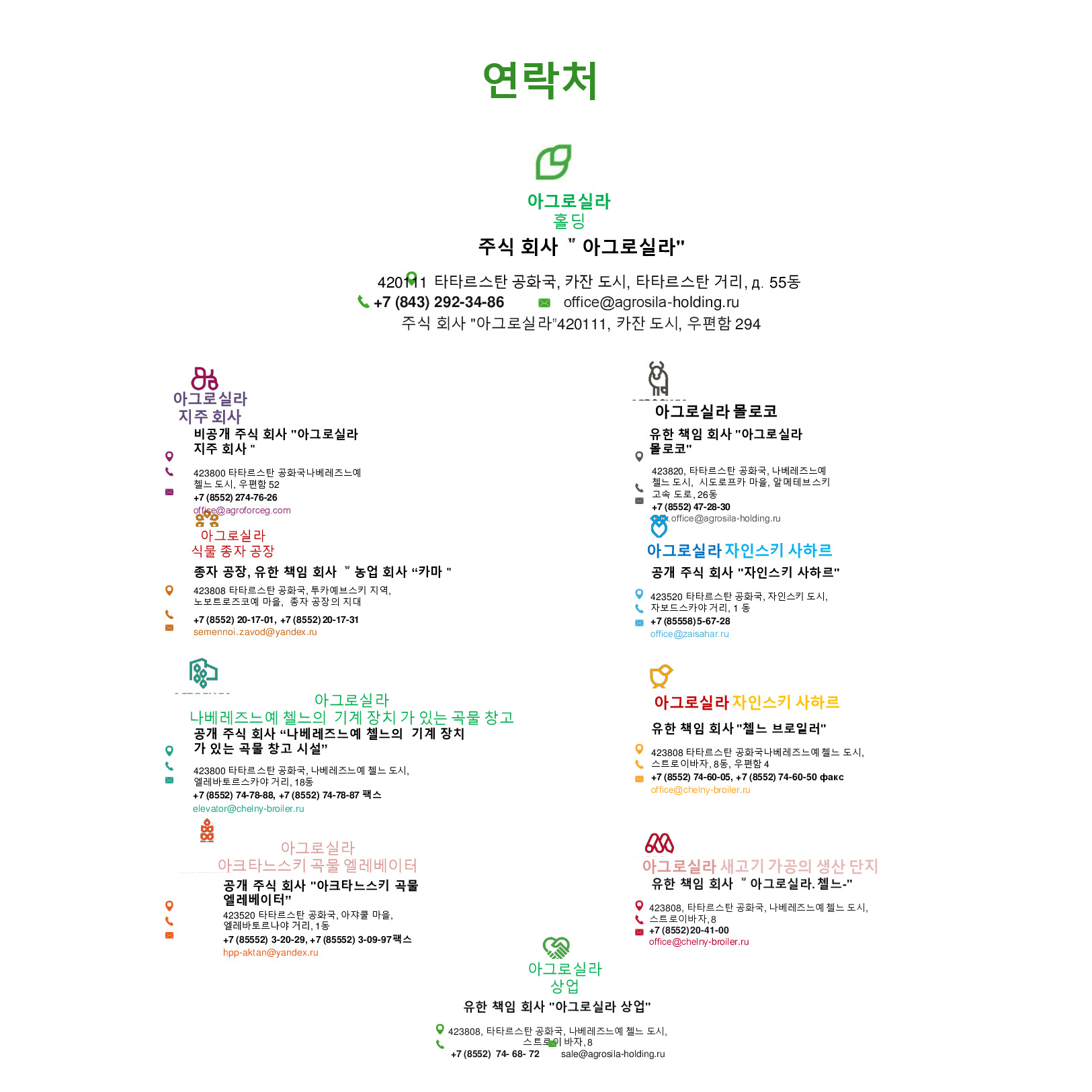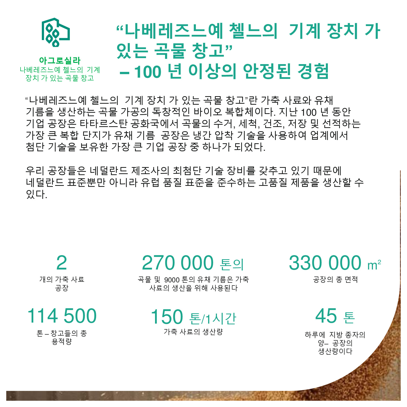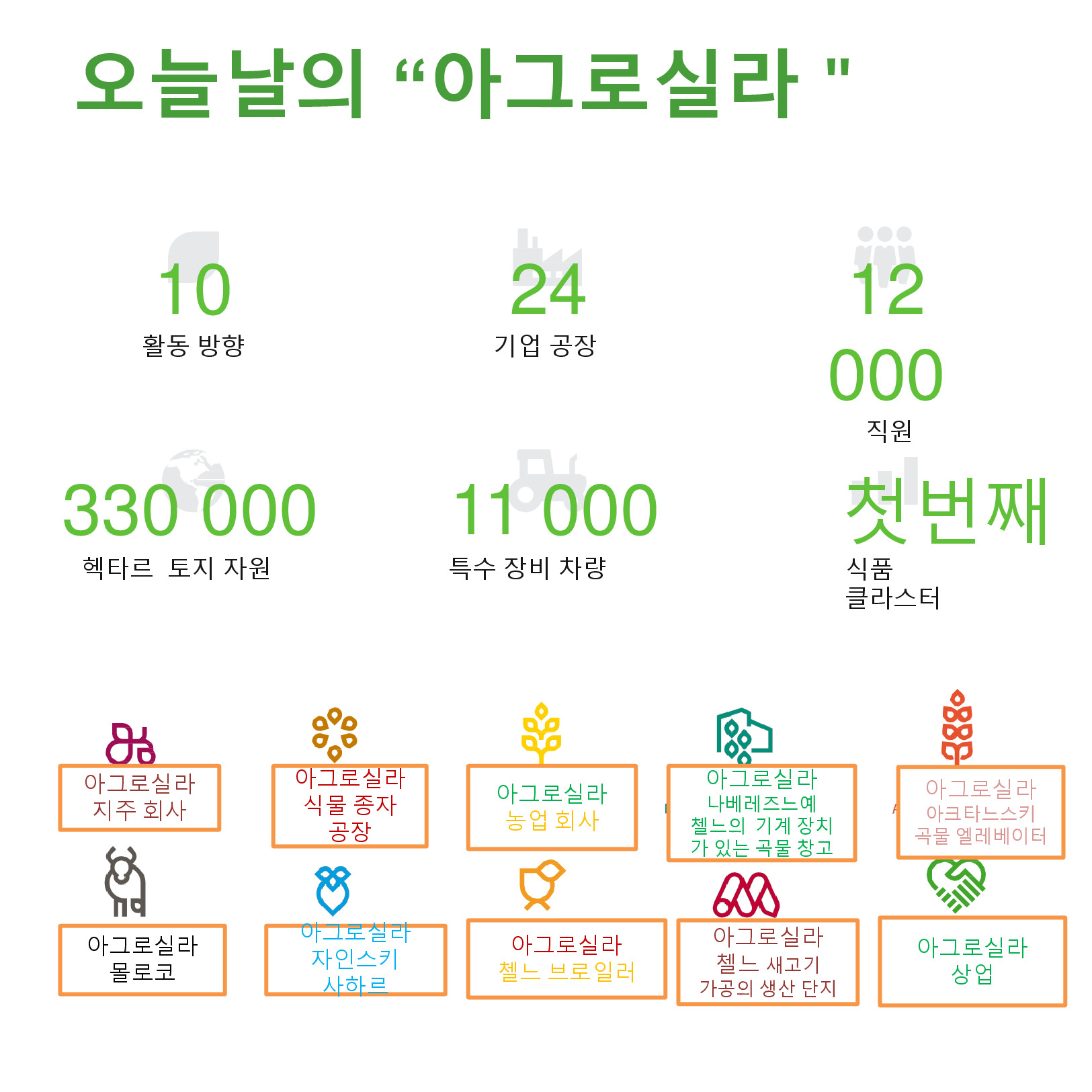 《아그로씰라》는 로씨야의 가장 큰 농업주주회사들중의 하나로서 볼가강류역지역에서 주도적인 농업생산업체입니다. 이 수직통합형주주회사는 알곡 및 기술작물의 재배와 인수, 보관, 가공, 축산과 가금제품생산, 사탕생산, 그리고 생산된 제품의 실현과 농경기술수단수리봉사를 진행하는 기업체들을 망라하고있습니다. 이 어미회사에는 따따르스딴공화국의 령내에 위치한 24개의 농경기업체들이 속합니다. 이 기업체들은 개개의 자기 활동분야에서 주도적위치를 차지하고있습니다. 따따르스딴공화국의 뚜까옙스크구역, 아즈나까옙스크구역, 자인스크구역, 악따늬슈구역, 니쥬네깜스크구역, 무슬류몹스크구역에 있는 《아그로씰라》주주회사의 토지면적은 32만4천헥타르이상에 달하고있습니다. 오늘 이 농업주주회사는 로씨야의 최대토지소유자들중의 하나입니다. 회사의 전망계획은 로씨야의 10대 최대농업생산자에 들어서는것입니다.