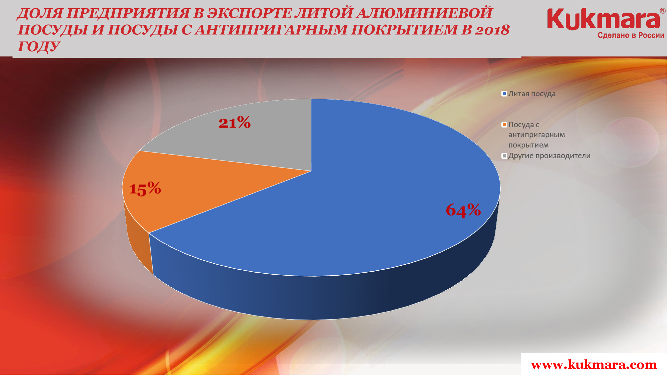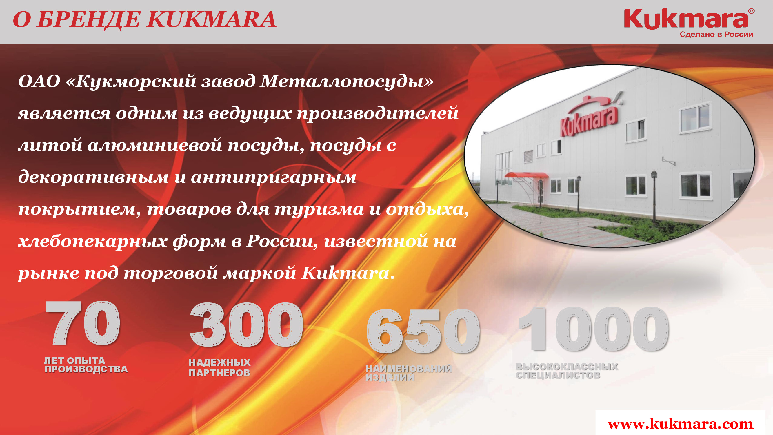 ОАО «Кукморский завод Металлопосуды» - одно из ведущих российских производителей литой толстостенной алюминиевой посуды, известной на посудном рынке под торговой маркой KUKMARA®. В настоящее время ассортимент продукции насчитывает более 400 наименований товаров. Деятельность завода развивается в следующих направлениях: 1. литая алюминиевая посуда; 2. посуда с антипригарным покрытием; 3. посуда с декоративным покрытием; 4. товары для туризма и отдыха; 5. хлебные формы.