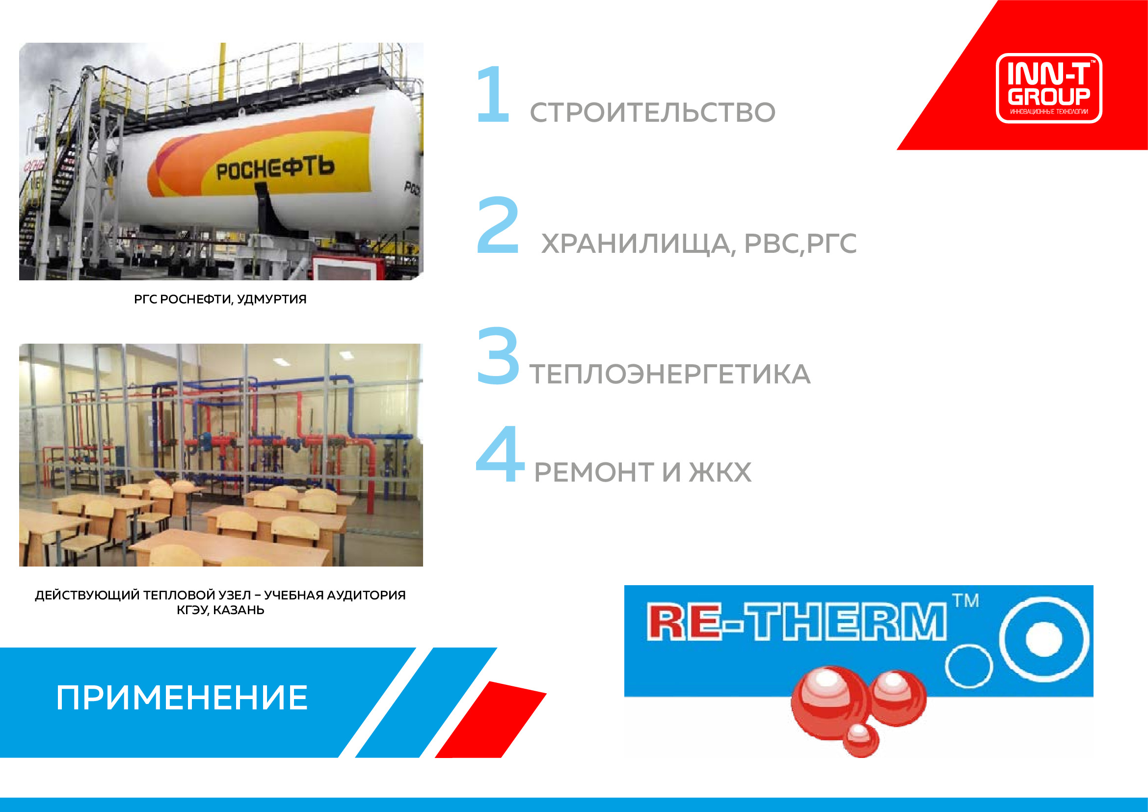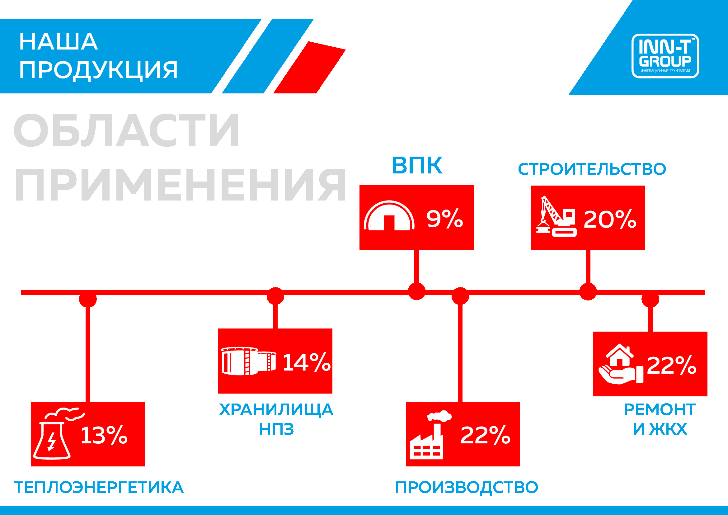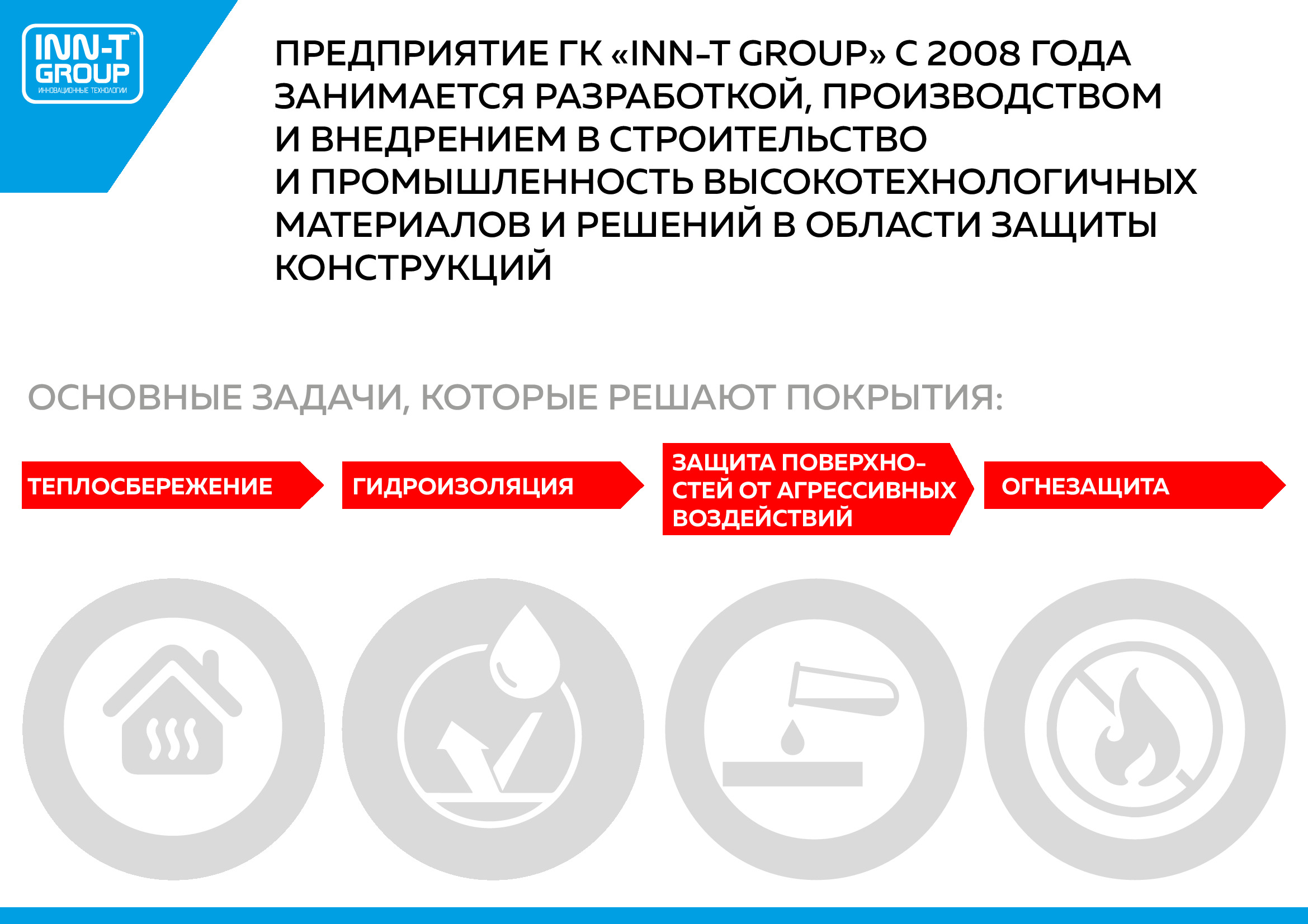 ООО «Инновационные технологии» занимается разработкой, производством и внедрением в строительство и промышленность высокотехнологичных материалов и решений в области защиты конструкций и обеспечения комфорта и безопасности человека. Основными задачами, которые решают покрытия, являются теплосбережение, гидроизоляция, защита поверхностей от механических и химических воздействий, огнезащита, улучшение микроклимата в помещениях. Все производимые продукты просты в применении, совместимы между собой, и в комбинации друг с другом составляют эффективные системы защиты сооружений. Собственная лаборатория позволяет разрабатывать и исследовать новые виды материалов и покрытий. В работе используются сырьевые компоненты мировых лидеров химической индустрии, ведется жесткий контроль входящего сырья и готовой продукции, поэтому качество выпускаемых продуктов всегда безупречно.