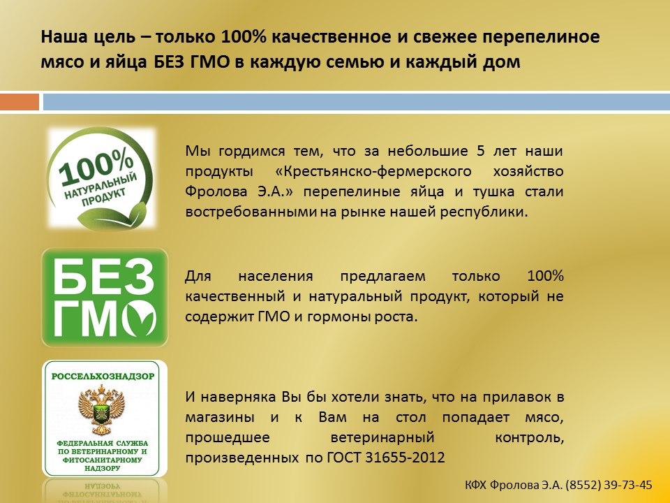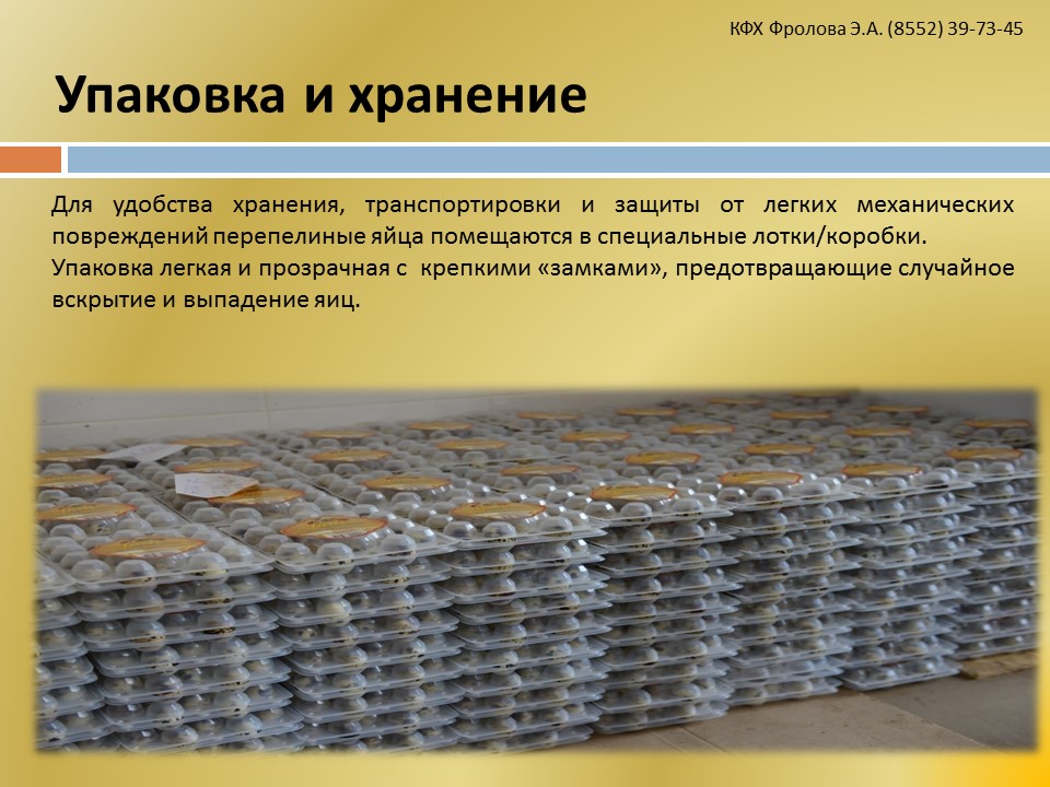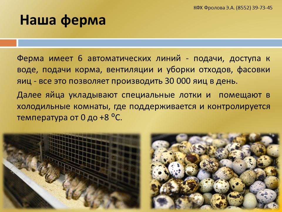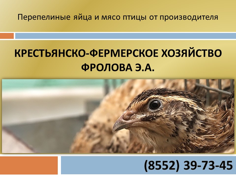 Крестьянско-фермерское хозяйство Фролова А. е. приглашает к сотрудничеству крупные сетевые магазины и производства продуктов питания, которые заинтересованы в оптовых поставках качественного перепелинного яйца. Мы гарантируем, что все процессы - от закладки яиц в инкубатор до приготовления сбалансированных кормов на нашей собственной фабрике. Таким образом, строгий контроль за соблюдением технологических операций и процессов обеспечивается на всех этапах производства перепелиных яиц. Преимущества сотрудничества с нами: • Отличное качество продукции, соответствует требованиям ГОСТ 31655-2012; • Возможность заказа большого количества товара (более 30 тыс. яиц ежедневно с наших производственных линий); • Оптимальная стоимость перепелиных яиц и прямые поставки. Яйца перепелов имеют ряд преимуществ по сравнению с куриными. Основными из них являются гипоаллергенность, высокое содержание полезных микроэлементов и питательных веществ, полное отсутствие холестерина, исключена вероятность заражения сальмонеллой. Оптовые поставки перепелиных яиц будут актуальны для крупных и средних торговых компаний, в ассортименте которых планируется представить этот продукт для розничной продажи. Кроме того, это предложение может быть интересно для компаний, работающих в пищевой промышленности и использование перепелиных яиц при приготовлении своей продукции.