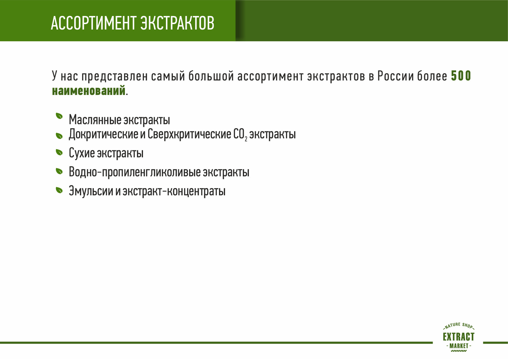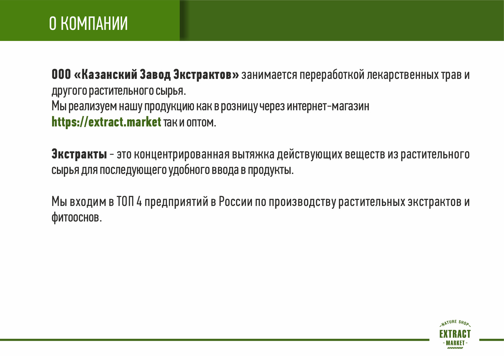 Казанский завод экстрактов. Предприятие по производству и продаже экстрактов из российского растительного сырья. Мы входим в ТОП-4 предприятий по производству растительных экстрактов и фитоносов в России. У нас представлен самый большой ассортимент экстрактов в стране - более 500 видов. Это в основном маслянные экстракты, сверхритические и докритические СО2 экстракты, сухие экстракты, водно-пропиленгликолевые экстракты, эмульсии и экстракт-концетраты.