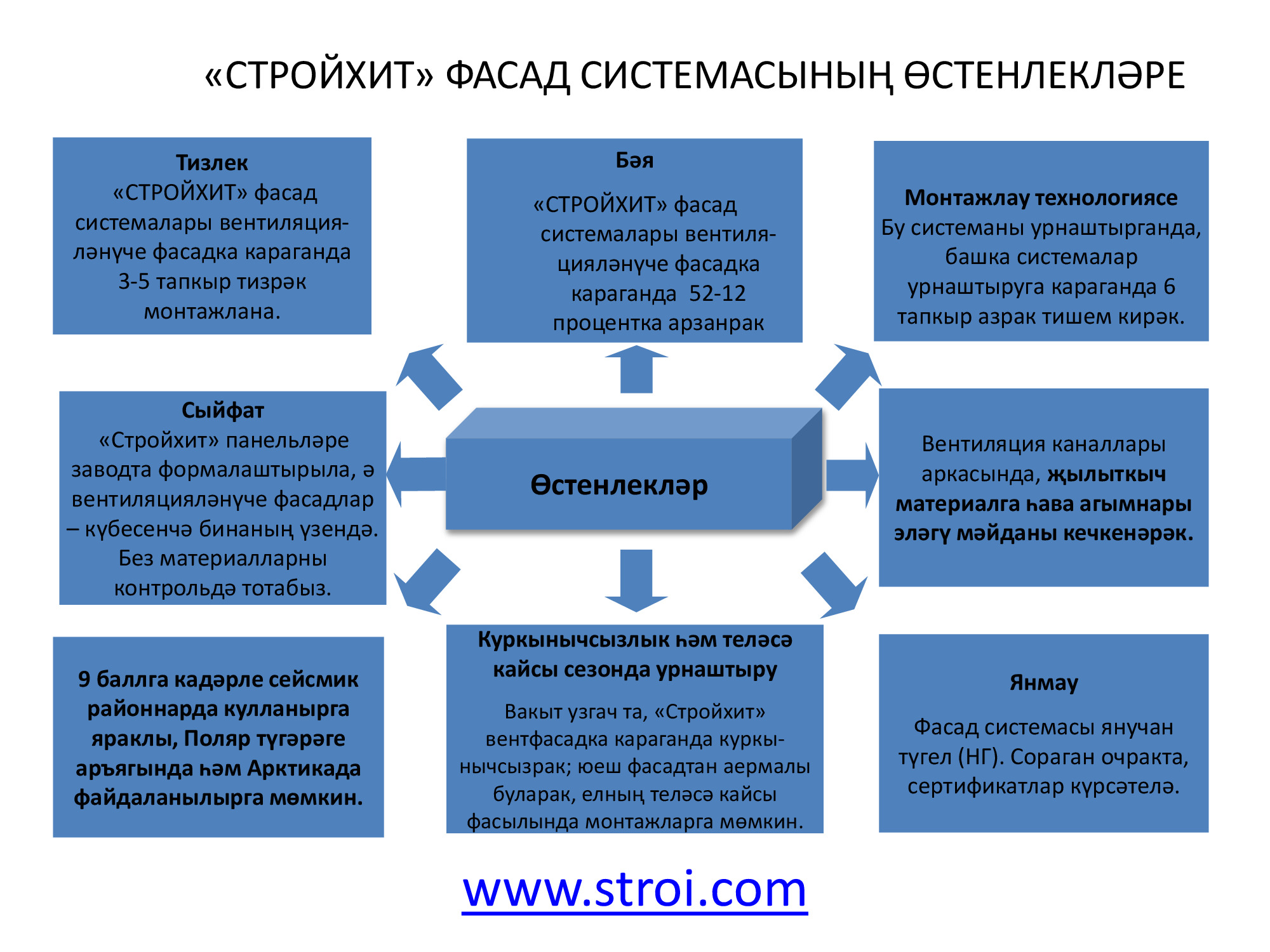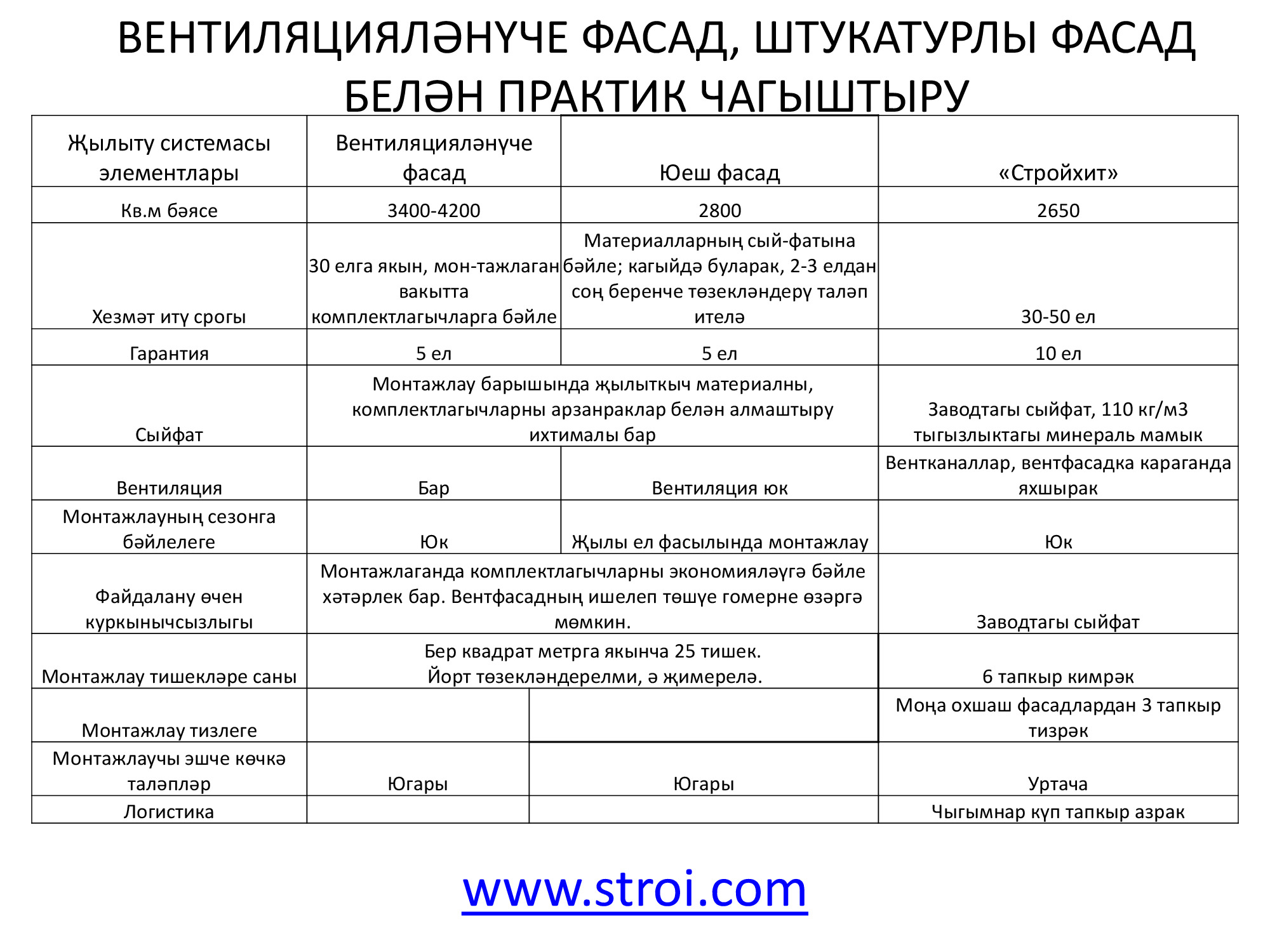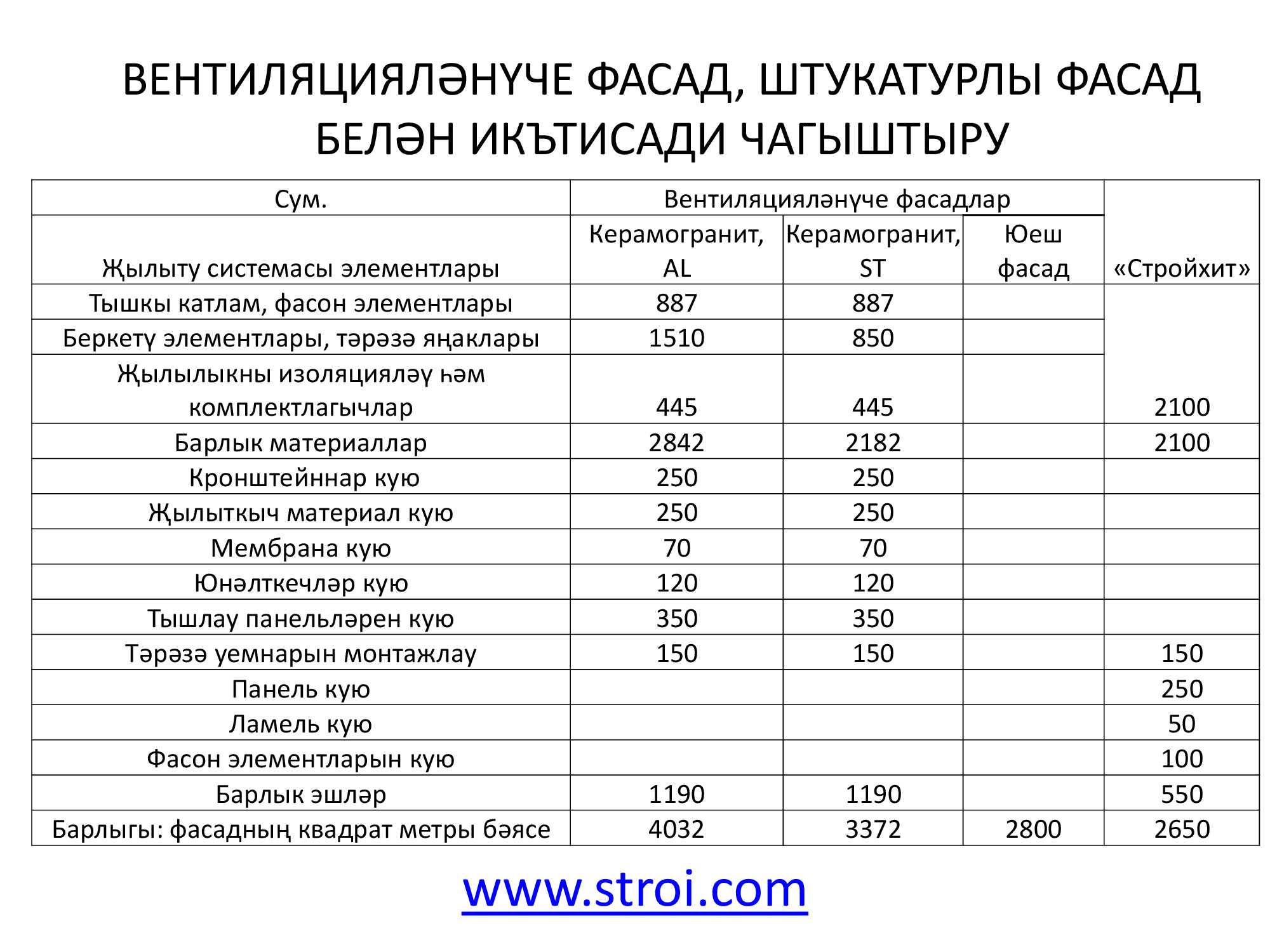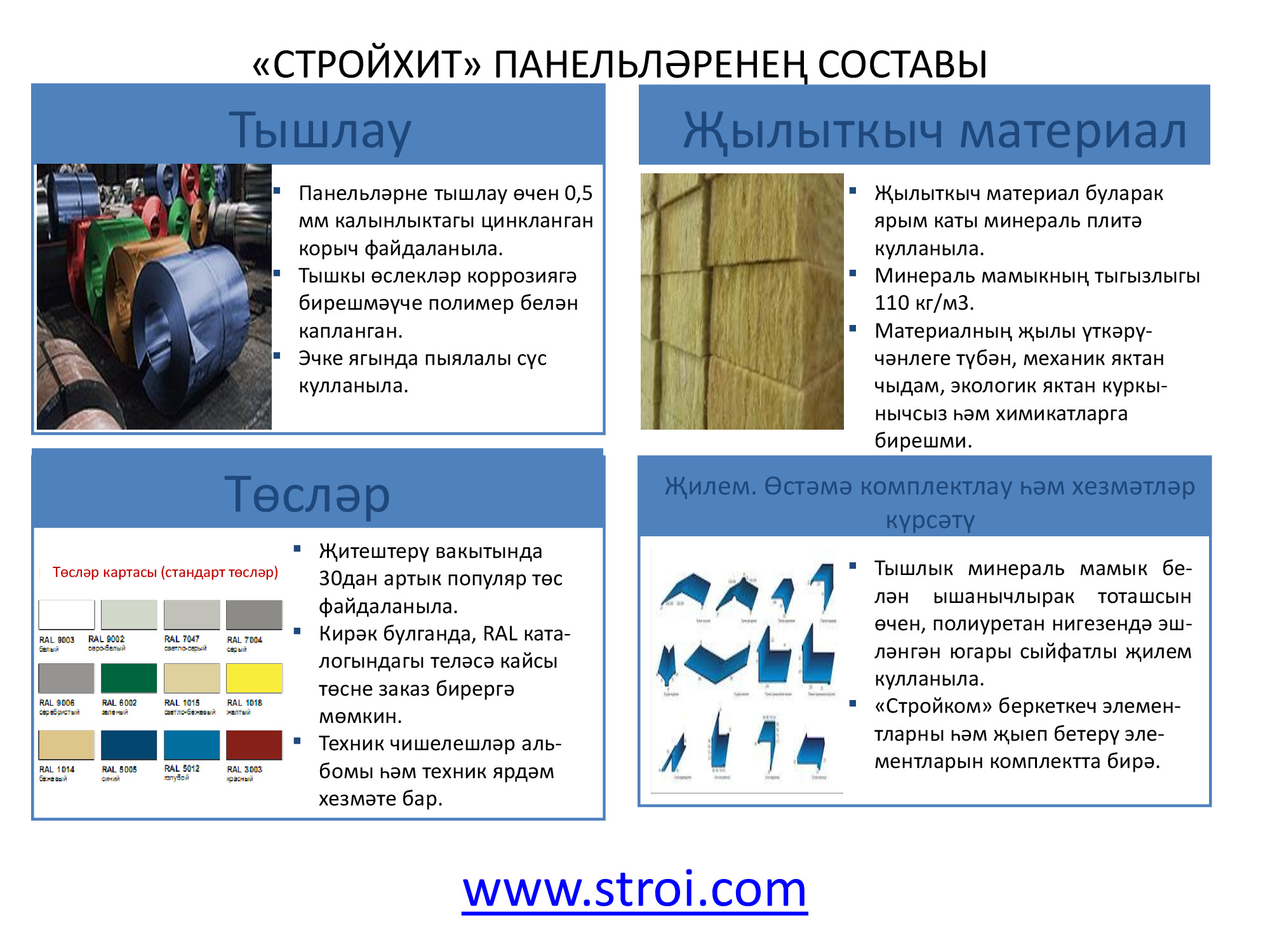 "Стройком" ДК ҖЧҖ монтаж параметрлары 50 мм башлап 250 мм кадәр (калынлыгы), 1000 мм башлап 12000 мм кадәр (озынлыгы), 1200 мм (киңлеге) тәшкил иткән өч катлы түбә һәм стена сэндвич-панельләре җитештерә. 2014 елда киңлеге 1000 мм башлап 1190 мм кадәрле стена панельләре, киңлеге 1000 мм тәшкил иткән, биш сырлы-трапециясе булган түбә панельләре җитештерү буенча өстәмә линия кертелде. "Стройком" бүген пенополистирол (пенопласт) рәвешендәге җылыткыч белән панельләр, шулай ук базальт тау токымнары нигезендә минерал мамыктан янгынга каршы торучан итеп ясалган, янмый торган җылылык изоляцияләүче җылыткычы булган модельләр тәкъдим итә.