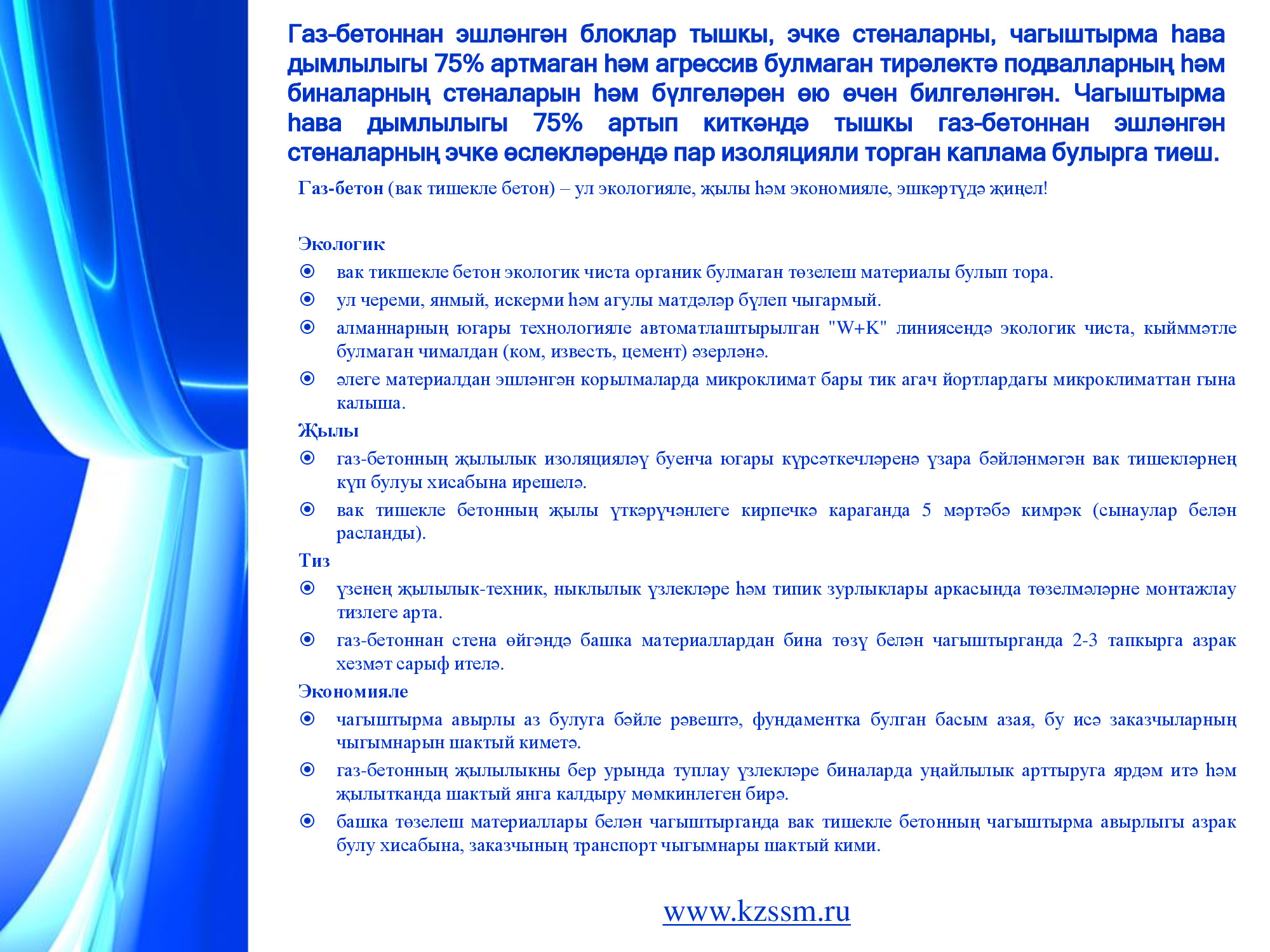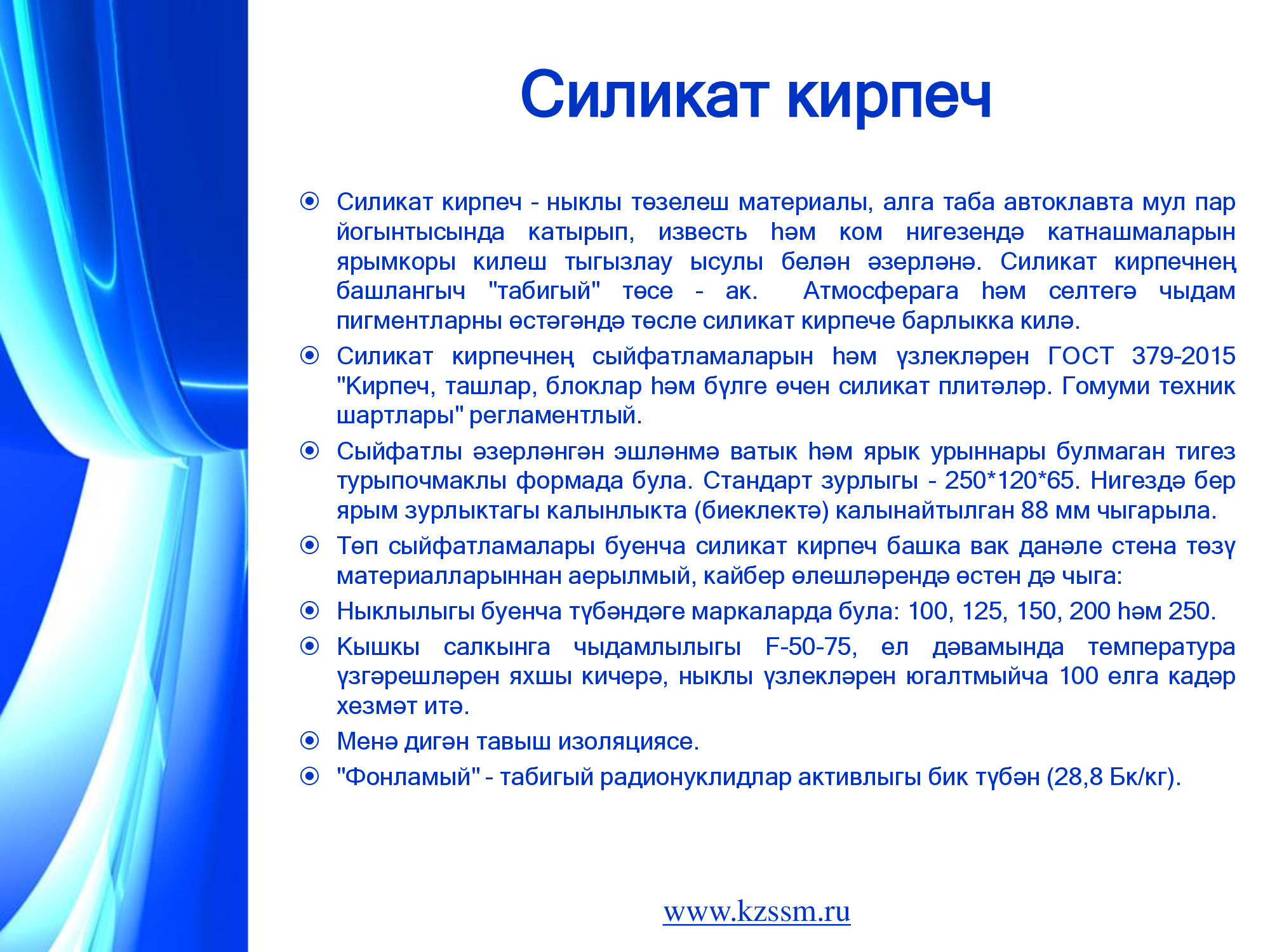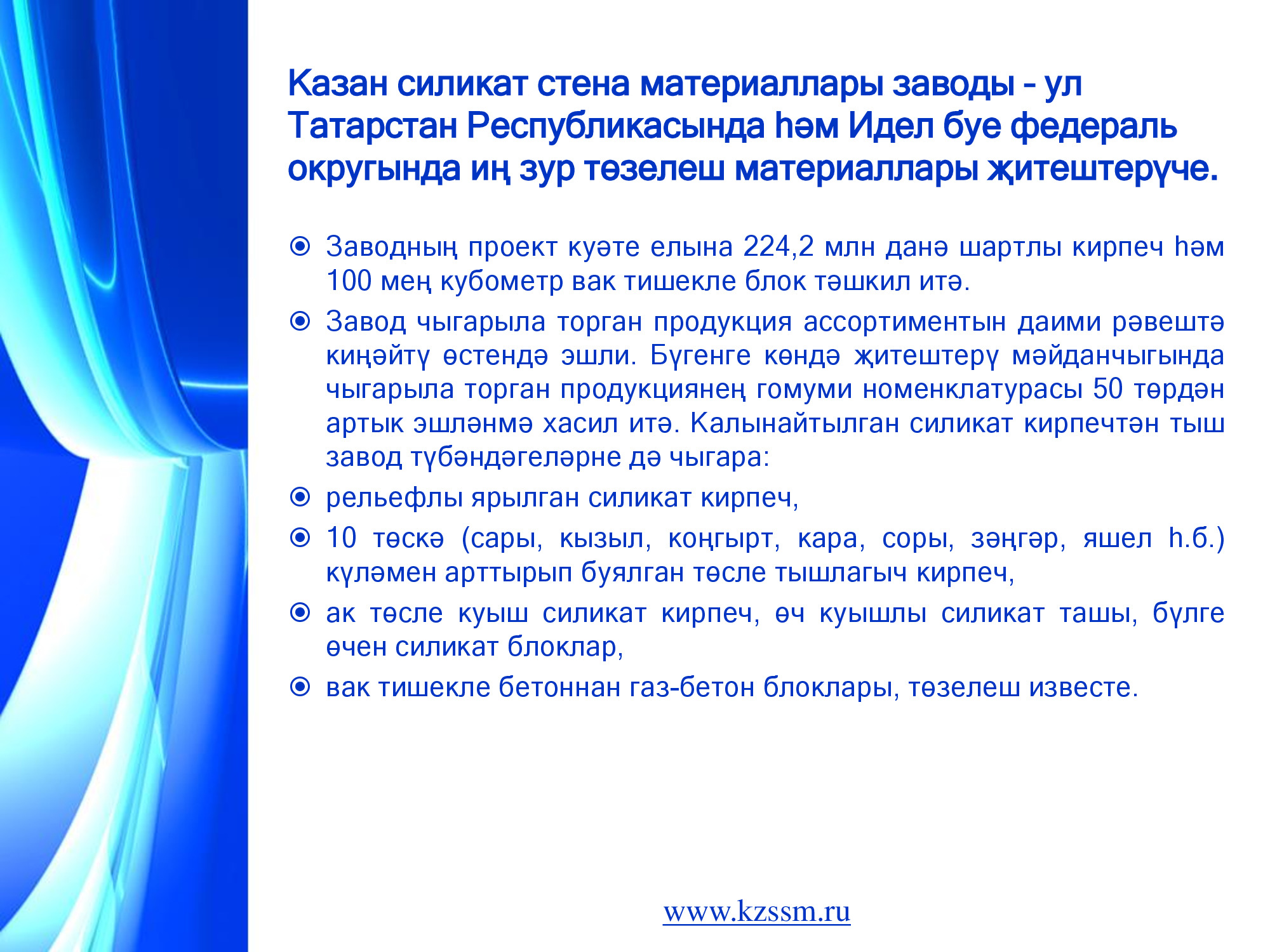 Казан силикат стена материаллары заводы – ул Татарстан Республикасында һәм Идел буе федераль округында иң зур төзелеш материаллары җитештерүче. Заводның проект куәте елына 224,2 млн данә шартлы кирпеч, күзәнәкле бетоннан 100 мең кубометр блок һәм 42 мең кубометр тимер-бетон эшләнмәләре тәшкил итә. Завод чыгарыла торган продукциянең ассортиментын даими рәвештә арттыру өстендә эшли. Бүгенге көндә өч җитештерү мәйданчыгыннан чыгарыла торган продукциянең гомуми номенклатурасы 200 төрдән артык эшләнмә хасил итә. Калынайтылган силикат кирпечтән тыш завод түбәндәгеләрне дә чыгара: 1. рельефлы ватылган силикат кирпеч, 2. 10 төскә (сары, кызыл, коңгырт, кара, соры, зәңгәр, яшел һ.б.) күләме арттырып буялган төсле тышлагыч кирпеч, 3. куышлы ак силикат кирпеч, өч куышлы силикат таш, коймалау өчен силикат блоклар, 4. күзәнәкле бетоннан газ-бетон блоклары, төзелеш известе, 5. төрле ассортиментта ТБЭ: алдан ныгытылган тимер-бетон койма плитәләре, фундамент блоклары, баскыч басмалары һ.б.