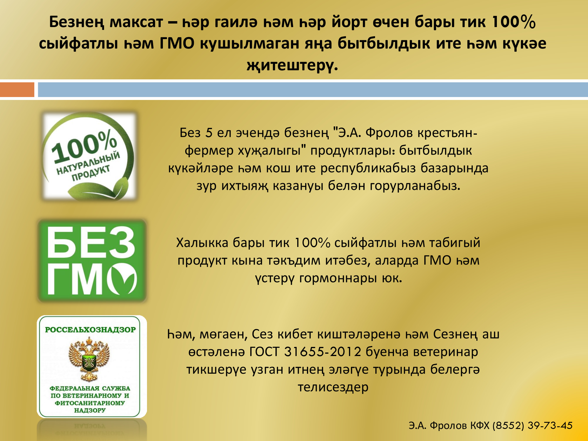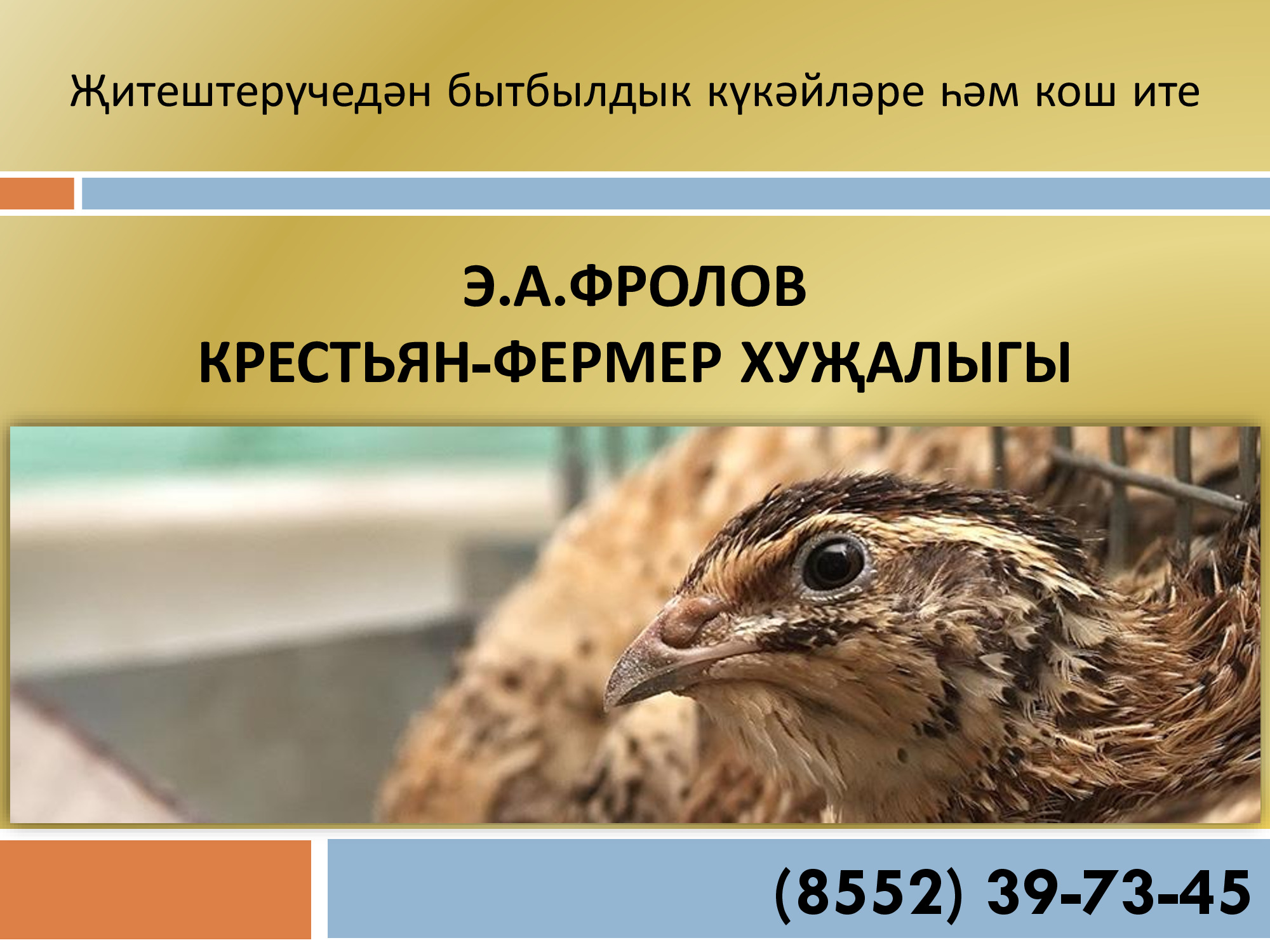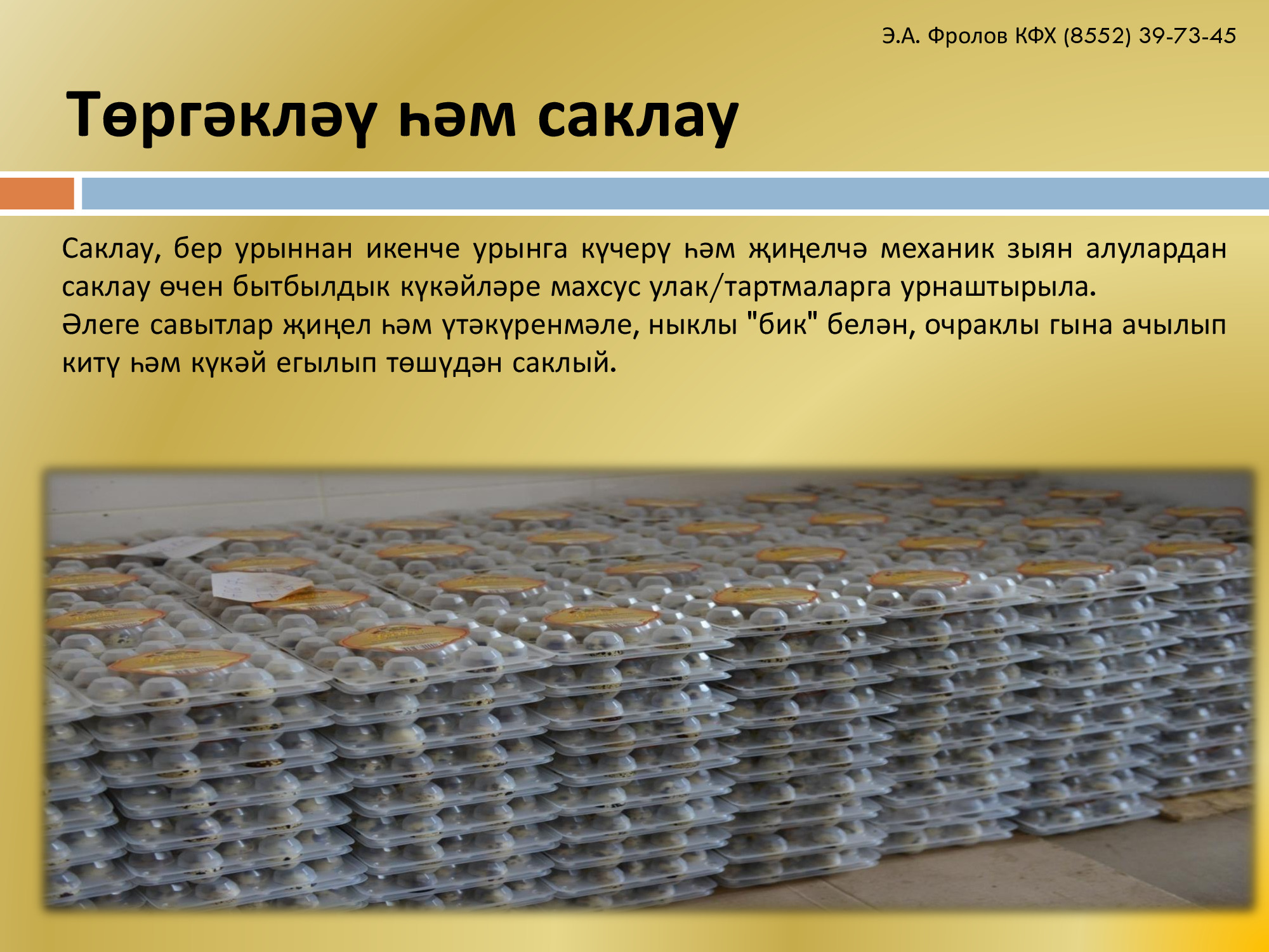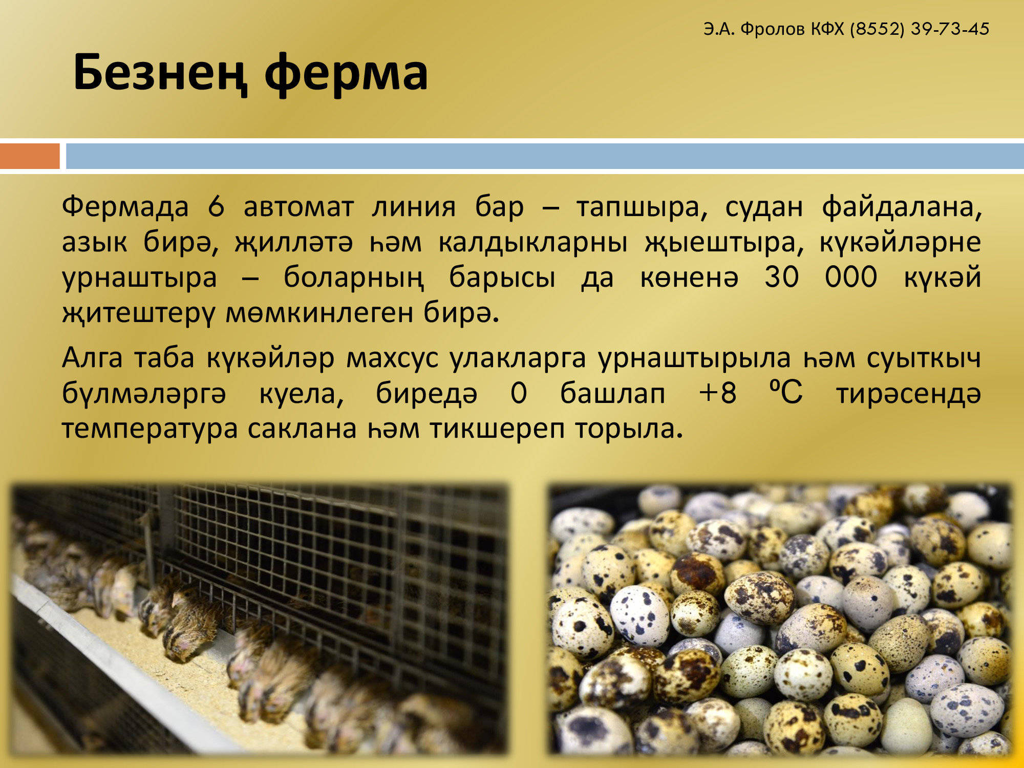 Э.А.Фролов крестьян-фермер хуҗалыгы сыйфатлы бытбылдык күкәйләрен күмәртәләп китертүдә мәнфәгатьле булган эре кибетләрне һәм туклану продуктлары җитештерүчеләрне хезмәттәшлек итәргә чакыра. Без күкәйләрне инкубаторга салудан башлап үзебезнең фабрикада баланслы азык әзерләү өлешенә кадәр барлык процессларны гарантиялибез. Шул рәвешле, технологик операцияләрне һәм алып барылган эшләрне җитди тикшерүдә тоту бытбылдык күкәйләрен җитештерүнең барча этапларында тәэмин ителә. Безнең белән хезмәттәшлек итүнең өстенлекләре: • Продукциянең ГОСТ 31655-2012 таләпләренә җавап бирә торган иң яхшы сыйфаты; • Зур күләмдә товарларга (бездәге җитештерү линияләреннән көн саен 30 меңнән артык күкәйгә) заказ бирү мөмкинлеге; • Бытбылдык күкәйләренең оптималь бәясе һәм турыдан-туры китертүләр. Бытбылдык күкәйләре тавыкныкы белән чагыштырганда күбрәк өстенлекләргә ия. Алар арасында иң әһәмиятлесе – аллергия бирмәве, составында файдалы микроэлементлар һәм туклыклы матдәләр күп, холестерин бөтенләй юк, сальмонелла йоктыру мөмкинлеге юк. Бытбылдык күкәйләрен күмәртәләп китертү әлеге продукцияне ваклап сату планлаштырыла торган эре һәм урта сәүдә компанияләре өчен актуаль булачак. Моннан тыш, азык-төлек сәнәгатендә эшләүче һәм үз продукциясен әзерләгәндә бытбылдык күкәйләреннән файдаланучы компанияләр өчен дә әлеге тәкъдим кызыклы булырга мөмкин.