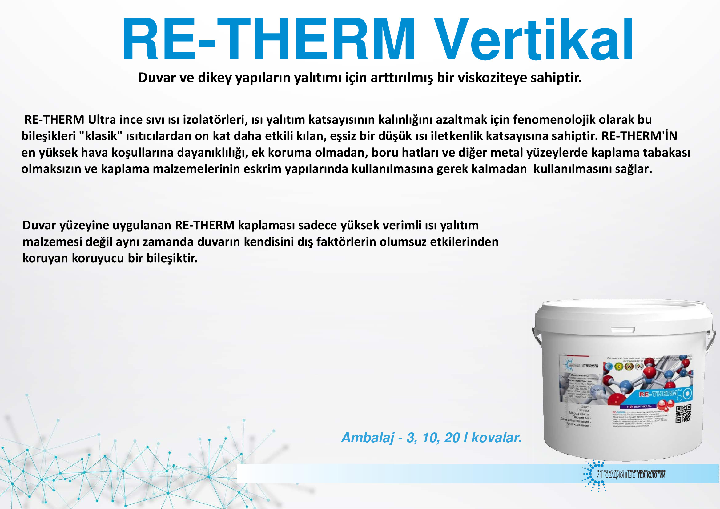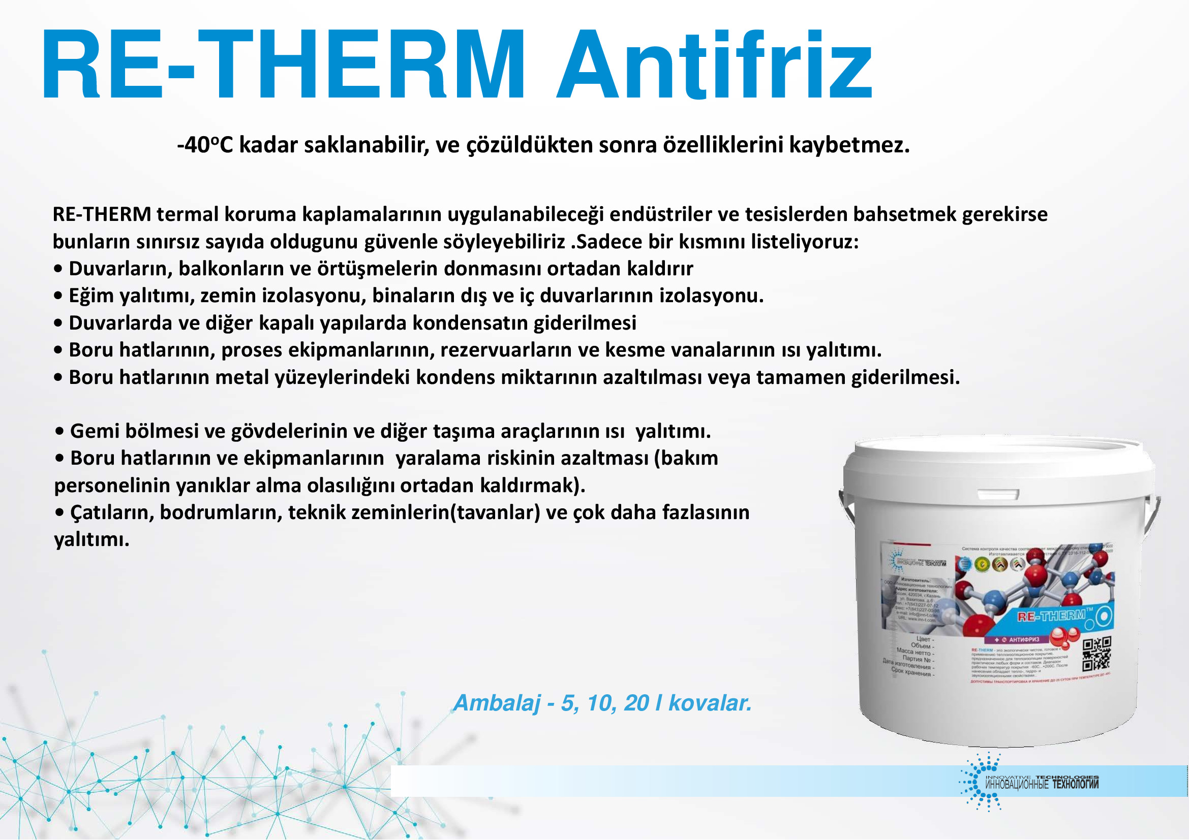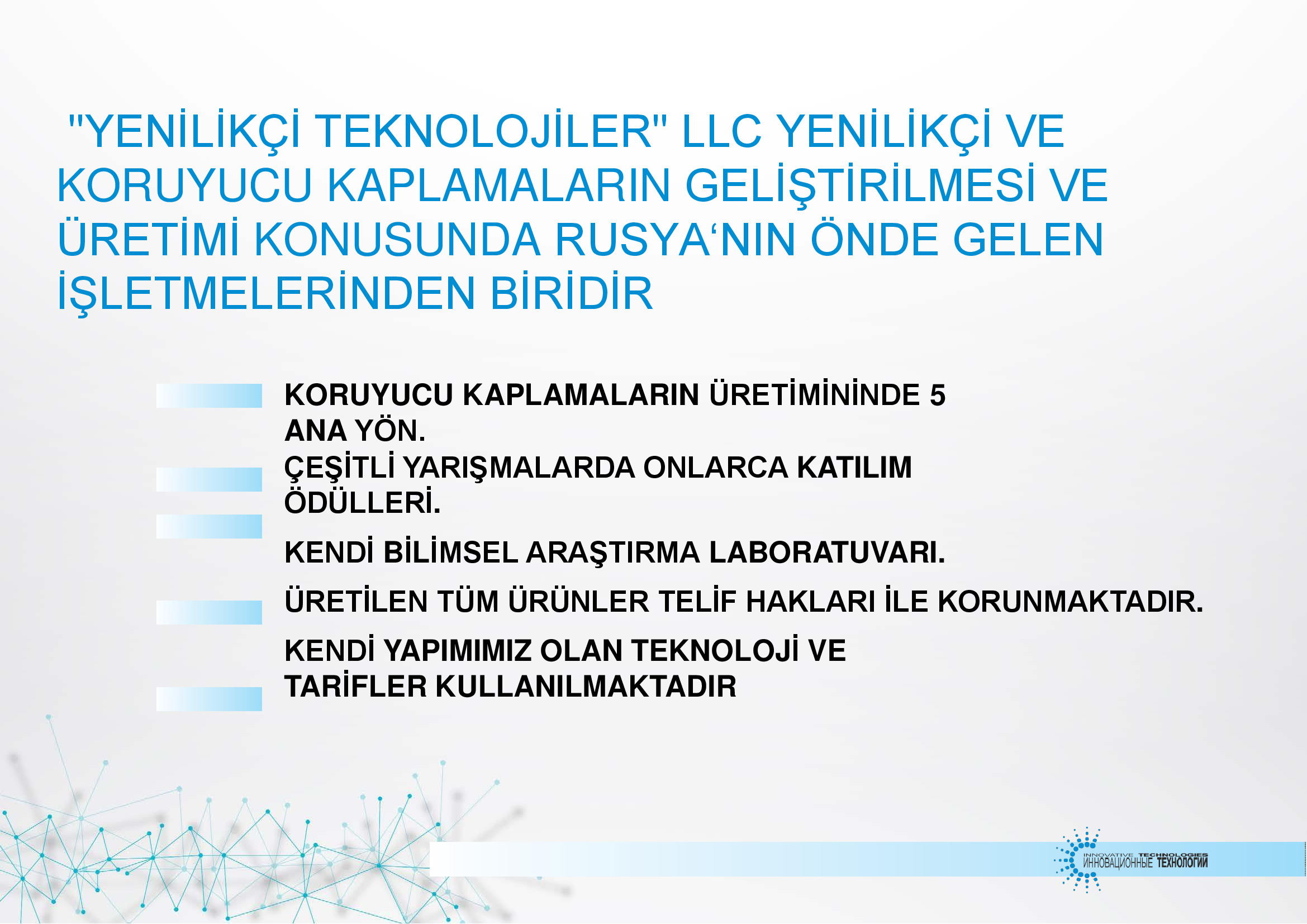 ‘Yenilikçi Teknolojiler’ Ltd. Şirketi yapıların korunması ve insanın rahatlığı ve güvenliğinin sağlanması alanında inşaatta ve endüstrisinde ileri teknoloji malzeme ve çözümleri geliştirme, üretim ve uygulamaya alma faaliyetlerini göstermektedir. Kaplamaların yerine getirdiği temel görevleri ise ısı tasarrufu, su yalıtımı, mekanik ve kimyasal etkilerden yüzeylerin korunması, yangından korunma, tesis içindeki mikro iklimin iyileştirilmesidir. Üretilen tüm ürünler kolay kullanımlı, birbirleriyle uyumludur ve birbirleriyle kombinasyon halinde iken yapılar için etkili bir koruma sistemi oluştururlar. Kendi laboratuvarımızın varlığı, yeni malzeme ve kaplama çeşitlerini geliştirmemize ve araştırmamıza olanak sağlamaktadır. Çalışmada Kimya endüstrisindeki dünya liderlerinin hammadde bileşenleri kullanılmakta, gelen hammaddelerin ve bitmiş ürünlerin sıkı kontrolü yapılmaktadır ve bu nedenle üretilen ürünlerin kalitesi her zaman mükemmeldir.