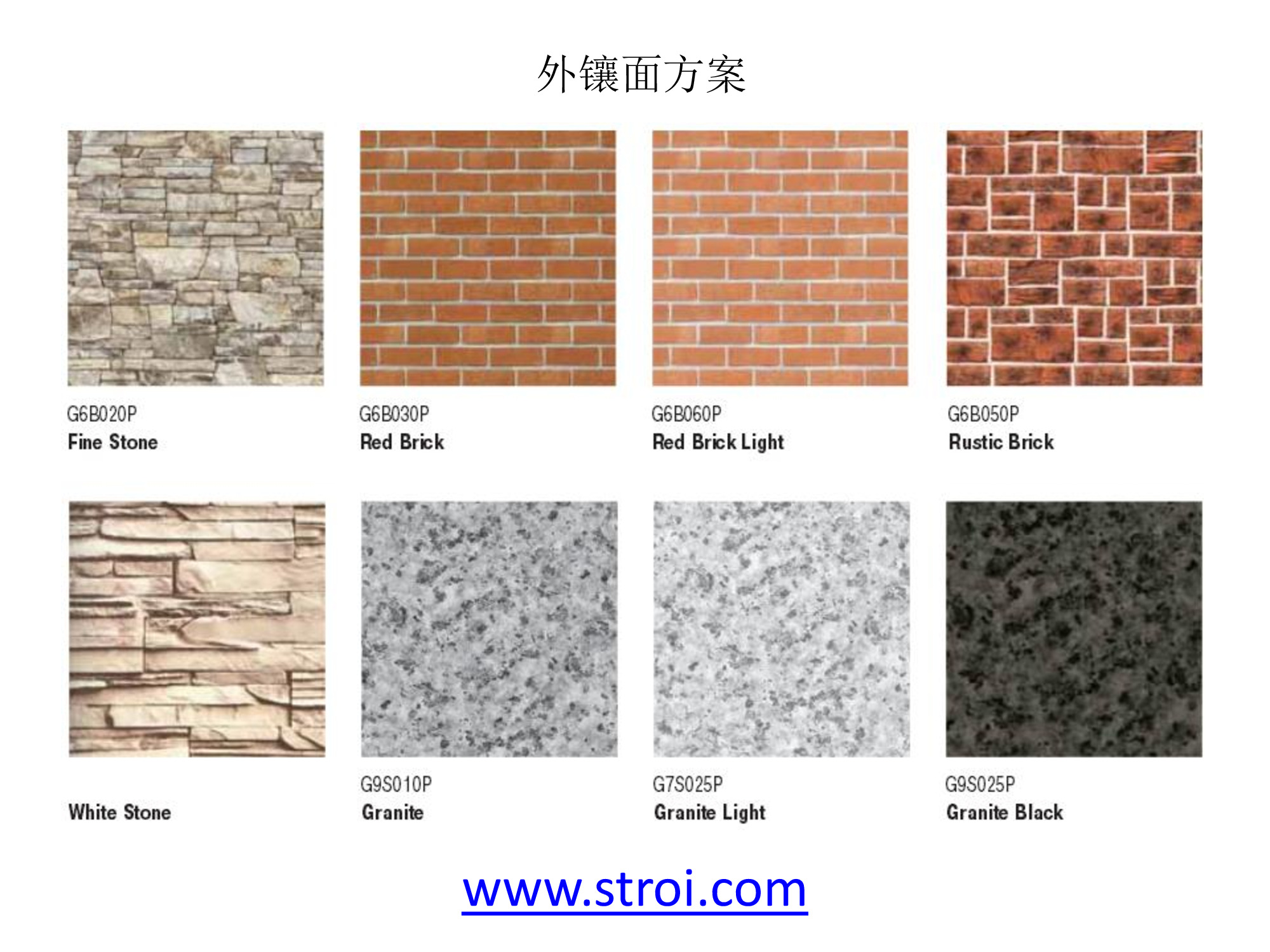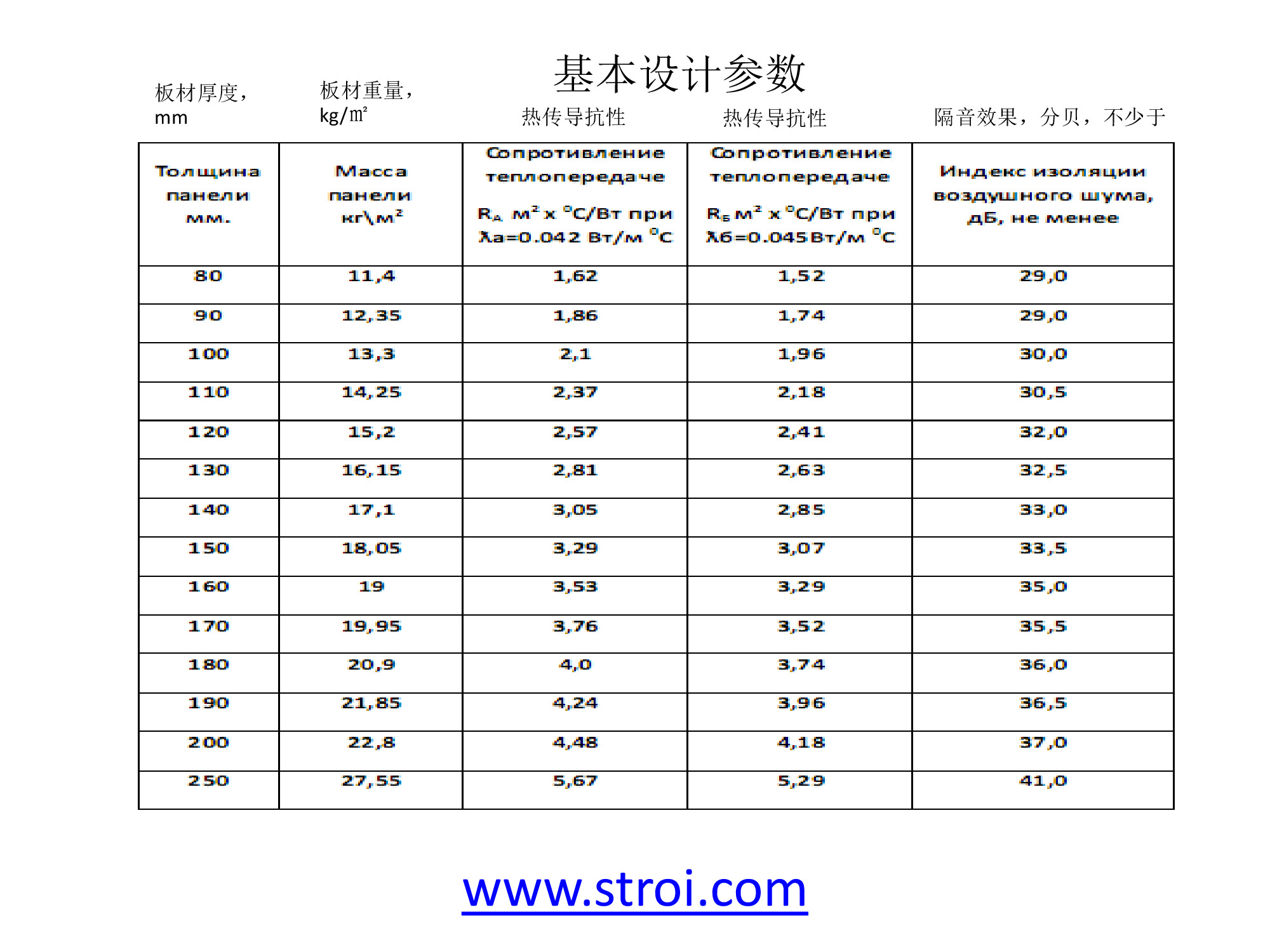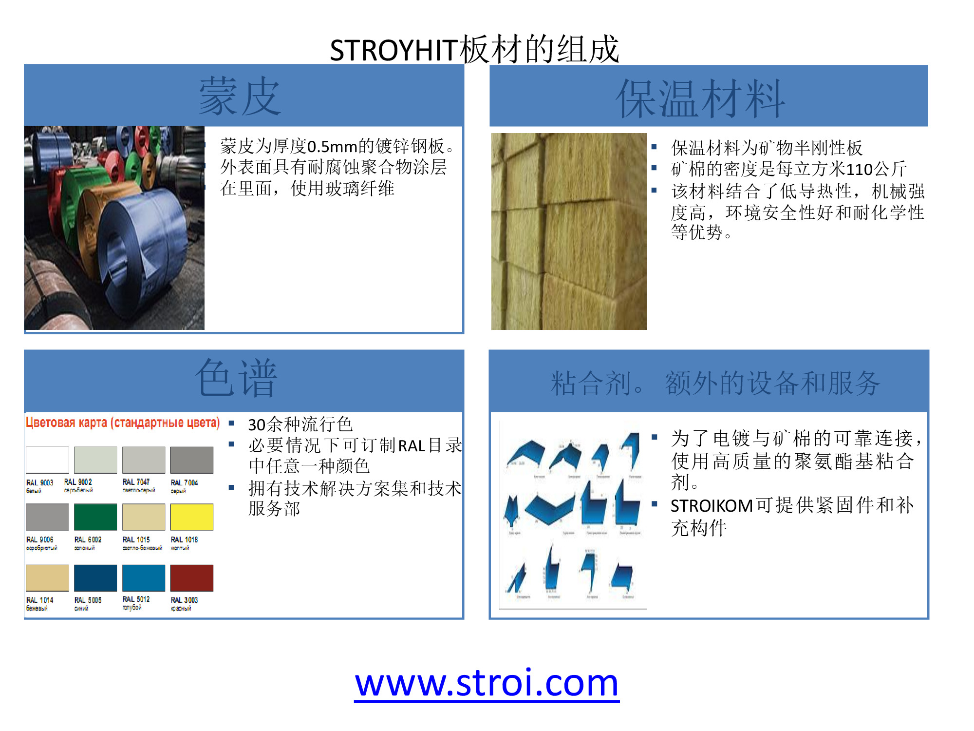 OOO(Russia) Stroicom制造3层夹芯屋顶板和墙板。产品安装参数:50至250毫米(厚度),1000至1200毫米(长度),1200毫米(宽度)。2014年引进了新的生产线,墙板产品长度1000至1190毫米,屋顶板宽度1000毫米,带5道梯形波纹。如今Stroicom生产保温板,其形式为发泡聚苯乙烯(泡沫板),还制造绝热阻燃块,其材料为玄武岩矿棉。